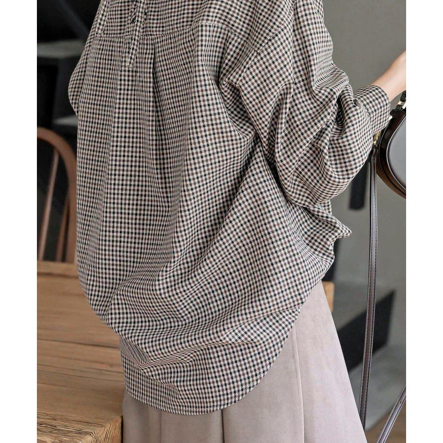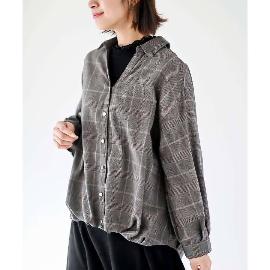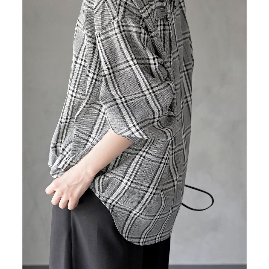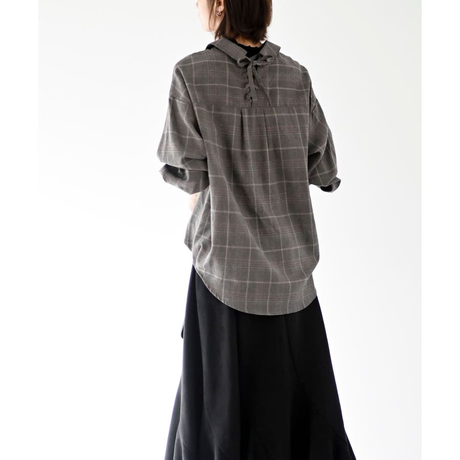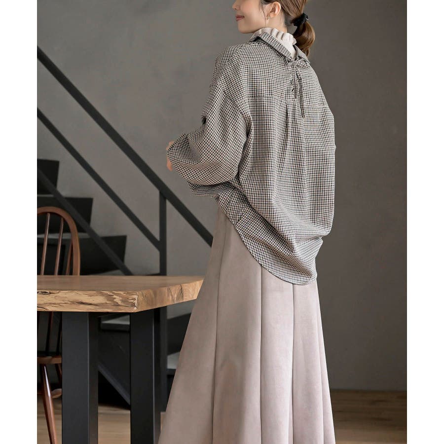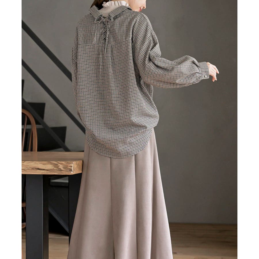 BACKレースアップ裾タックチェックブラウス