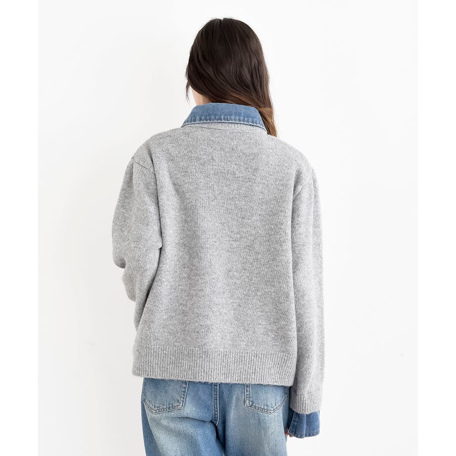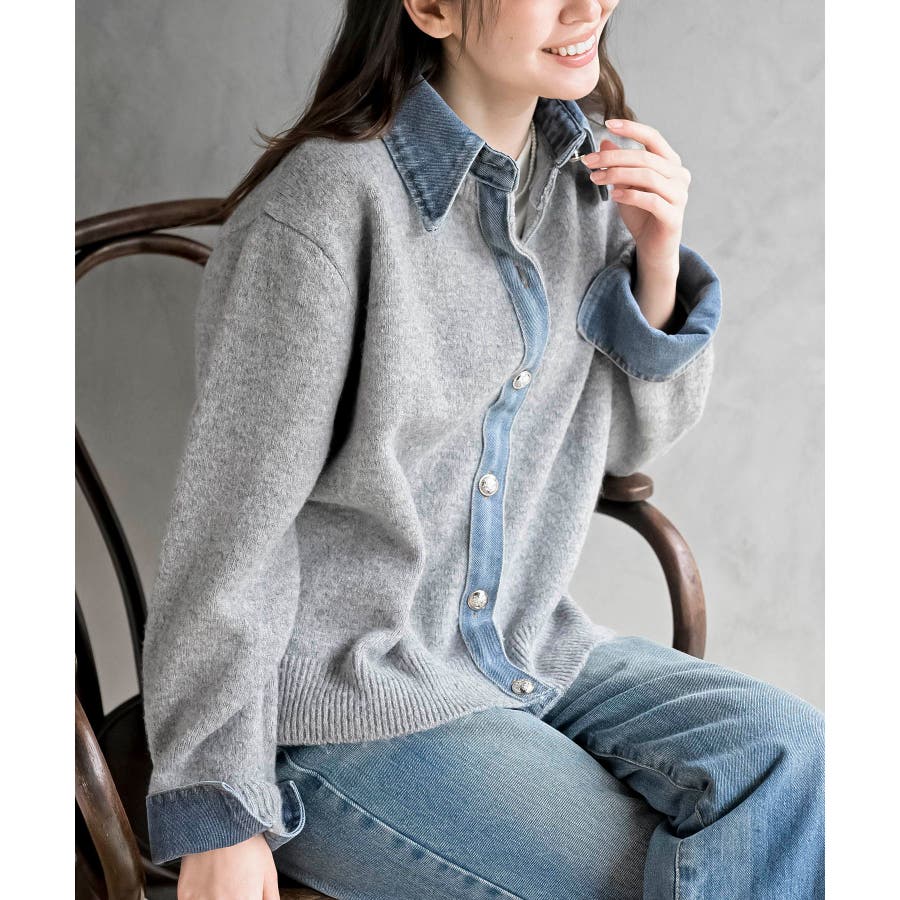デニム切替レイヤード風ニットカーディガン