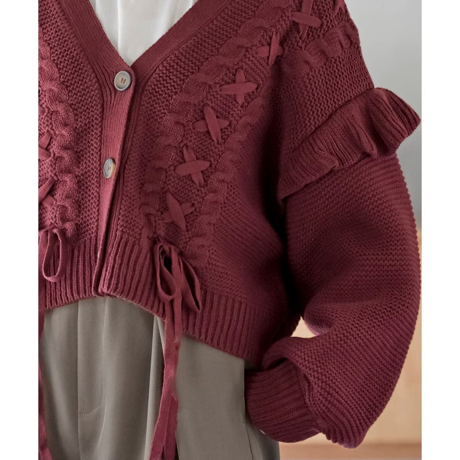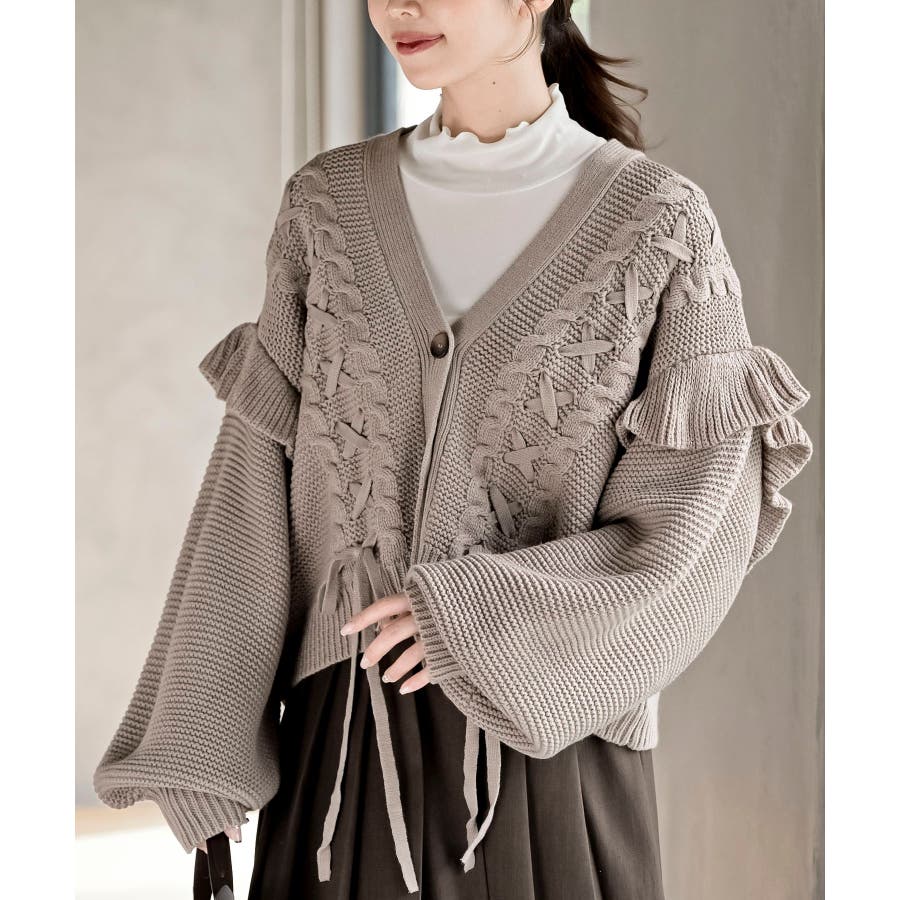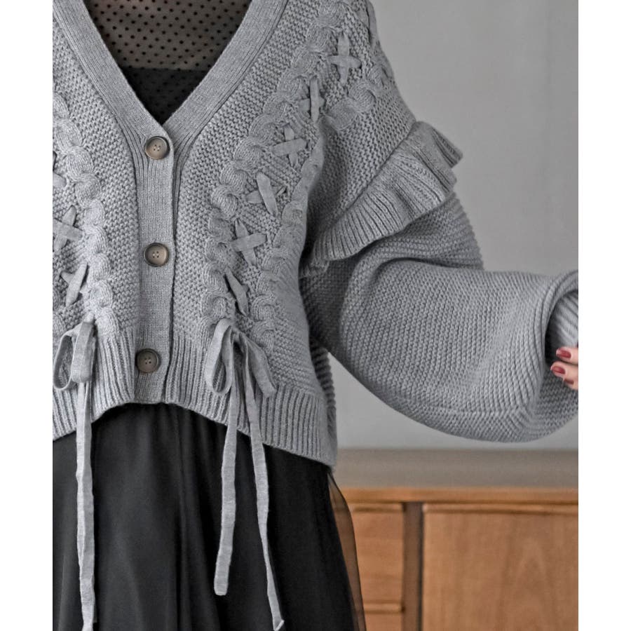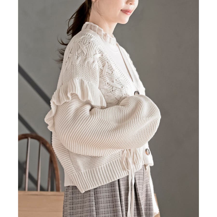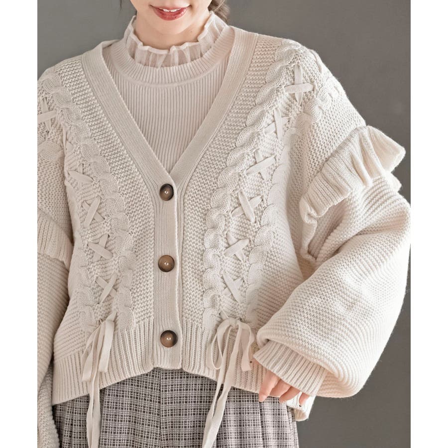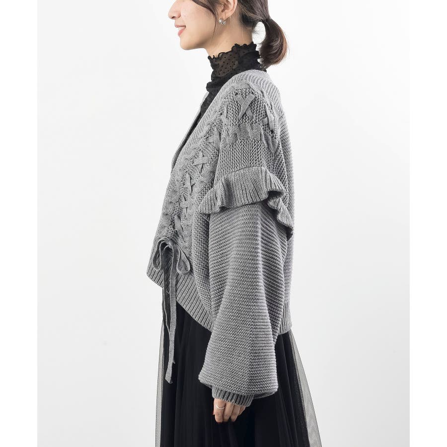 サイドレースアップケーブルフリルニットカーディガン