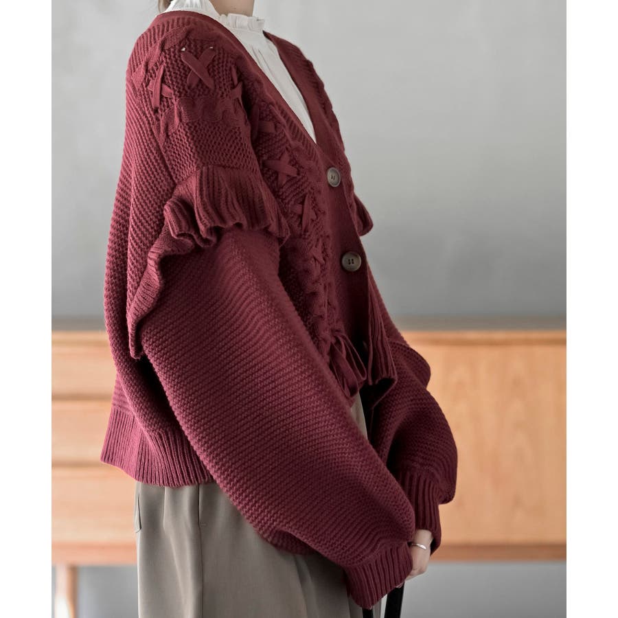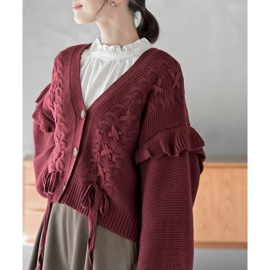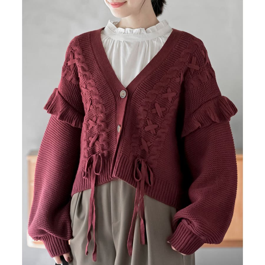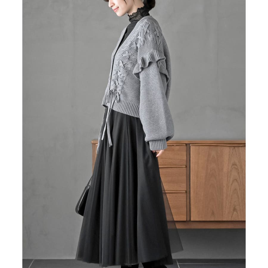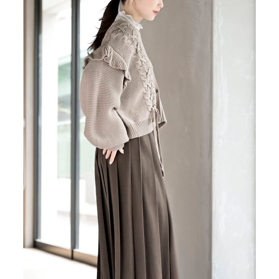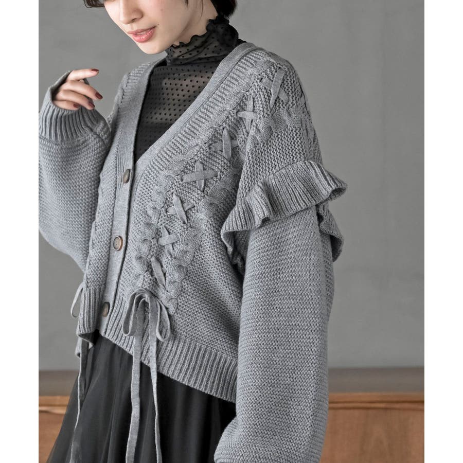 サイドレースアップケーブルフリルニットカーディガン