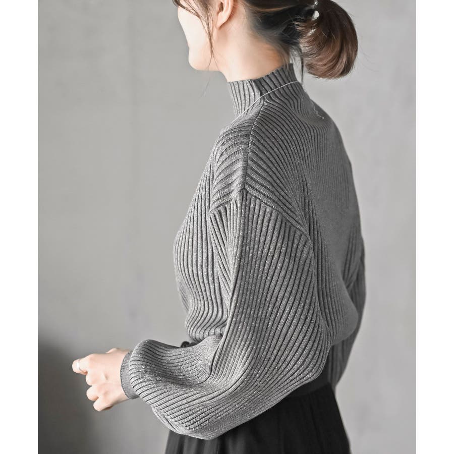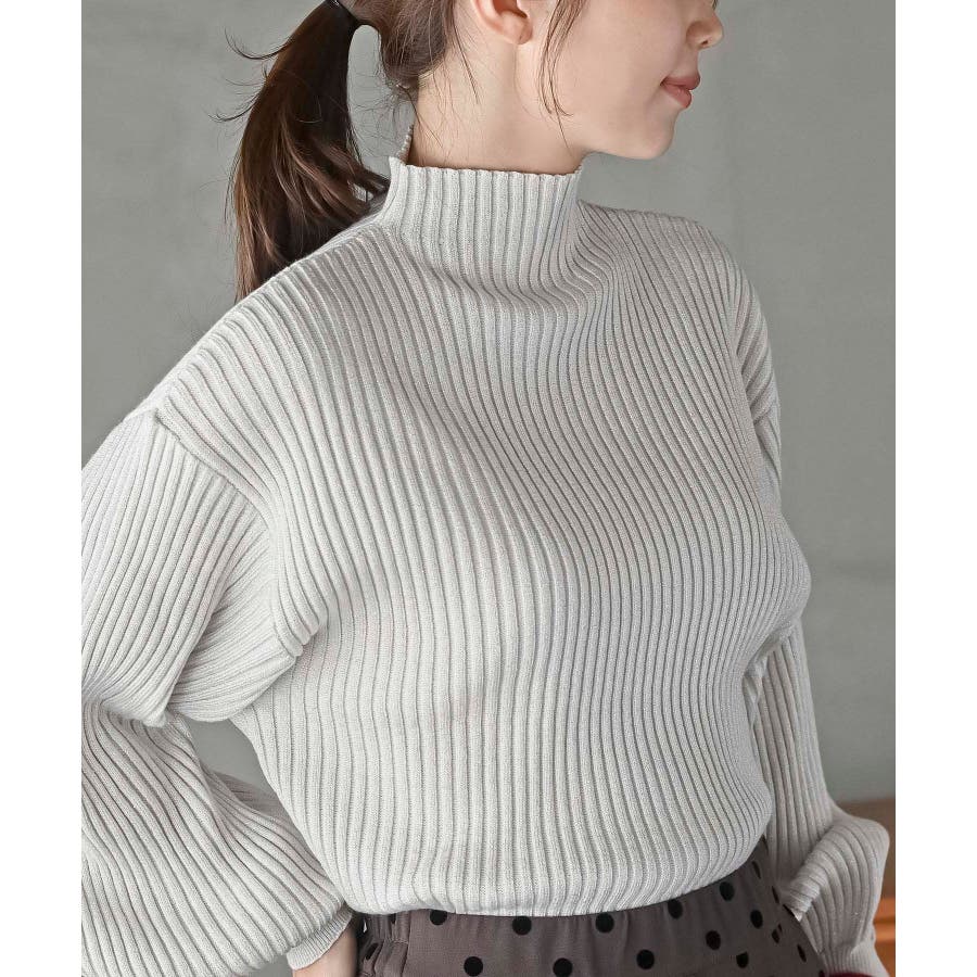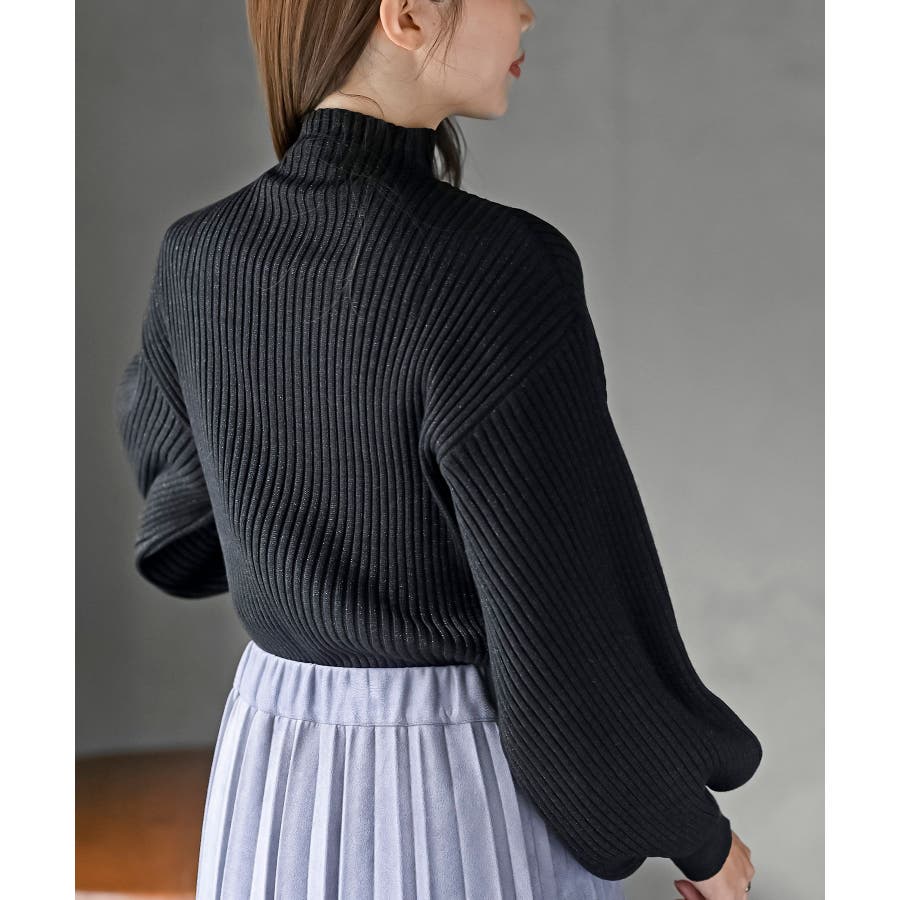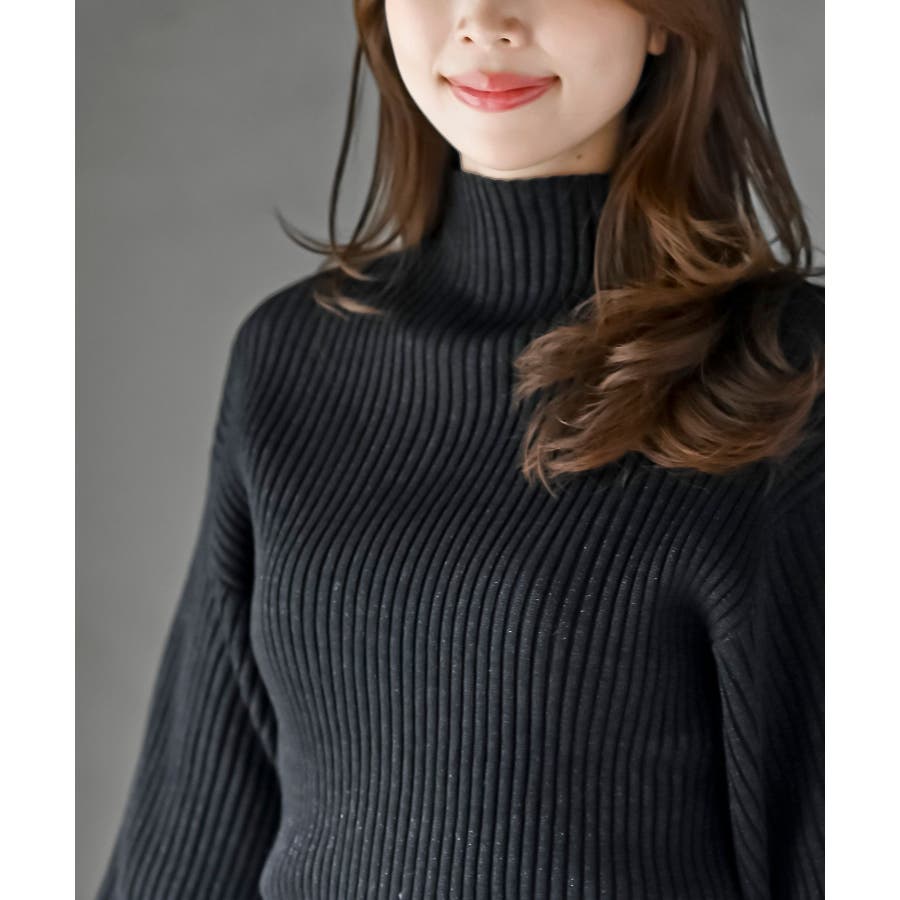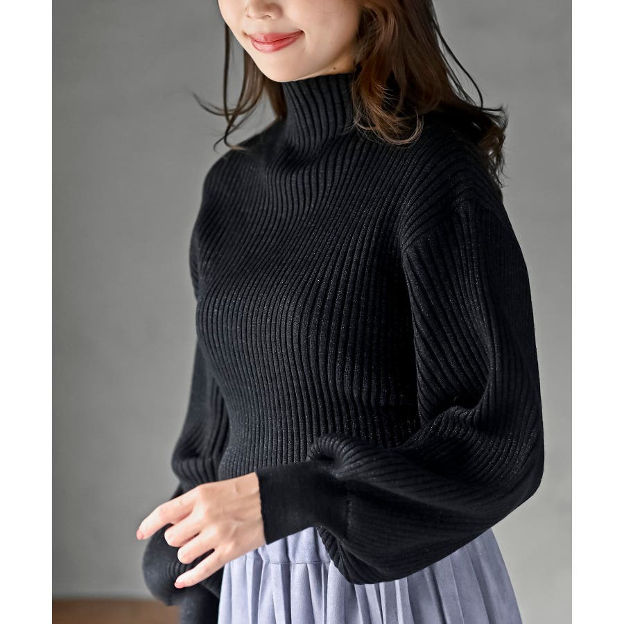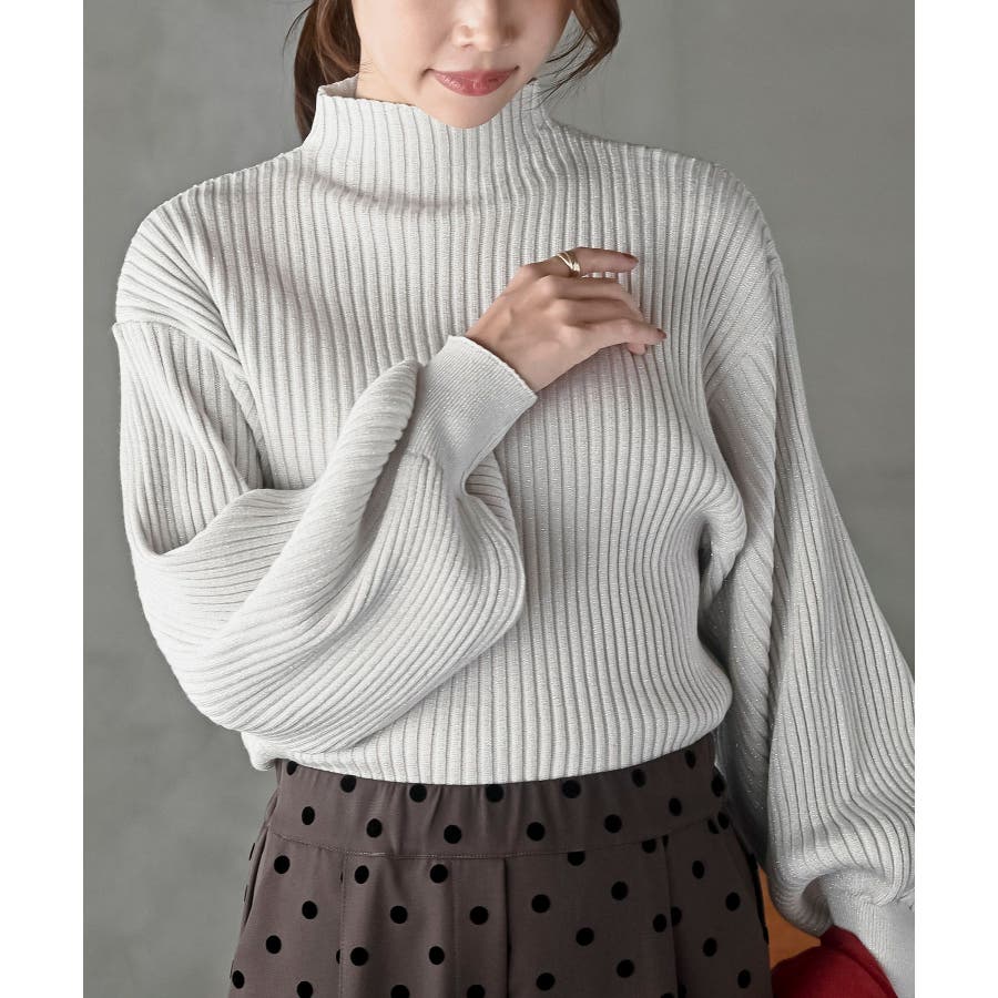 ボリューム袖ボトルネックラメリブニットプルオーバー