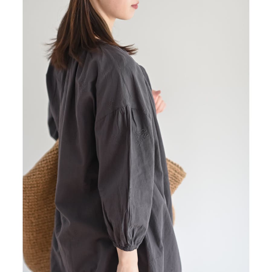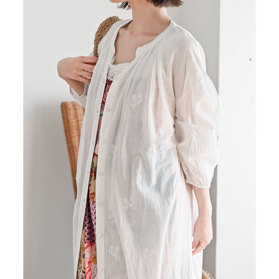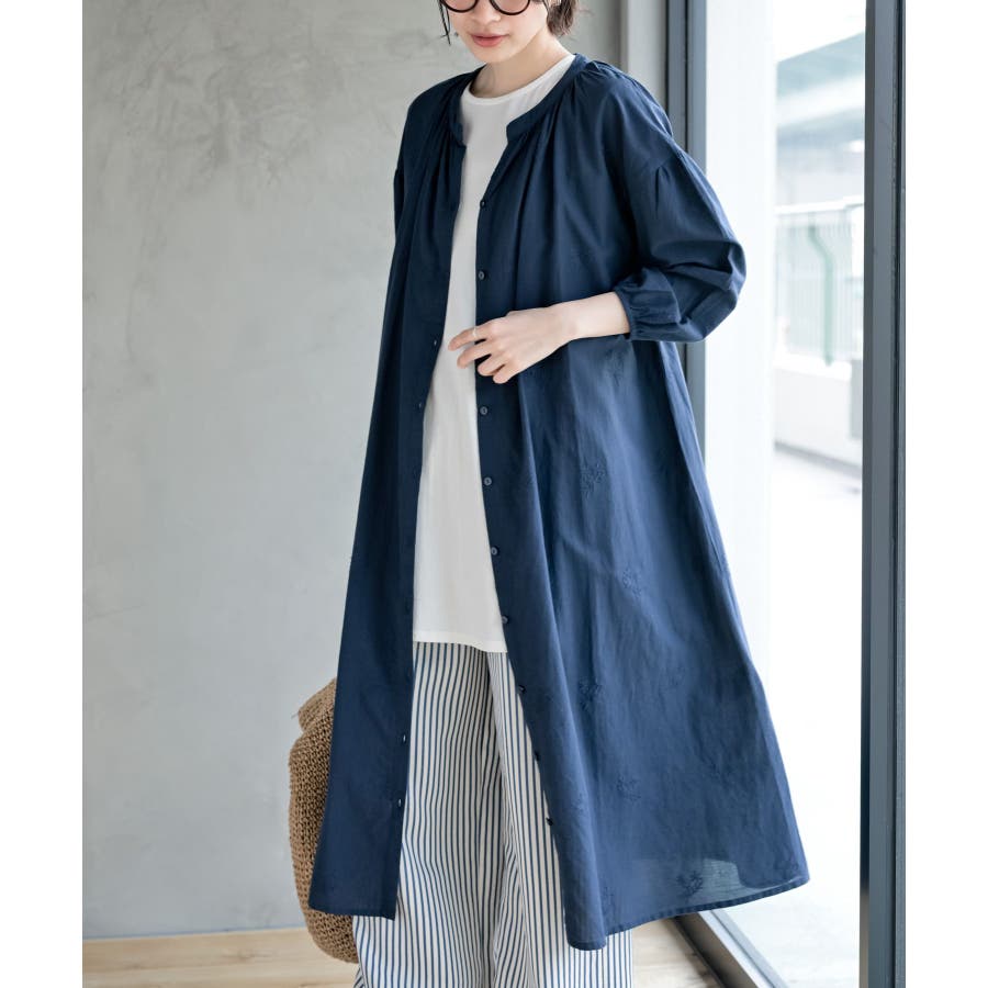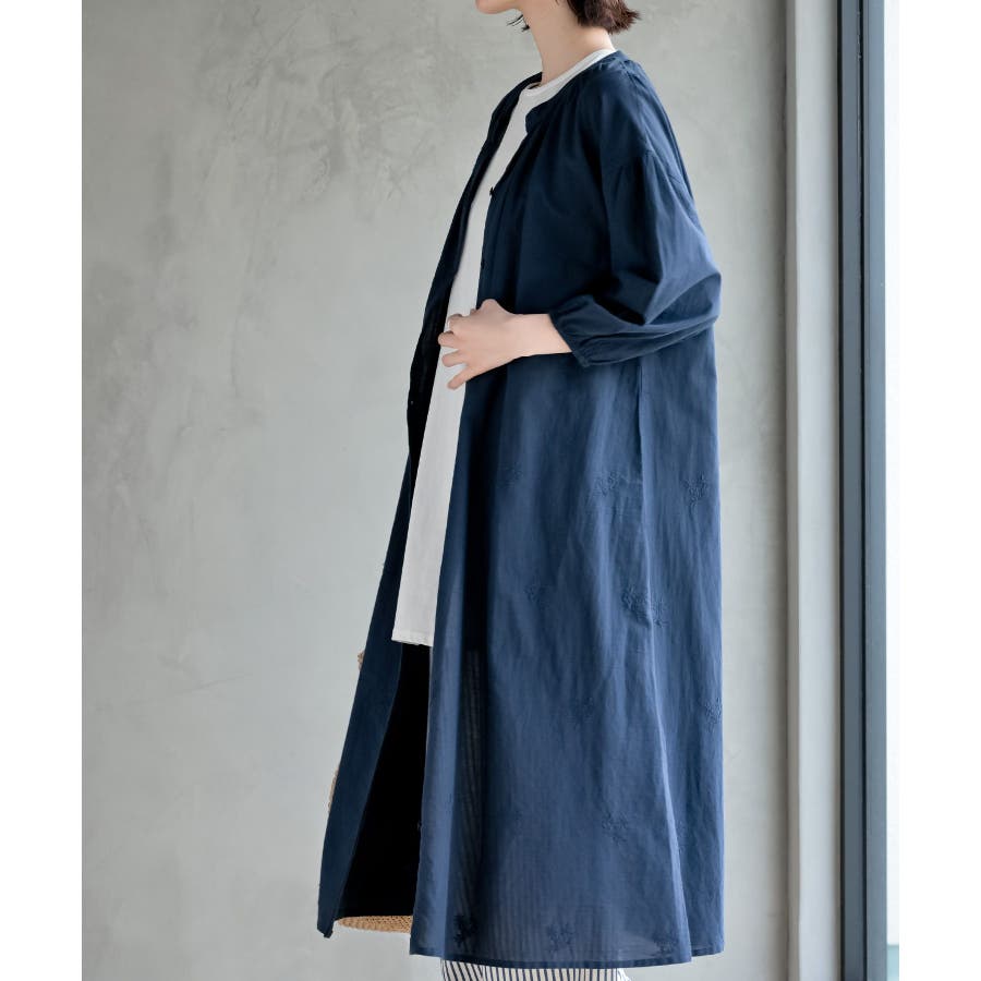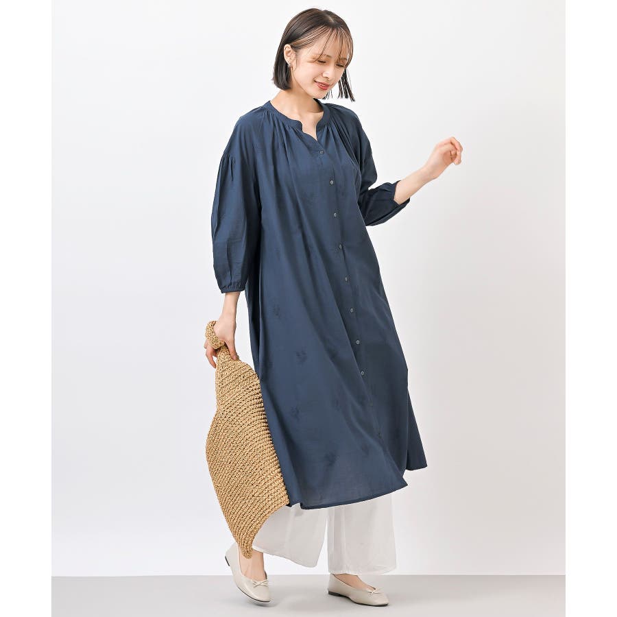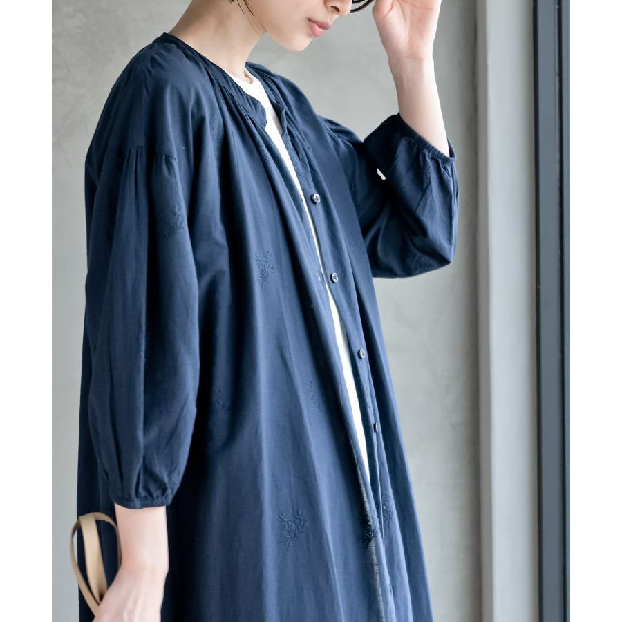 総刺繍バンドカラー9分袖シャツワンピース