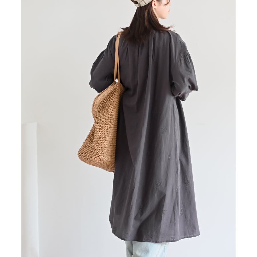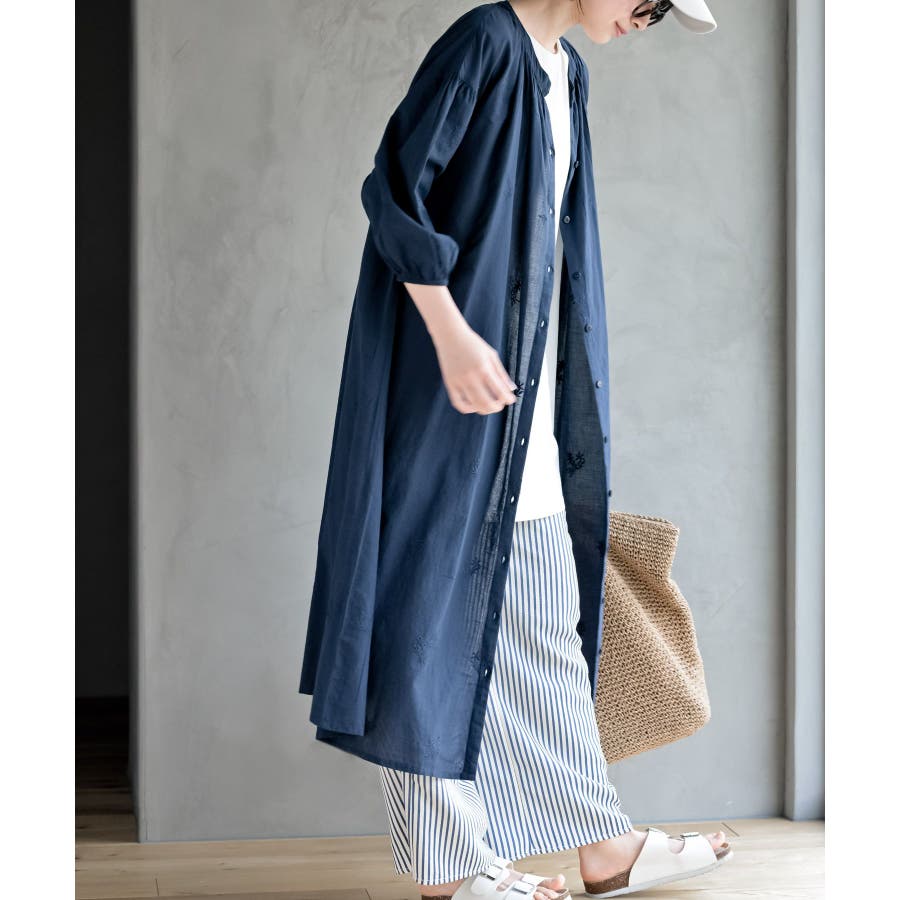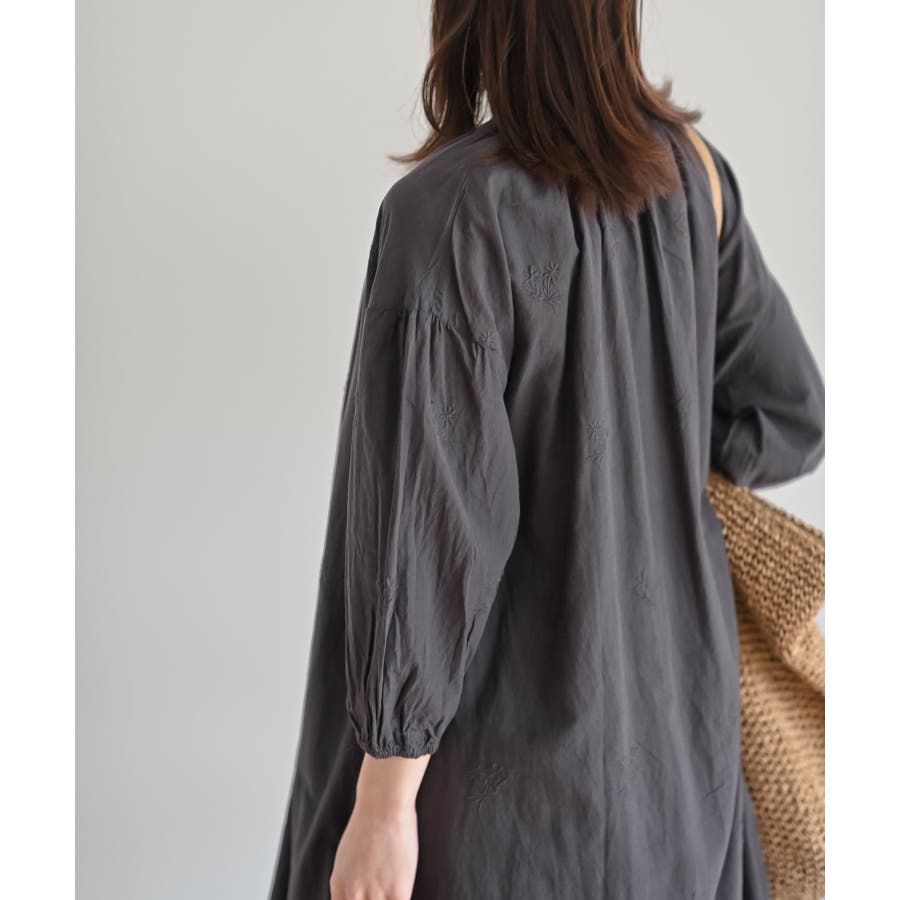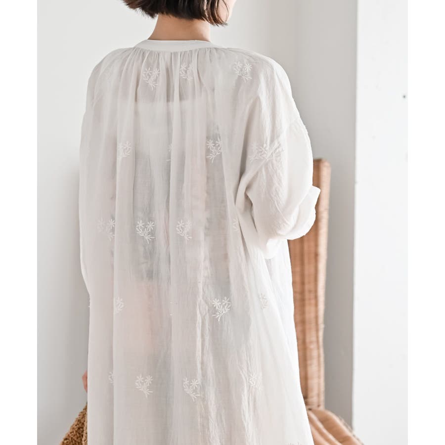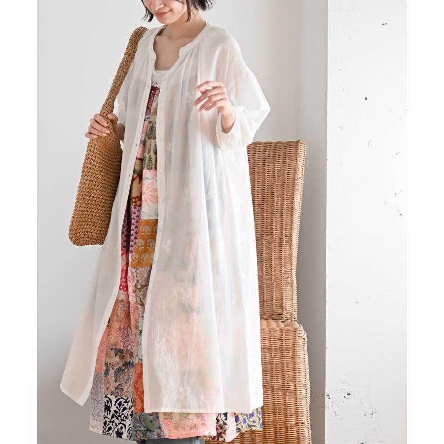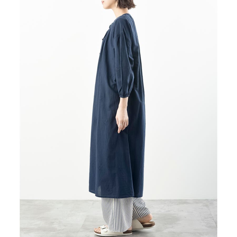 総刺繍バンドカラー9分袖シャツワンピース