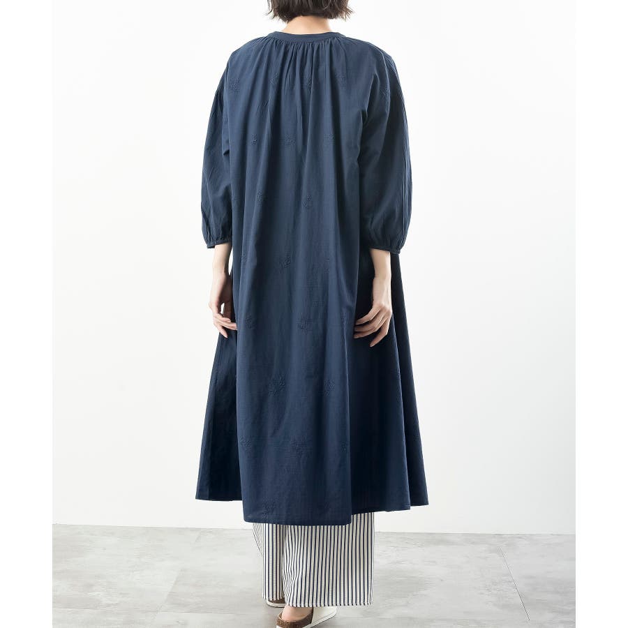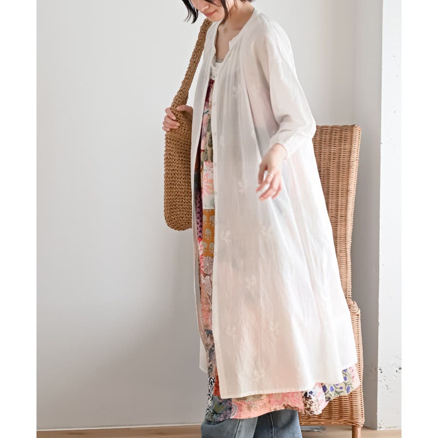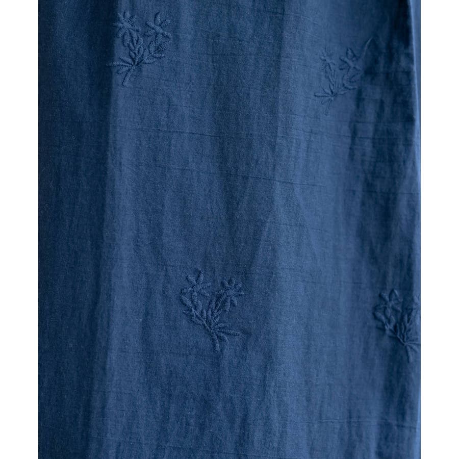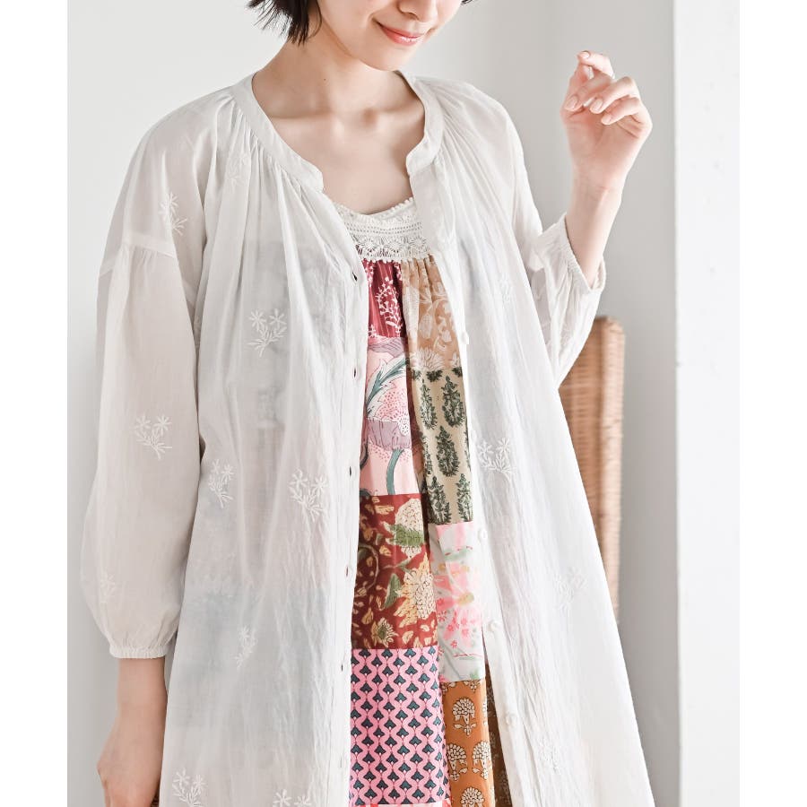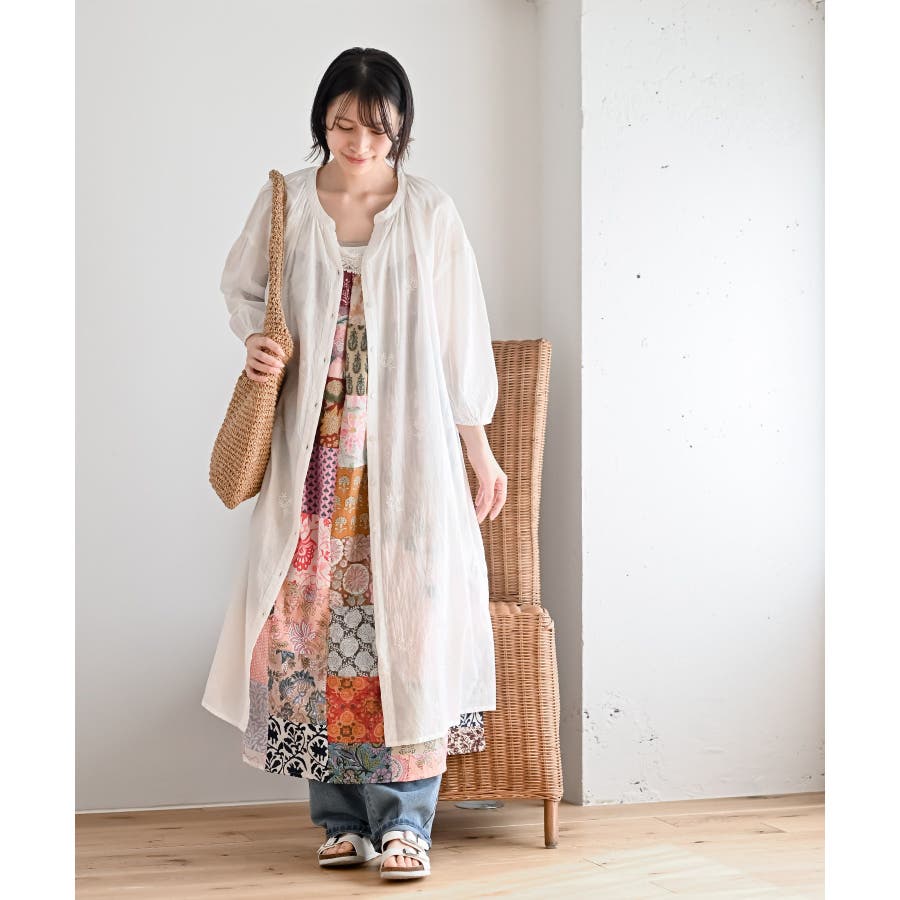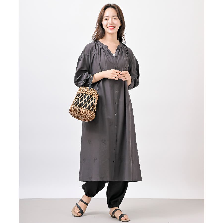総刺繍バンドカラー9分袖シャツワンピース