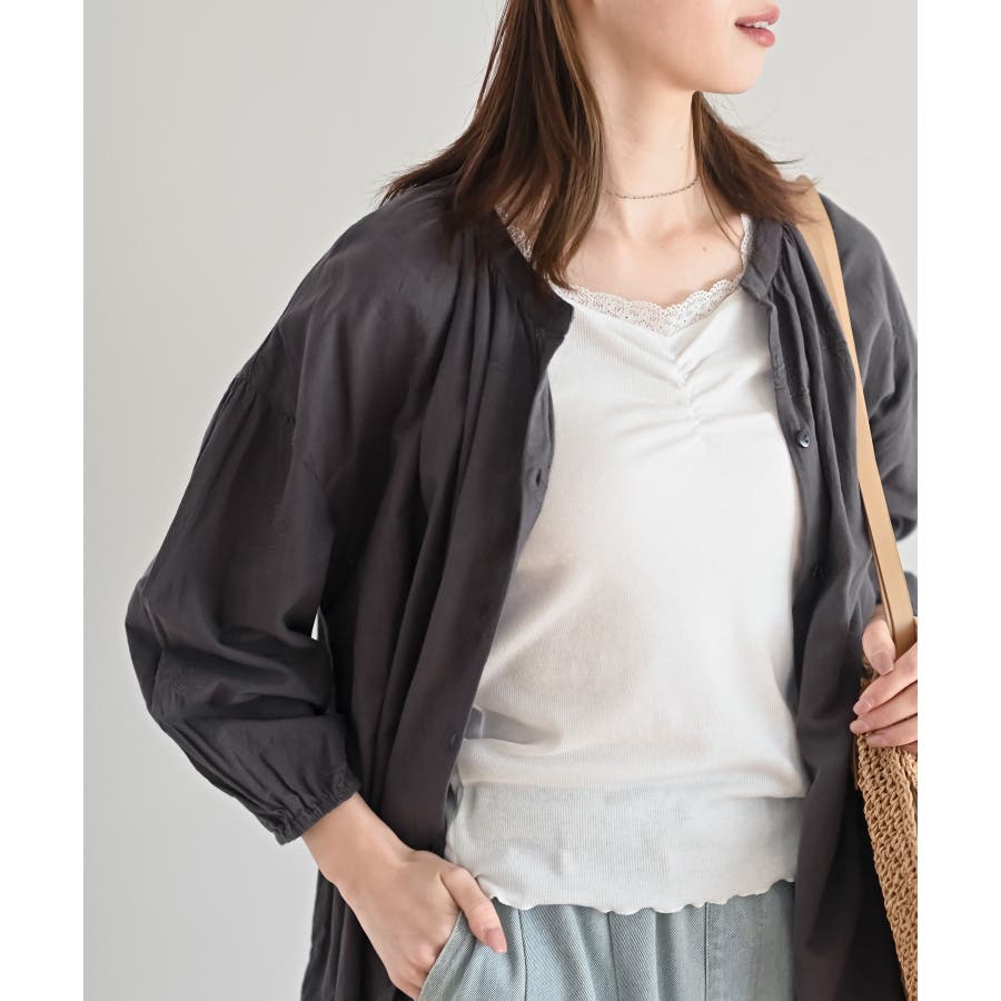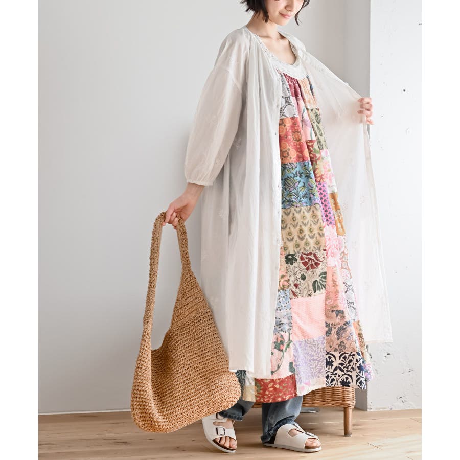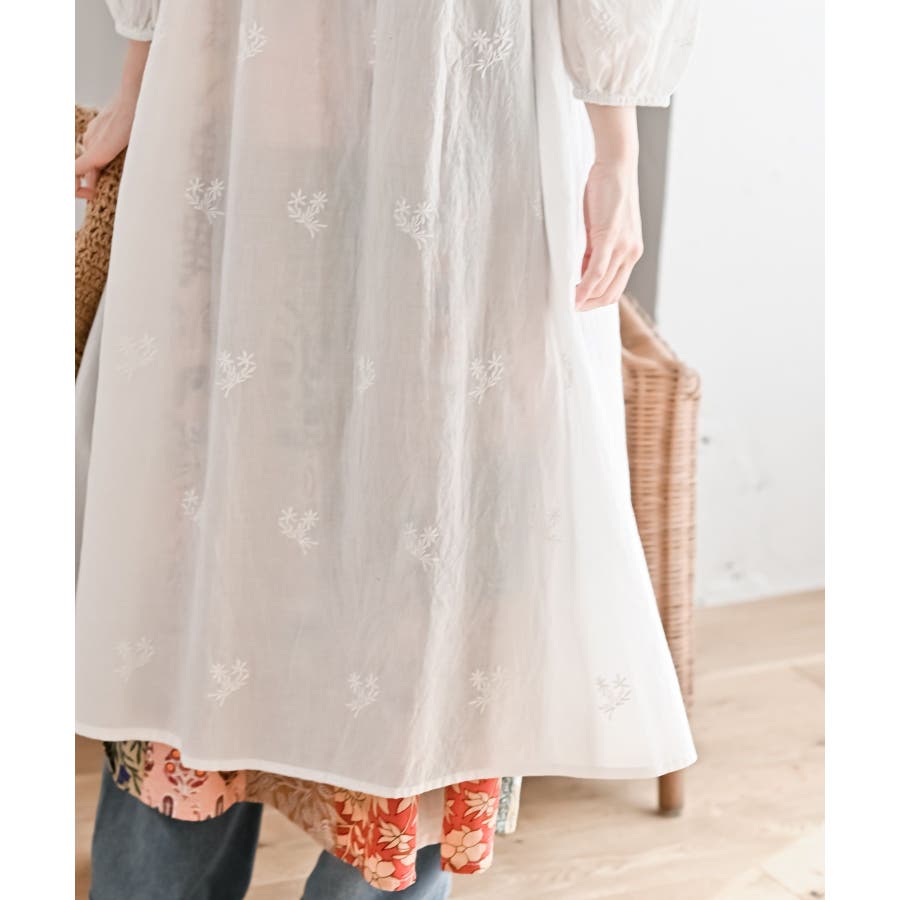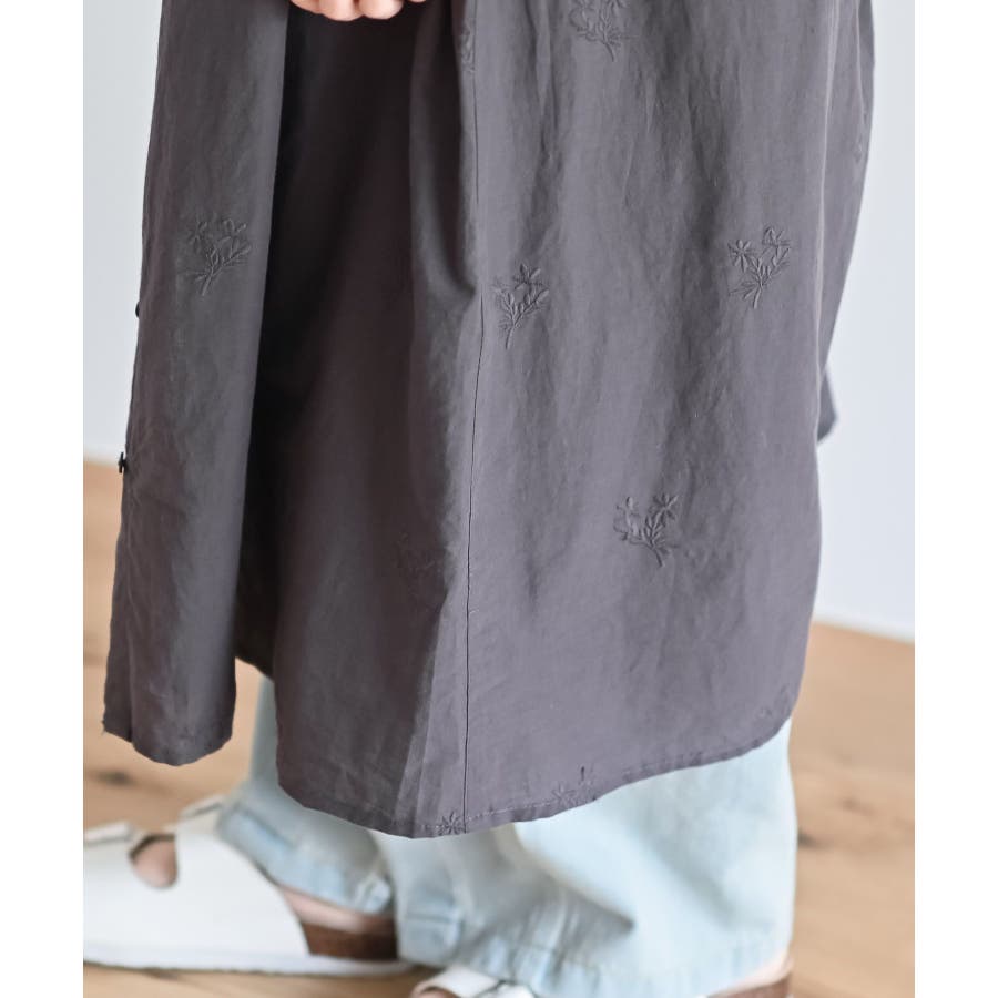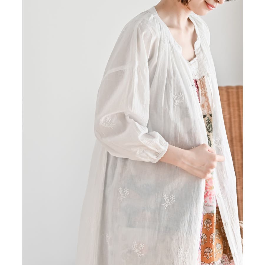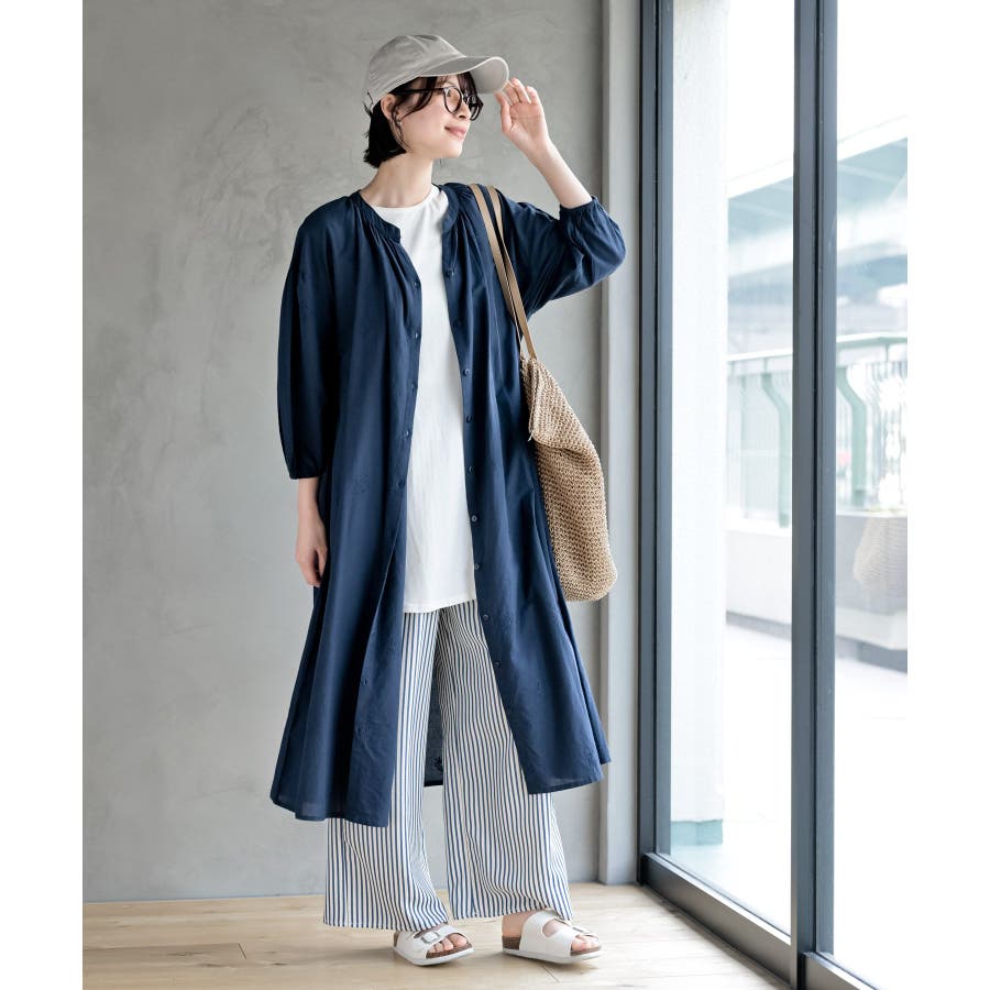 総刺繍バンドカラー9分袖シャツワンピース