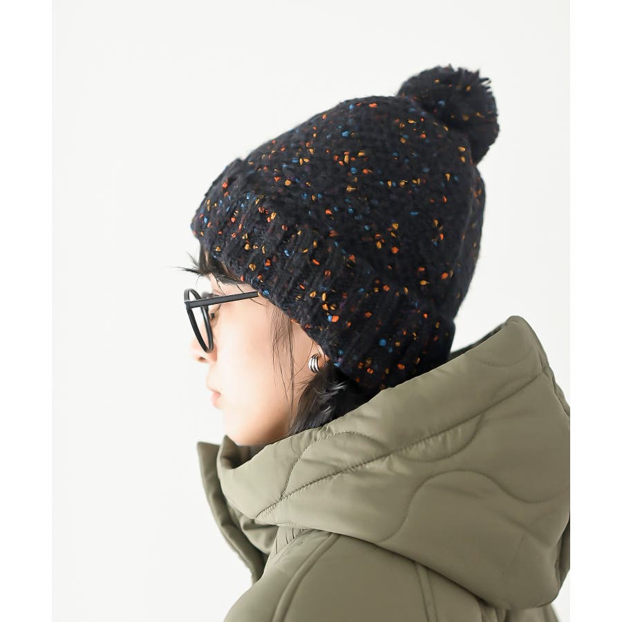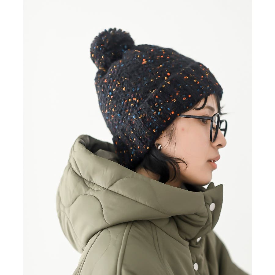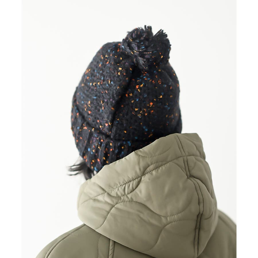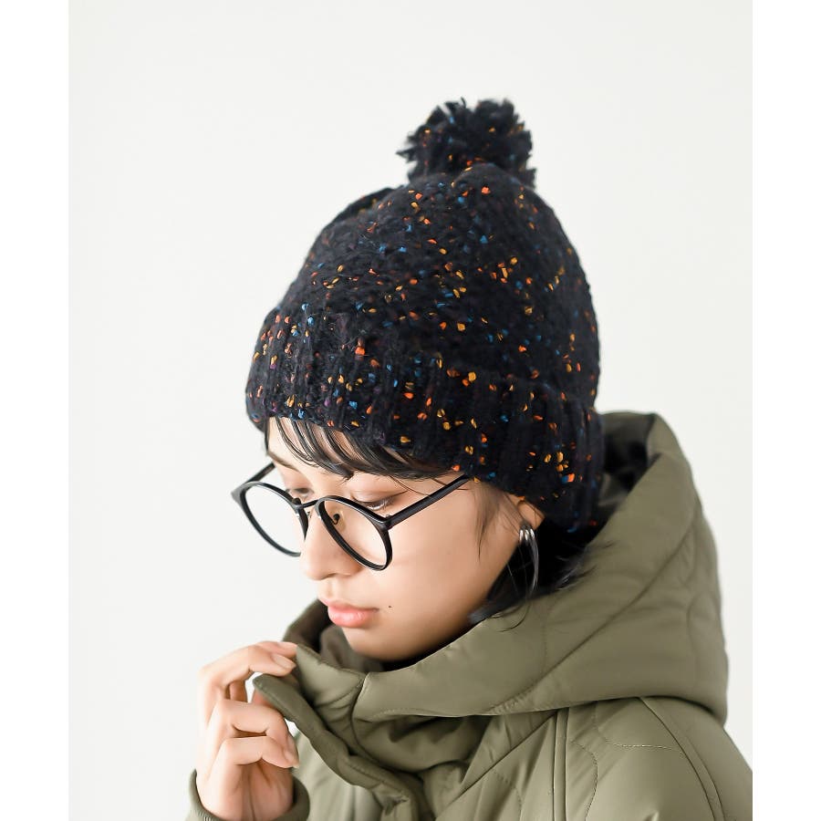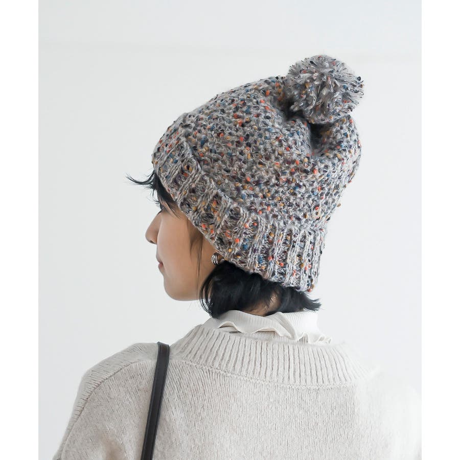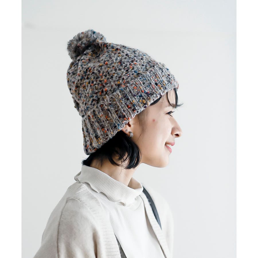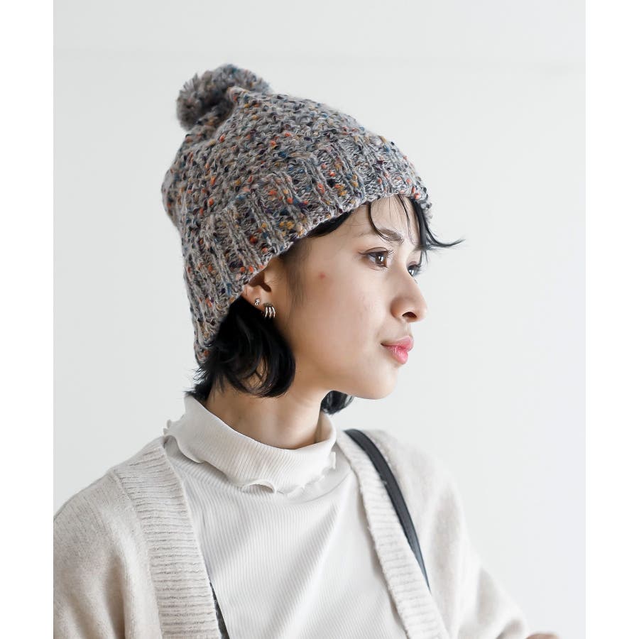 ポンポン付きカラーネップニット帽