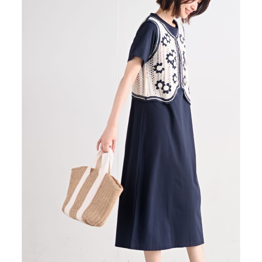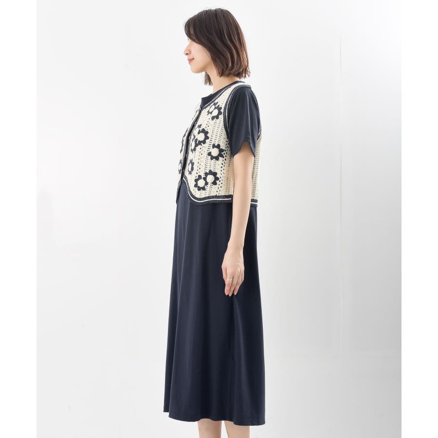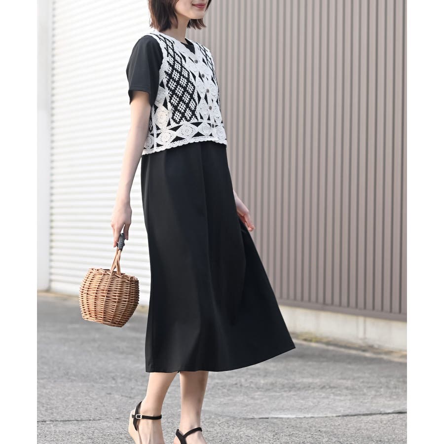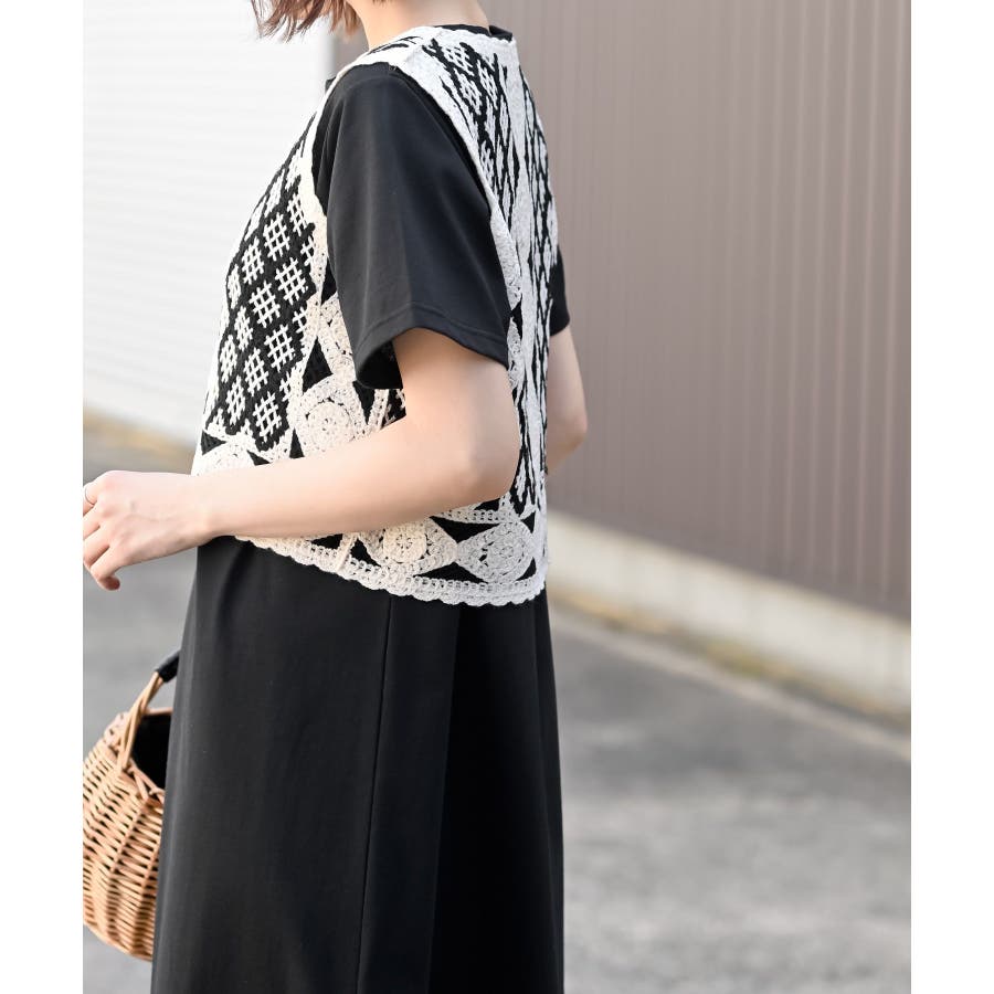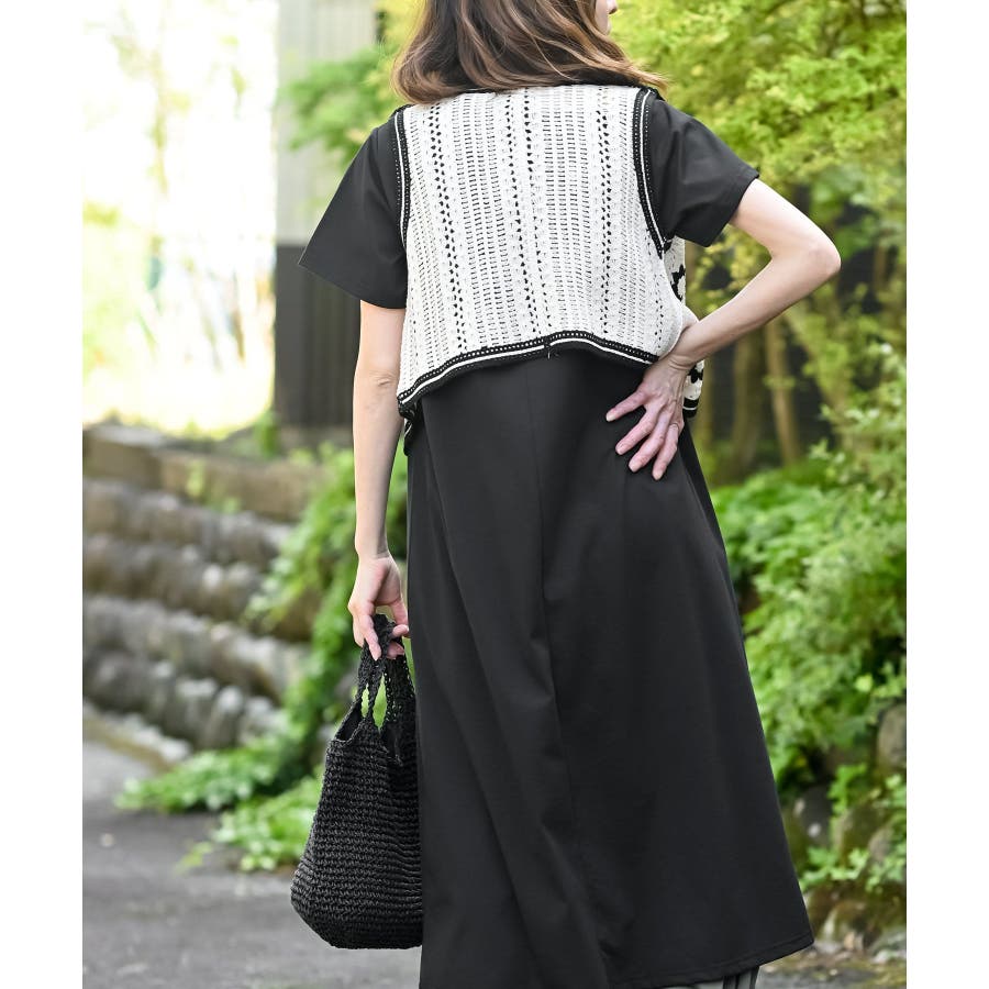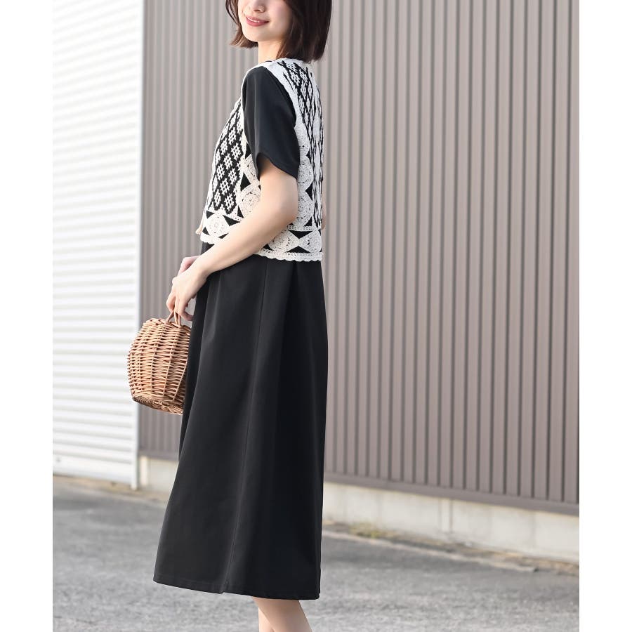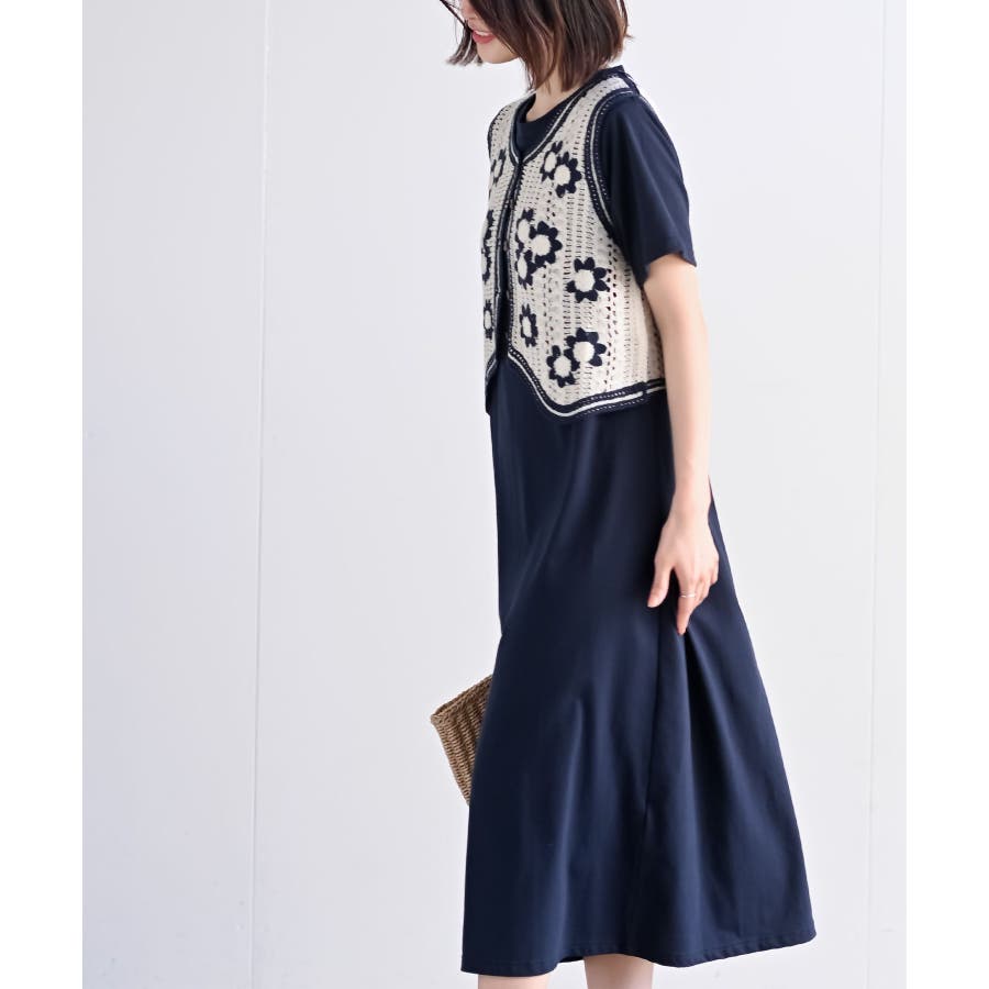 カギ針ベスト×Tシャツワンピースアンサンブル