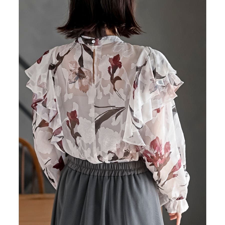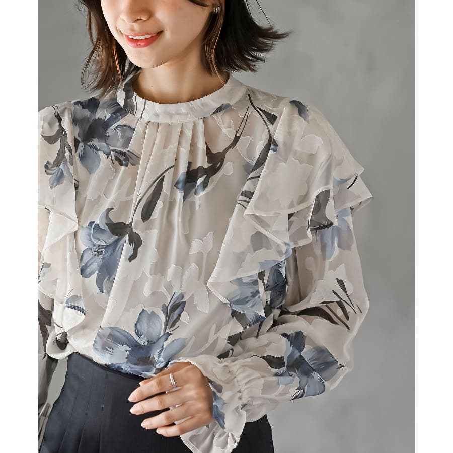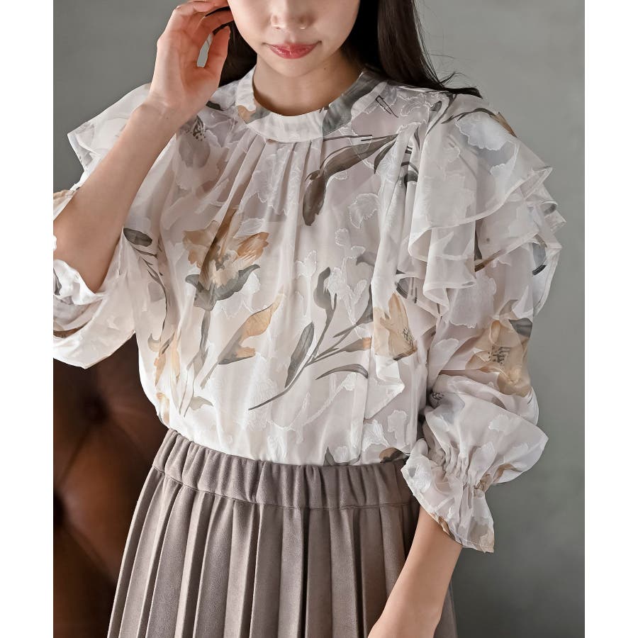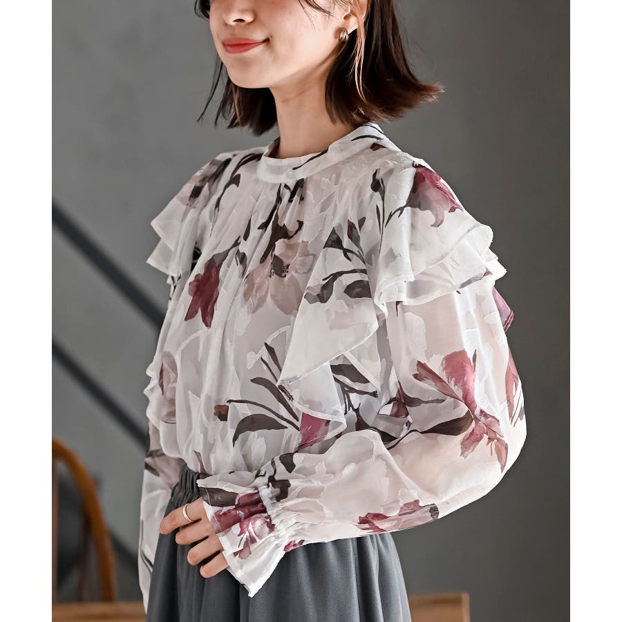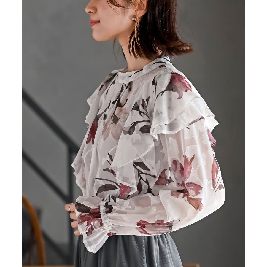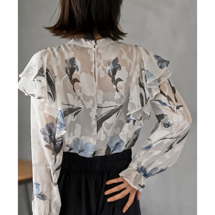 ジャガード花柄フリルブラウス