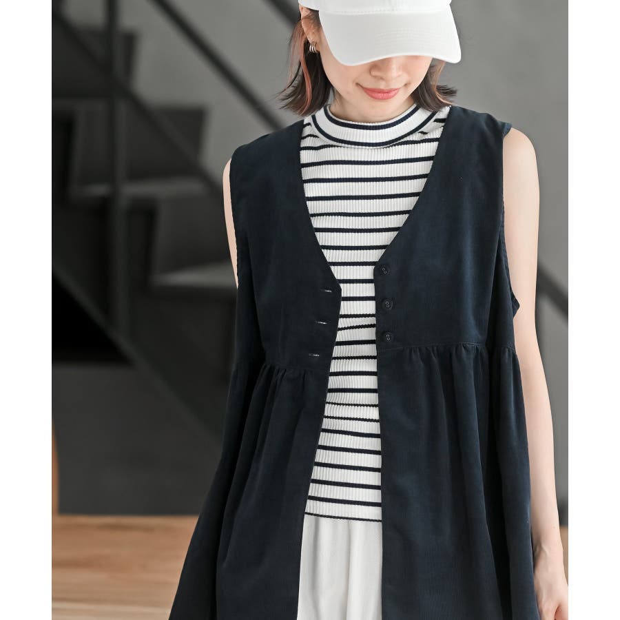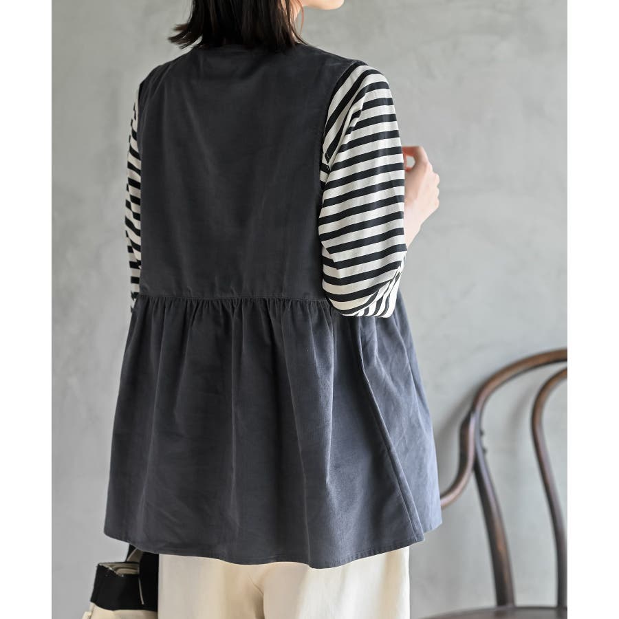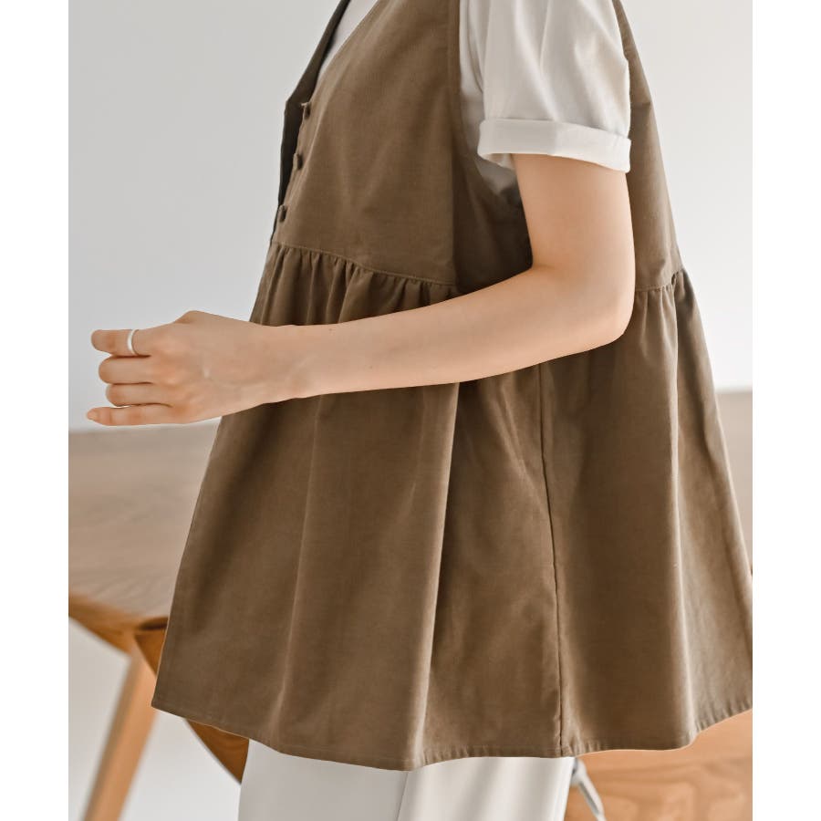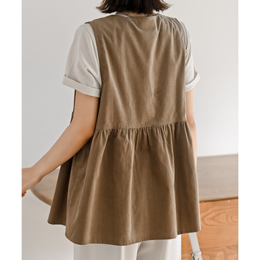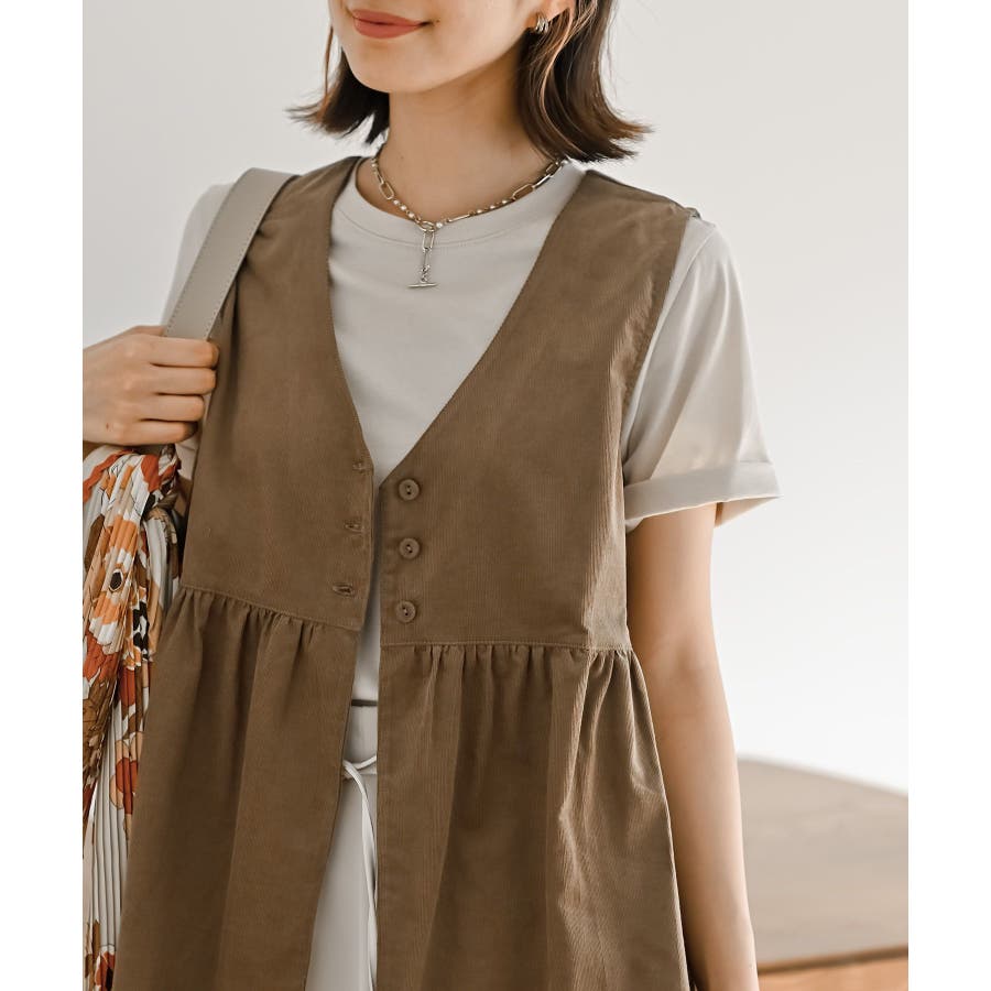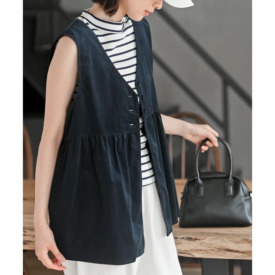 ★2025/AW NEW★プラスワンで季節感の生まれるコーデュロイベストシーズンムードを高めてくれるコーデュロイのベスト。細畝の素材なのでカジュアルになり過ぎず幅広いスタイリングにお使いいただけます。ウエストからふわっと広がる女性らしいペプラムシルエット。薄手で軽く、裏地もないのでロングシーズンお楽しみいただけるアイテムになっています。裏地なし伸縮性なし薄手前開きボタン留めポケットなし織キズやだま等みられる場合もございます洗濯:洗濯機使用可