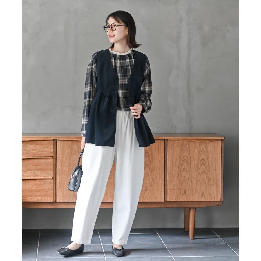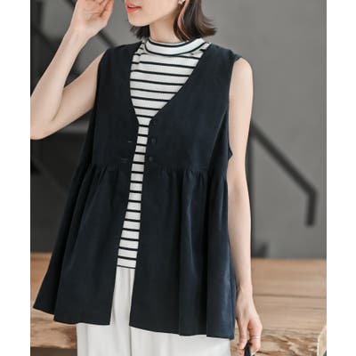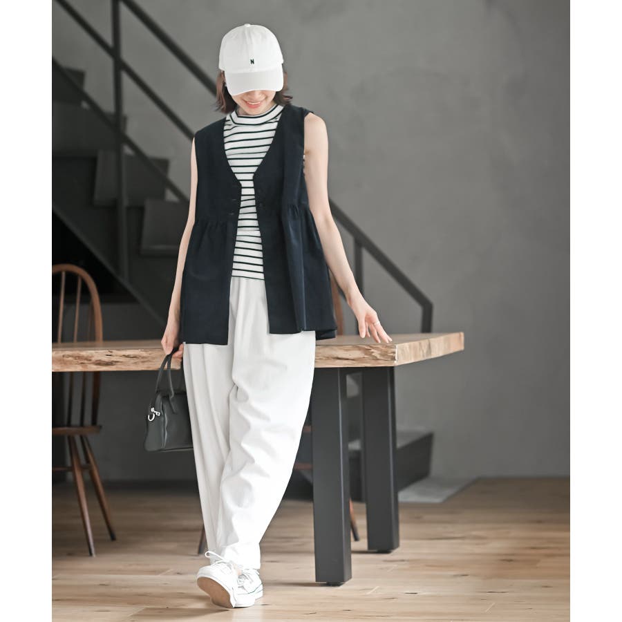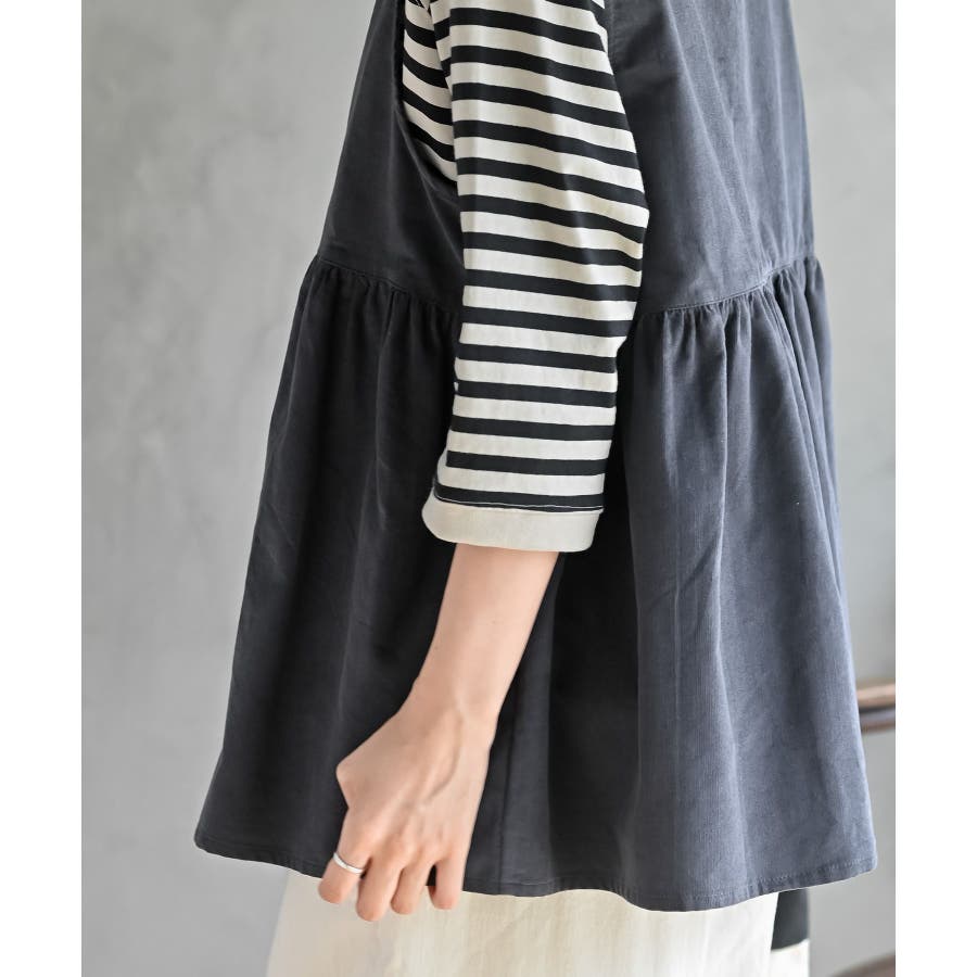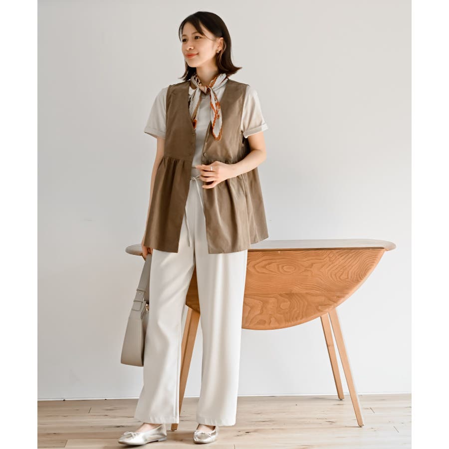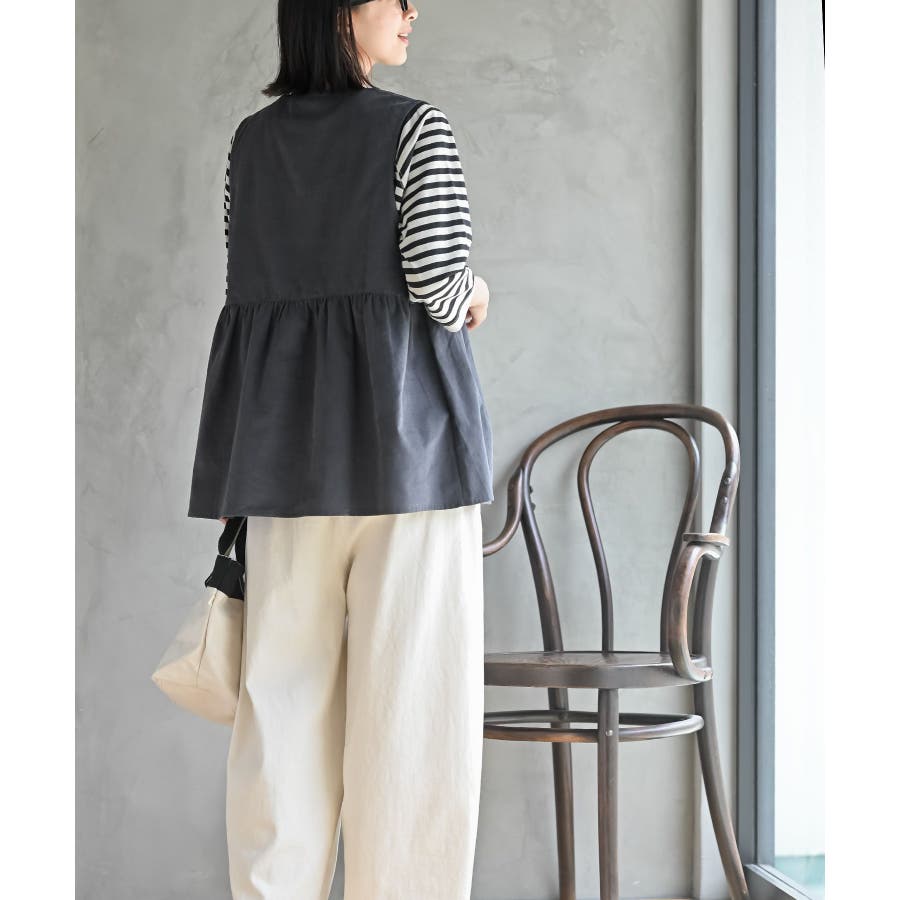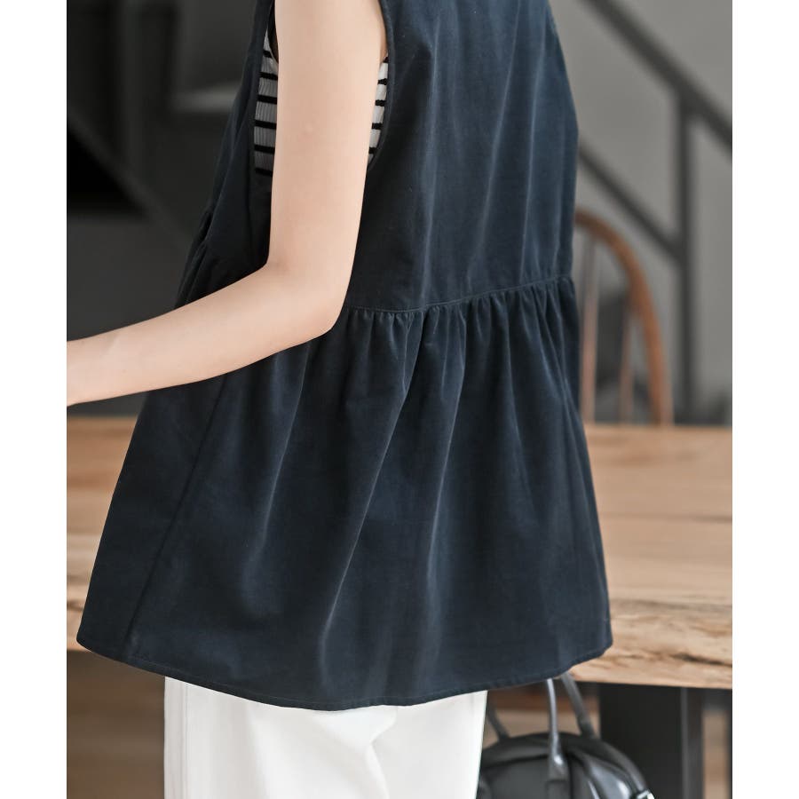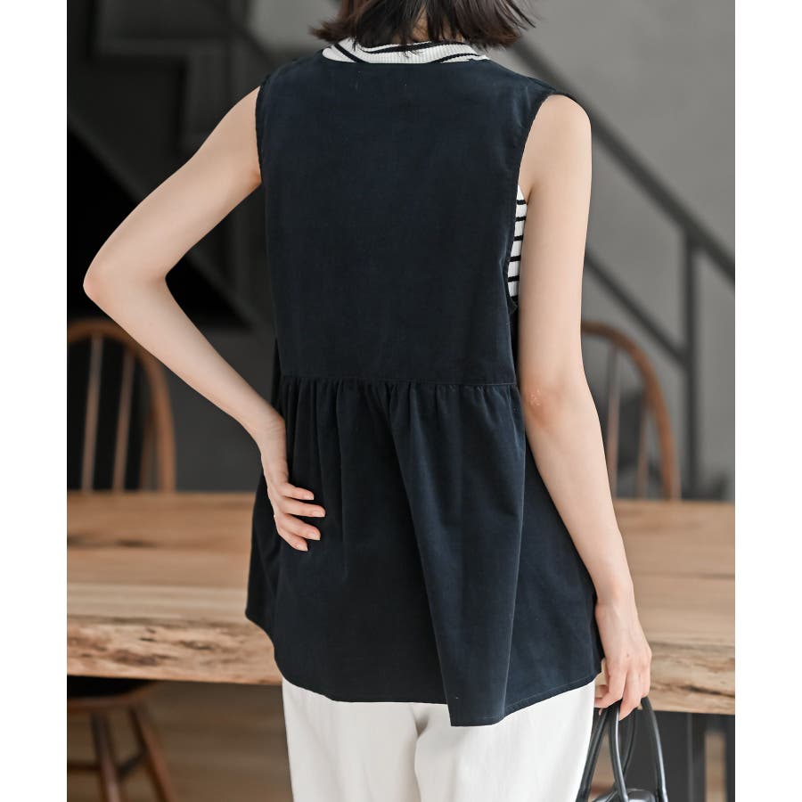 ★2025/AW NEW★プラスワンで季節感の生まれるコーデュロイベストシーズンムードを高めてくれるコーデュロイのベスト。細畝の素材なのでカジュアルになり過ぎず幅広いスタイリングにお使いいただけます。ウエストからふわっと広がる女性らしいペプラムシルエット。薄手で軽く、裏地もないのでロングシーズンお楽しみいただけるアイテムになっています。裏地なし伸縮性なし薄手前開きボタン留めポケットなし織キズやだま等みられる場合もございます洗濯:洗濯機使用可