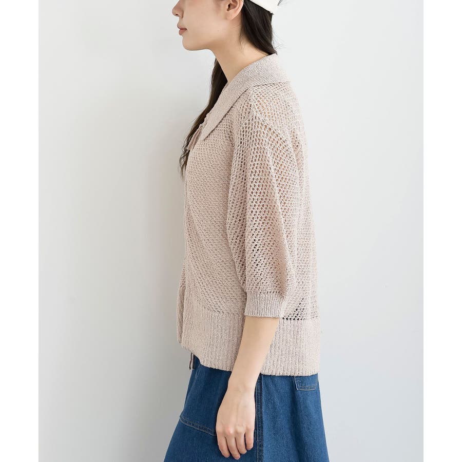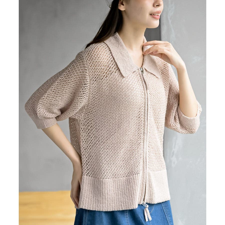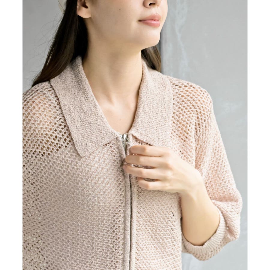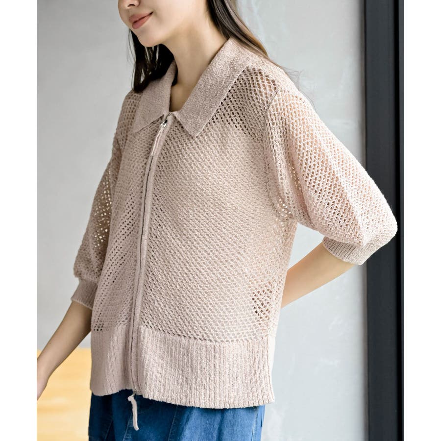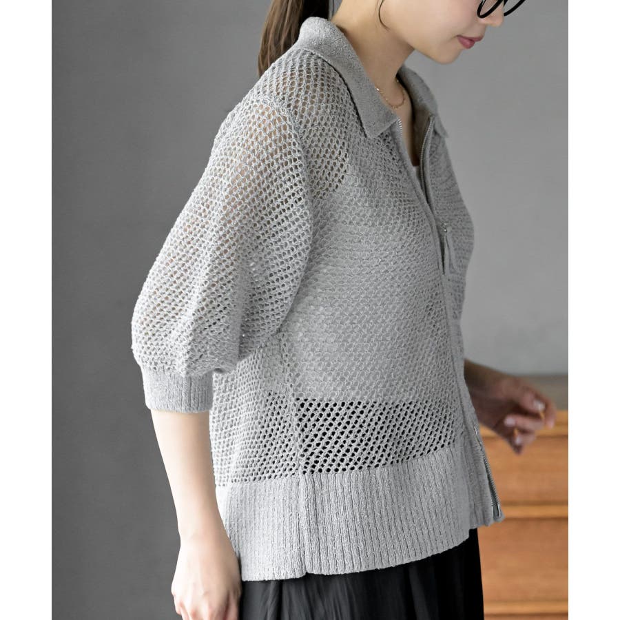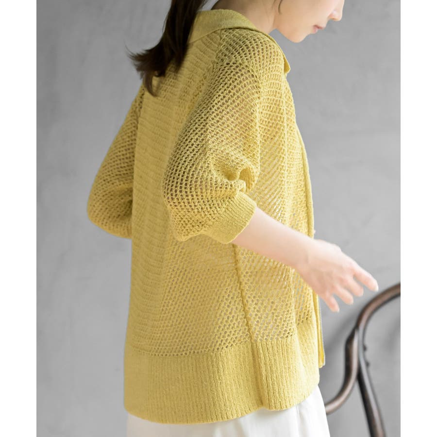 衿付き5分袖透かし編みZIPカーディガン