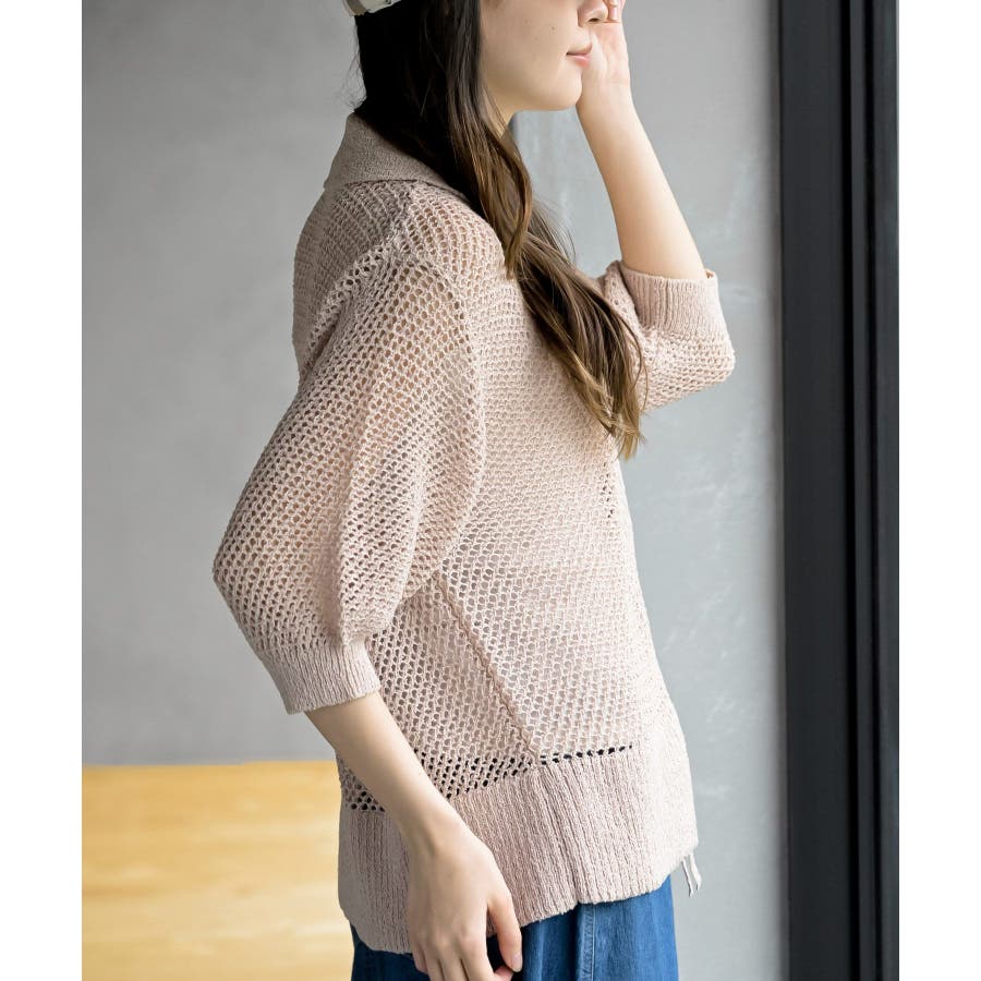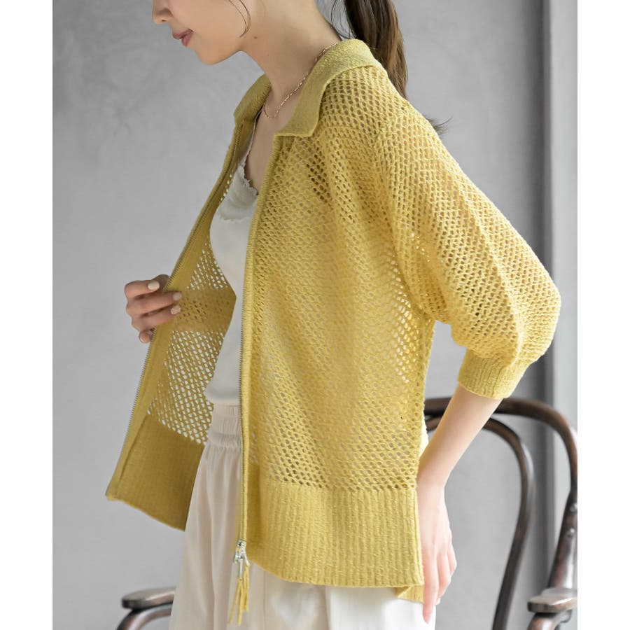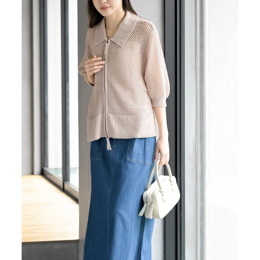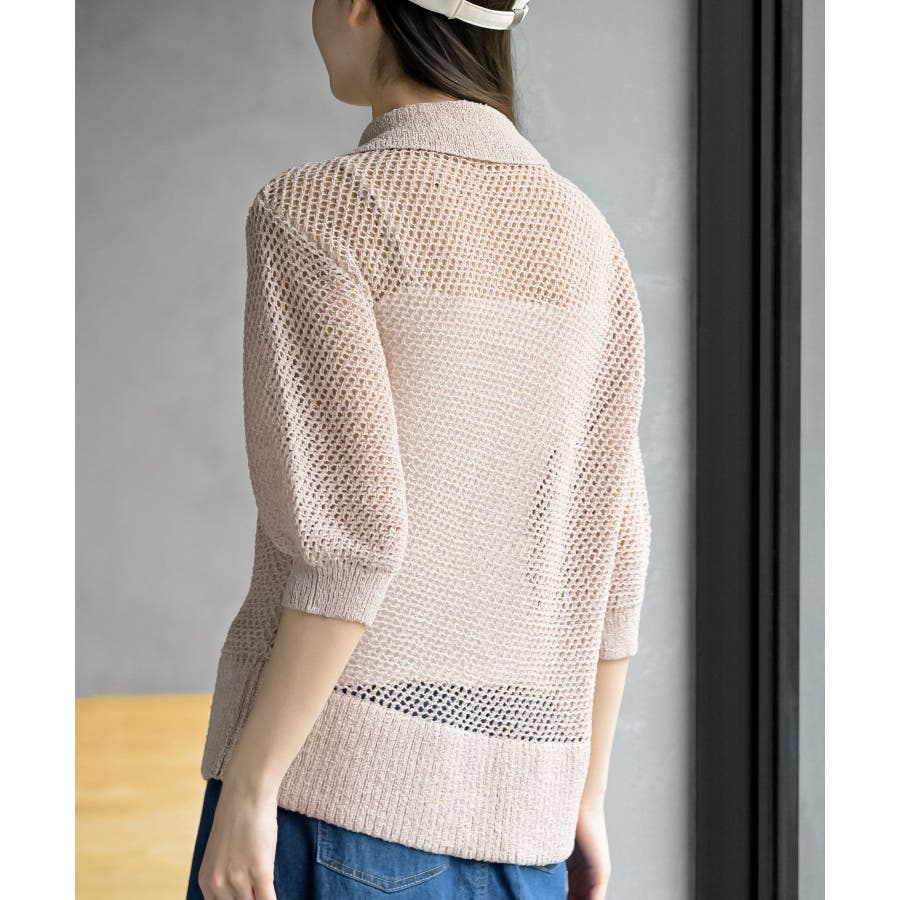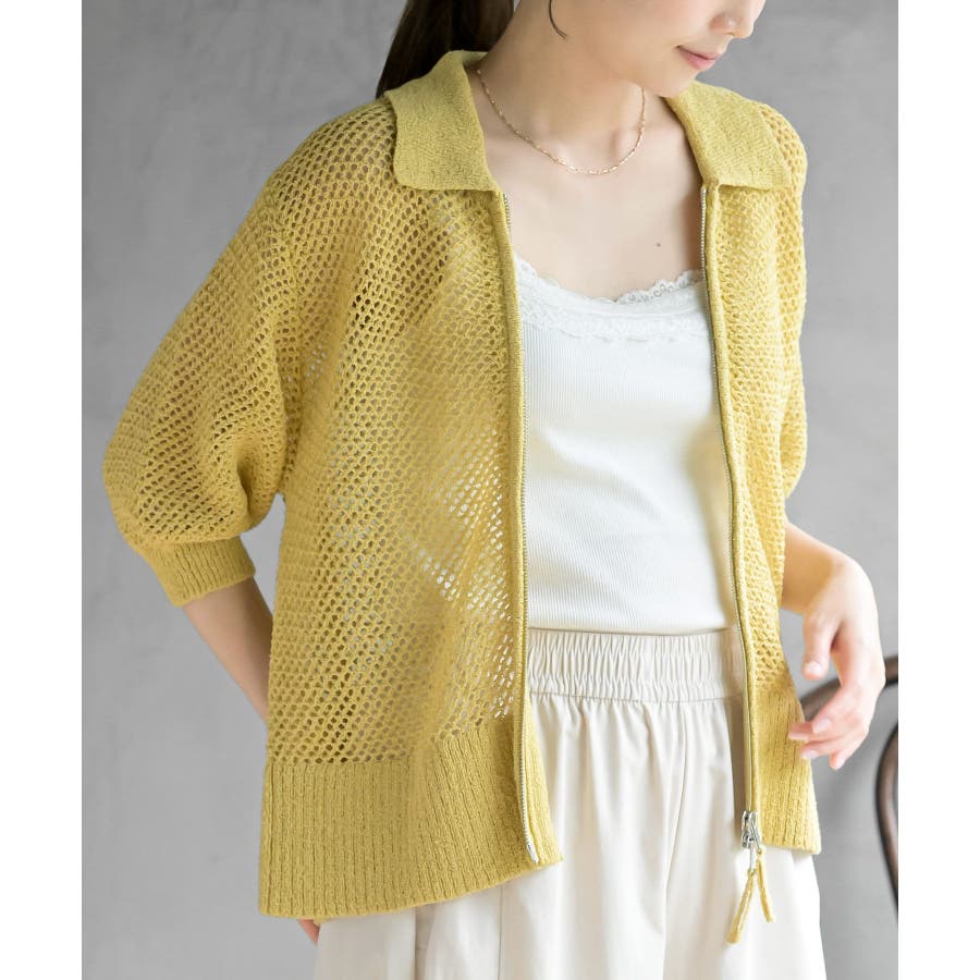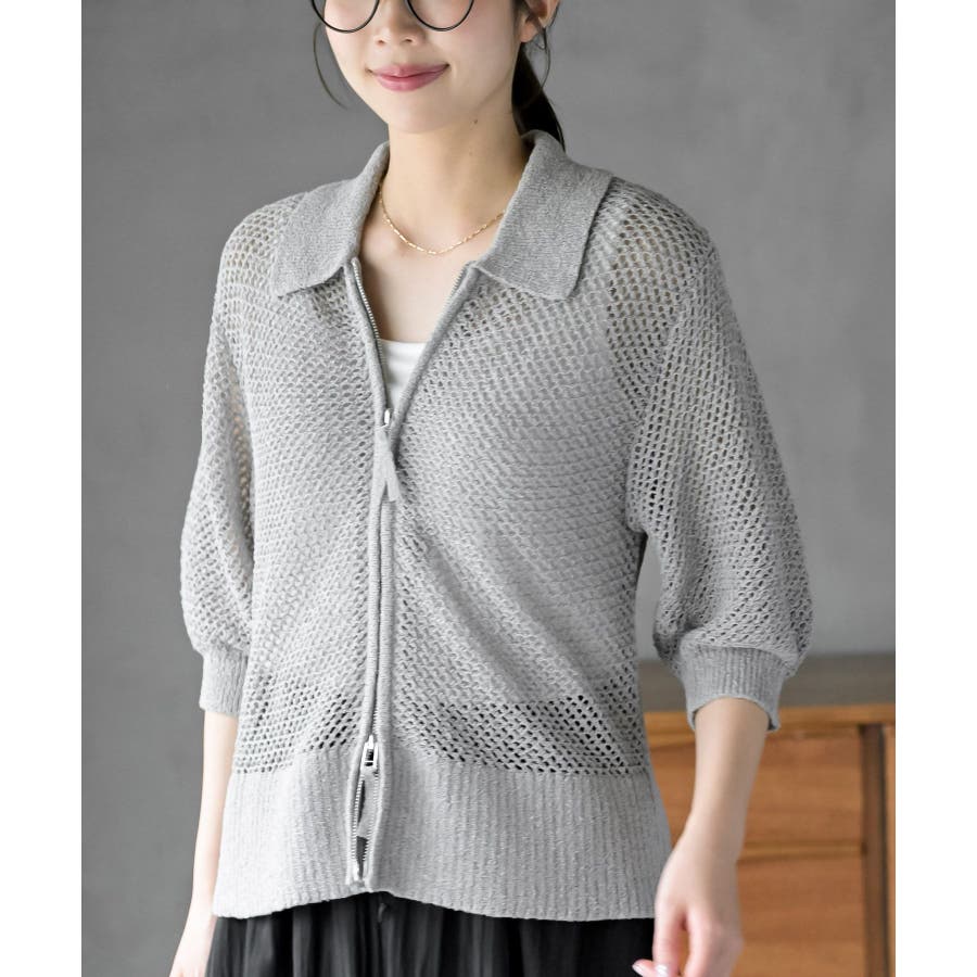 衿付き5分袖透かし編みZIPカーディガン