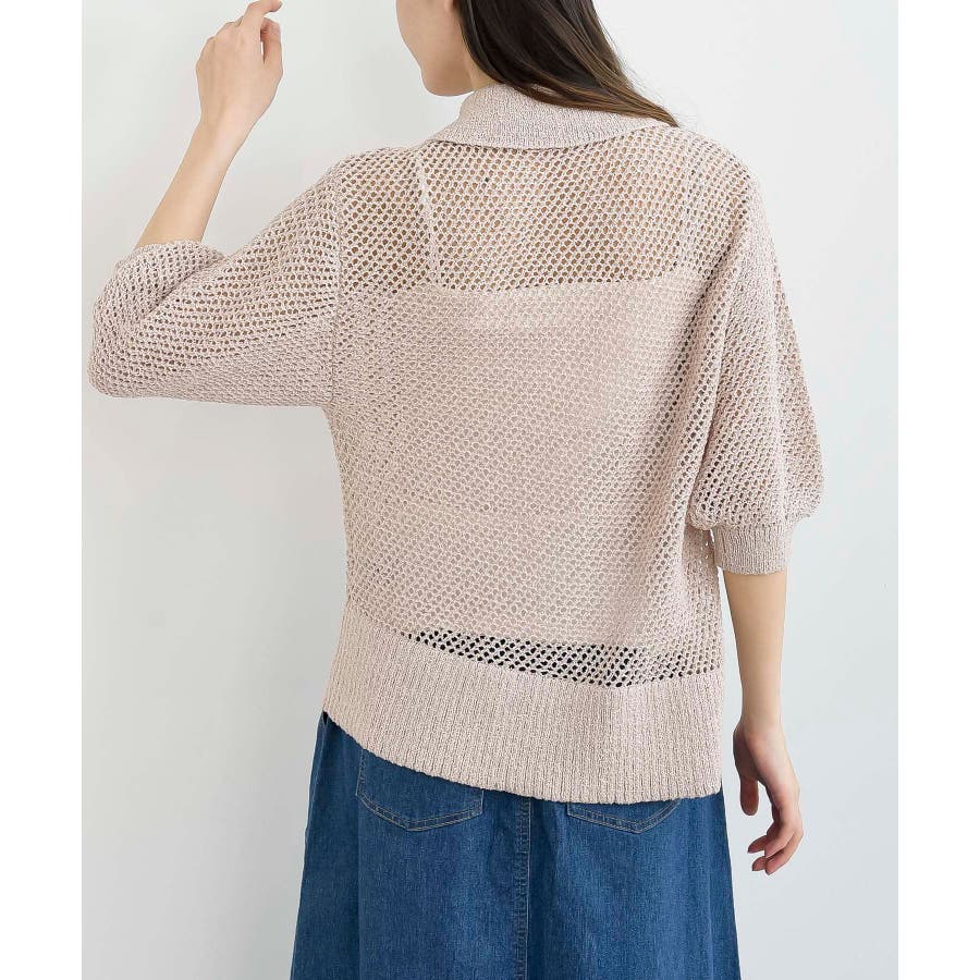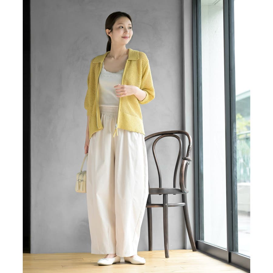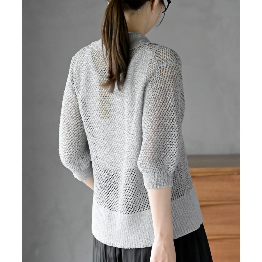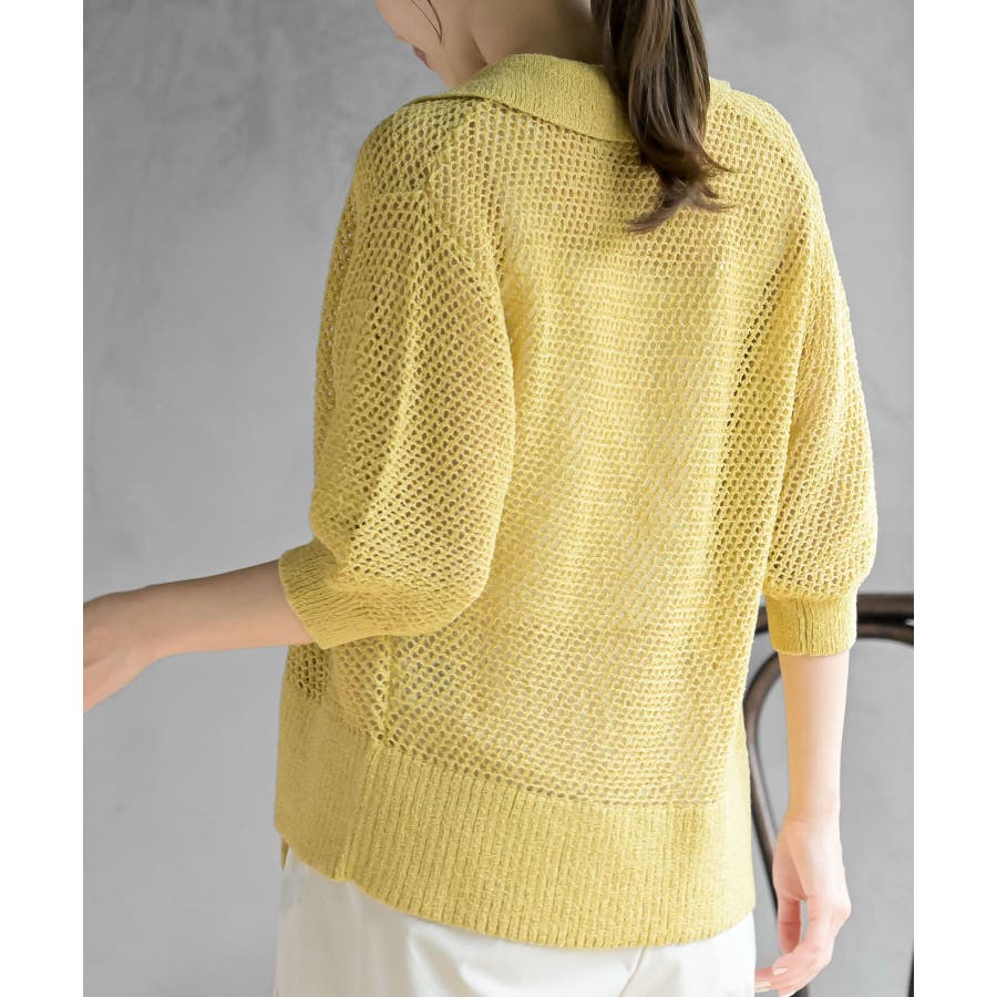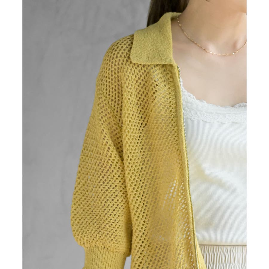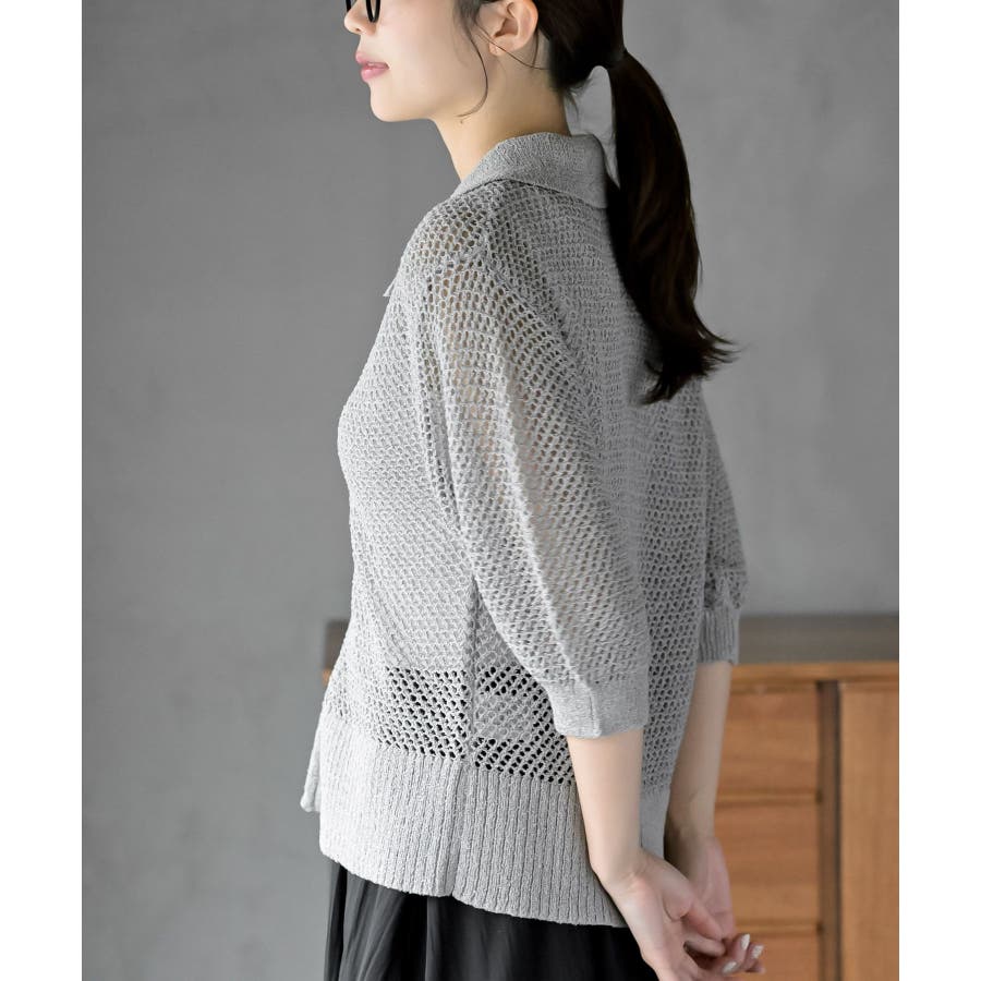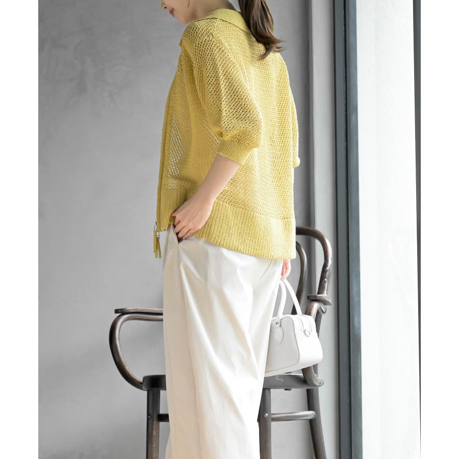 衿付き5分袖透かし編みZIPカーディガン