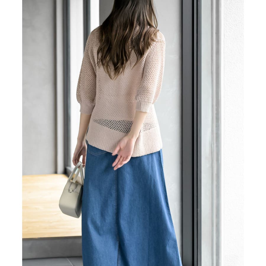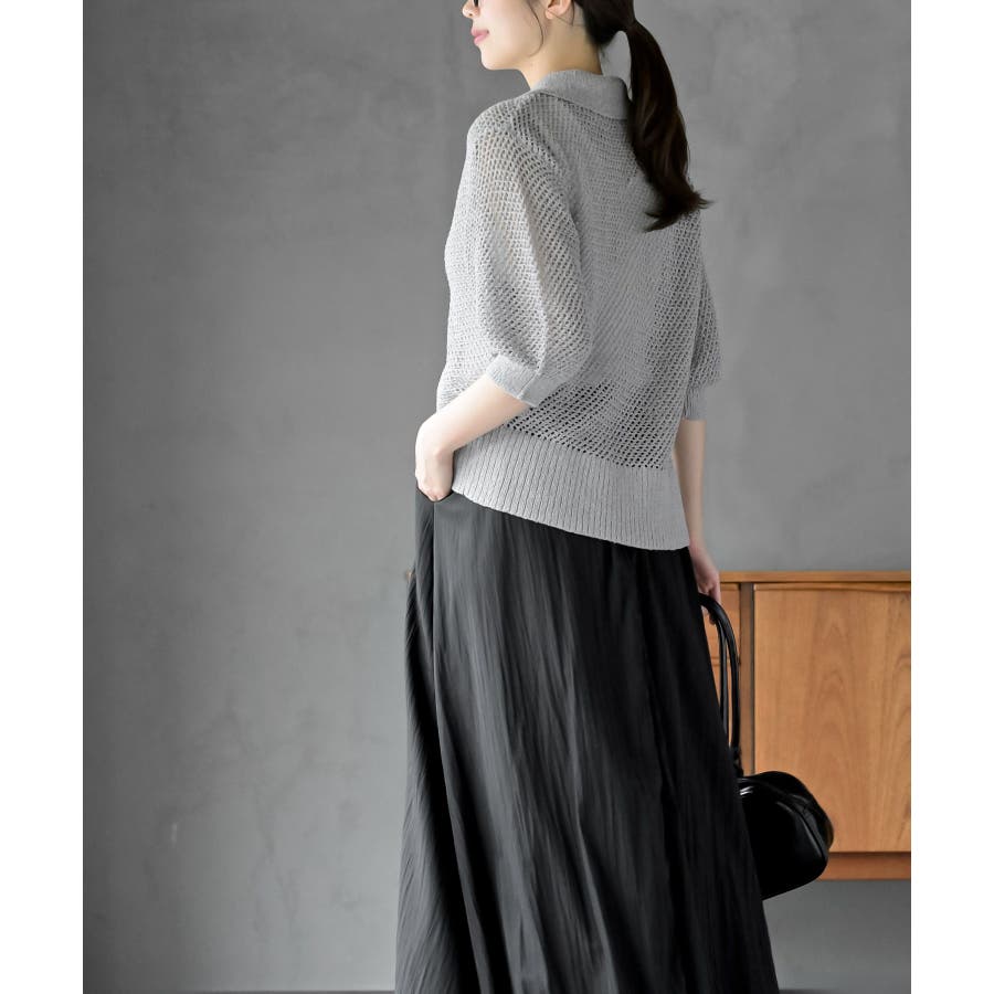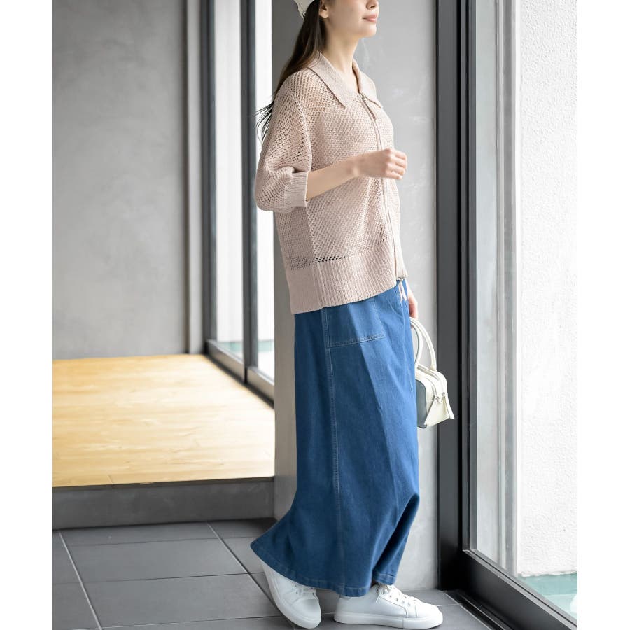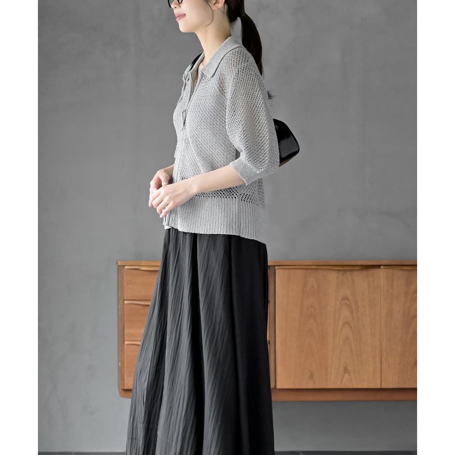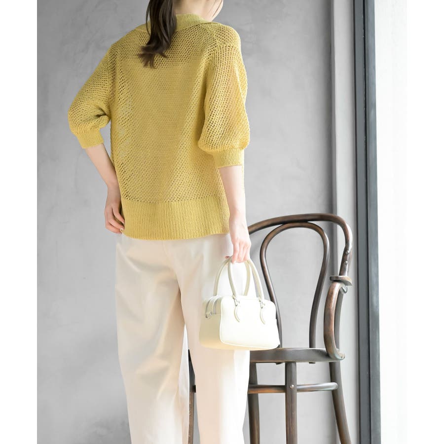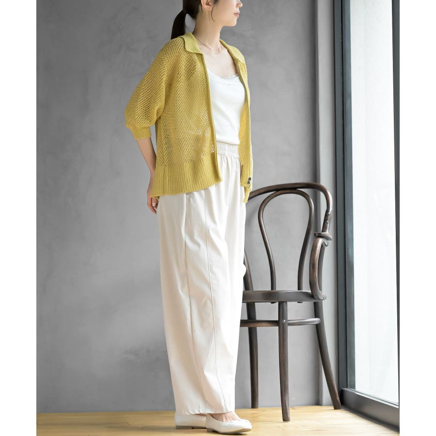 衿付き5分袖透かし編みZIPカーディガン