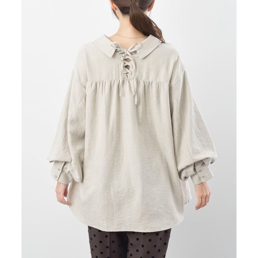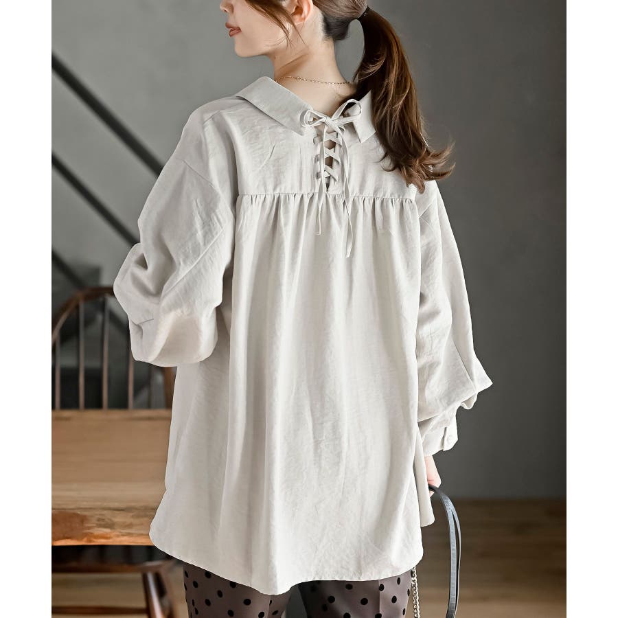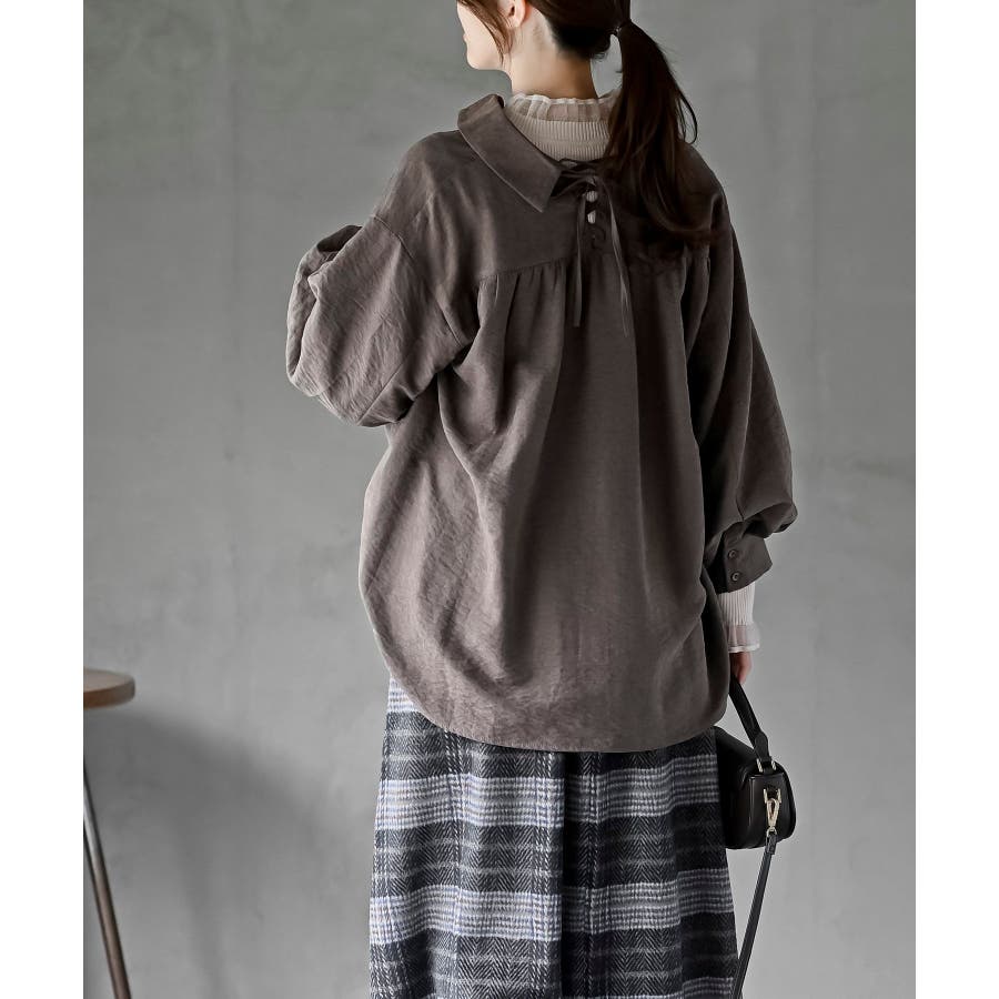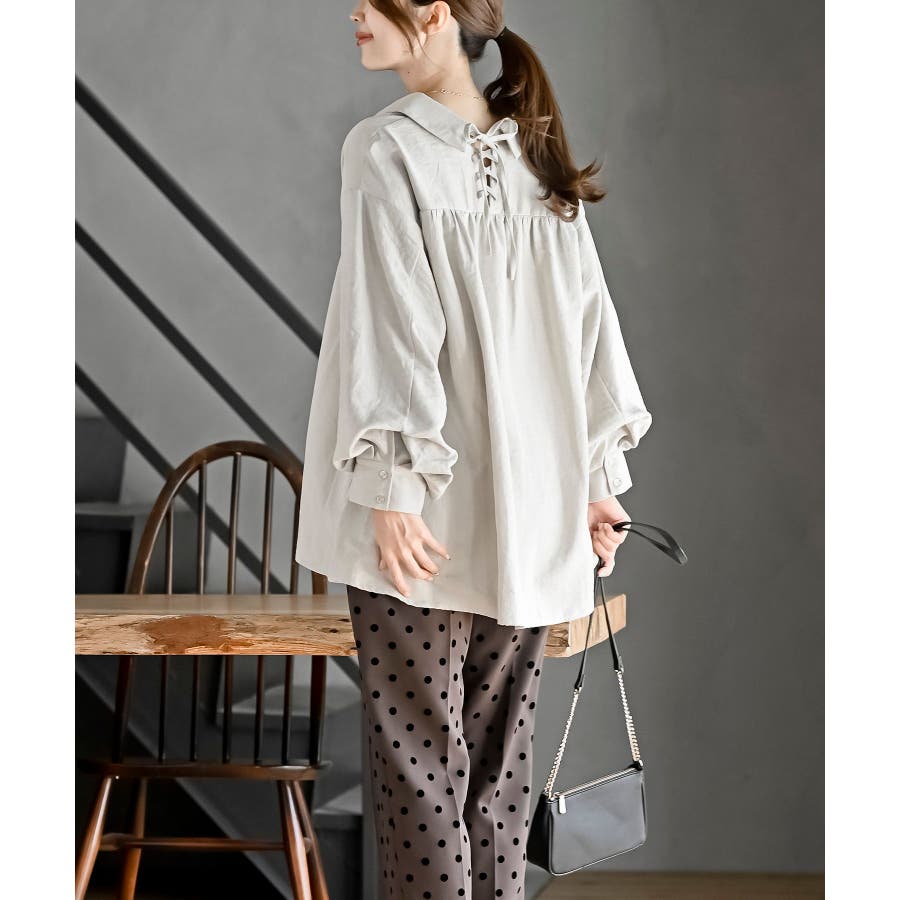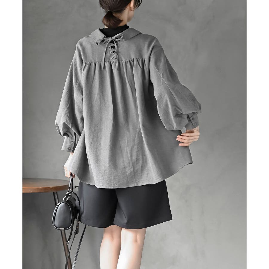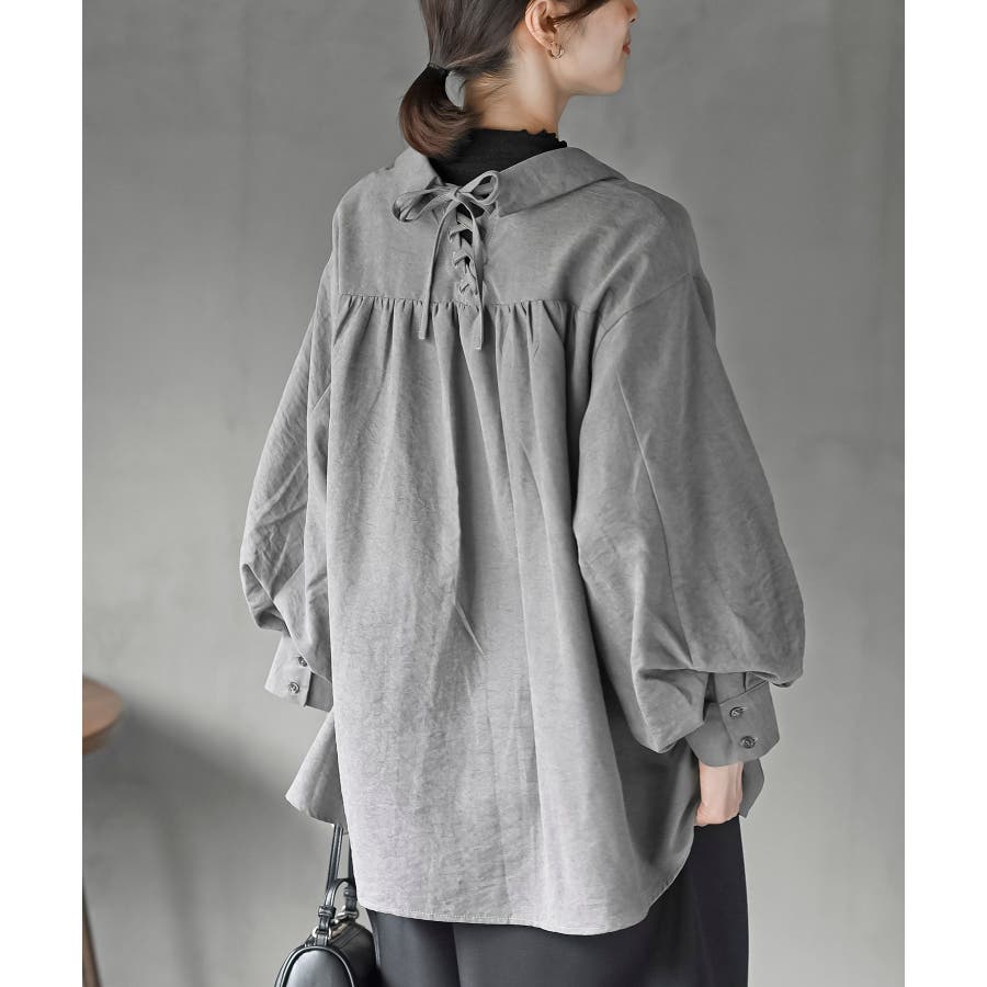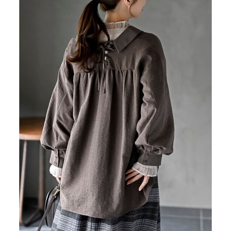 レースアップピーチ起毛ボリューム袖ブラウス