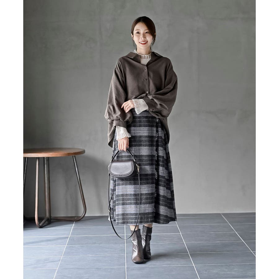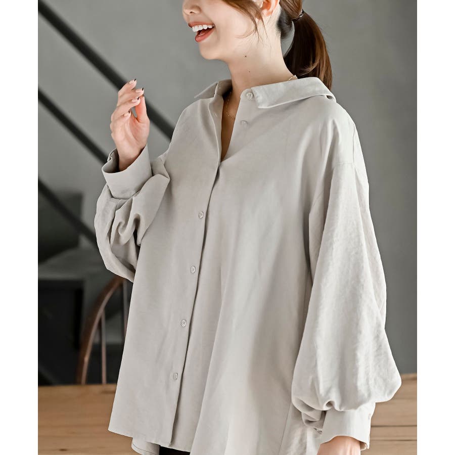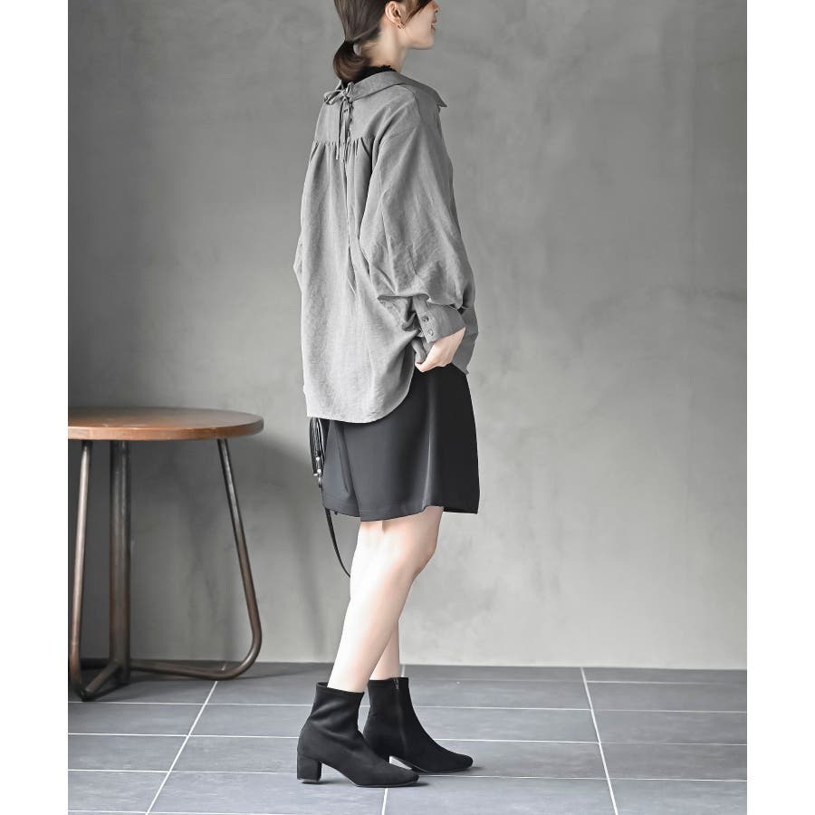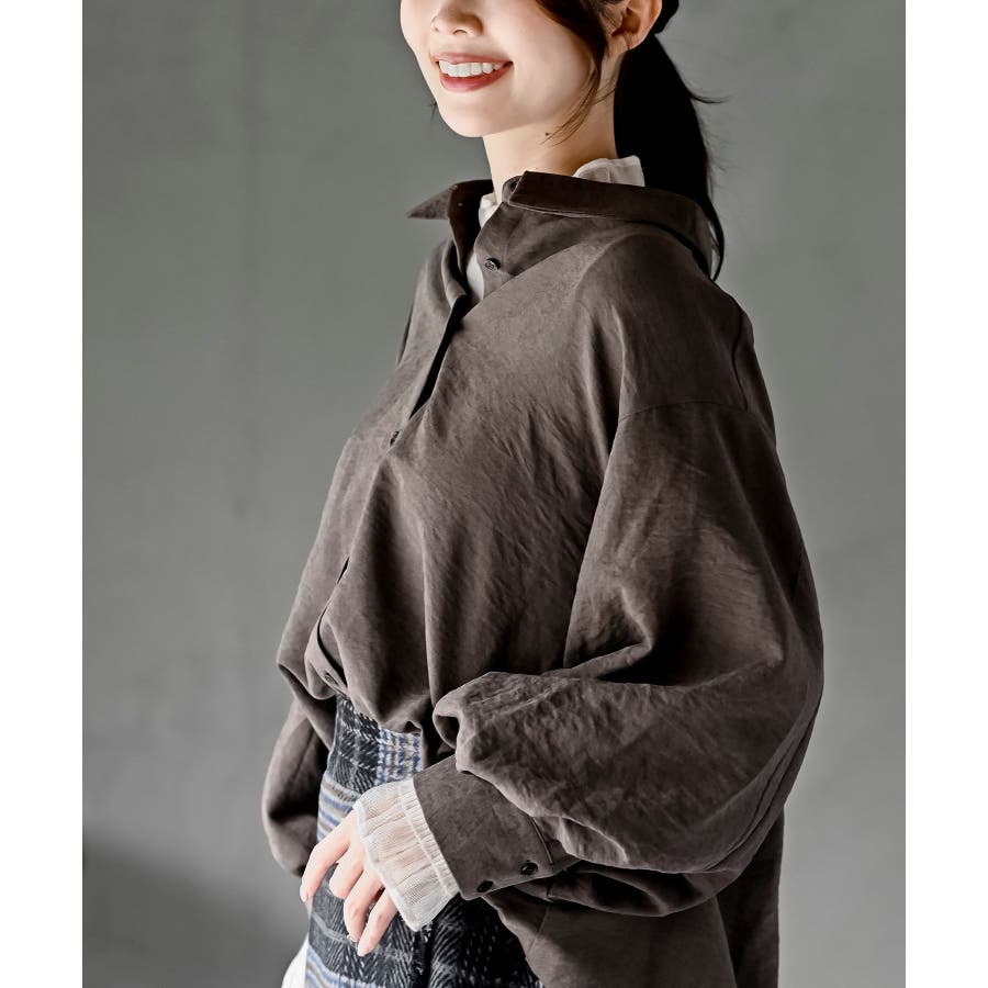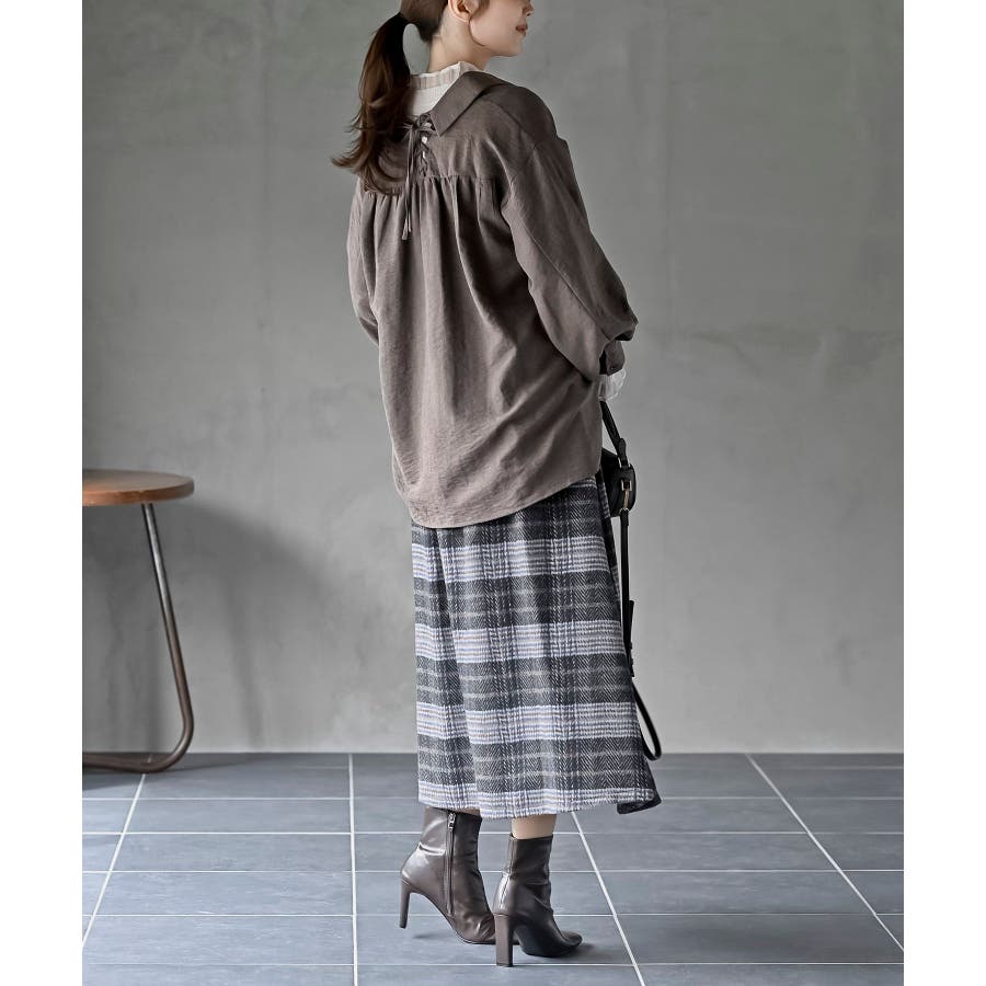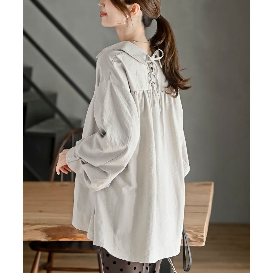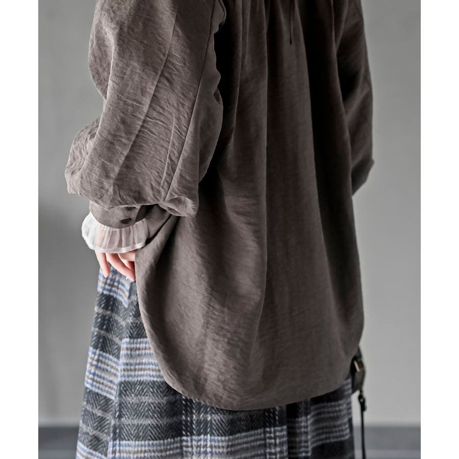 レースアップピーチ起毛ボリューム袖ブラウス