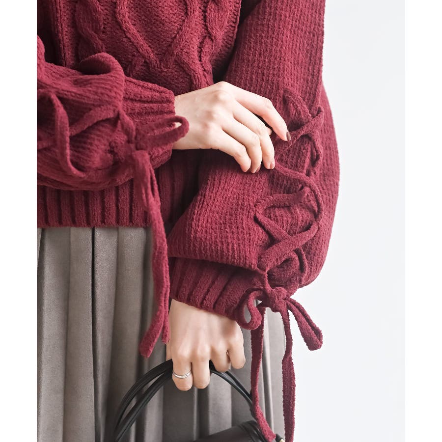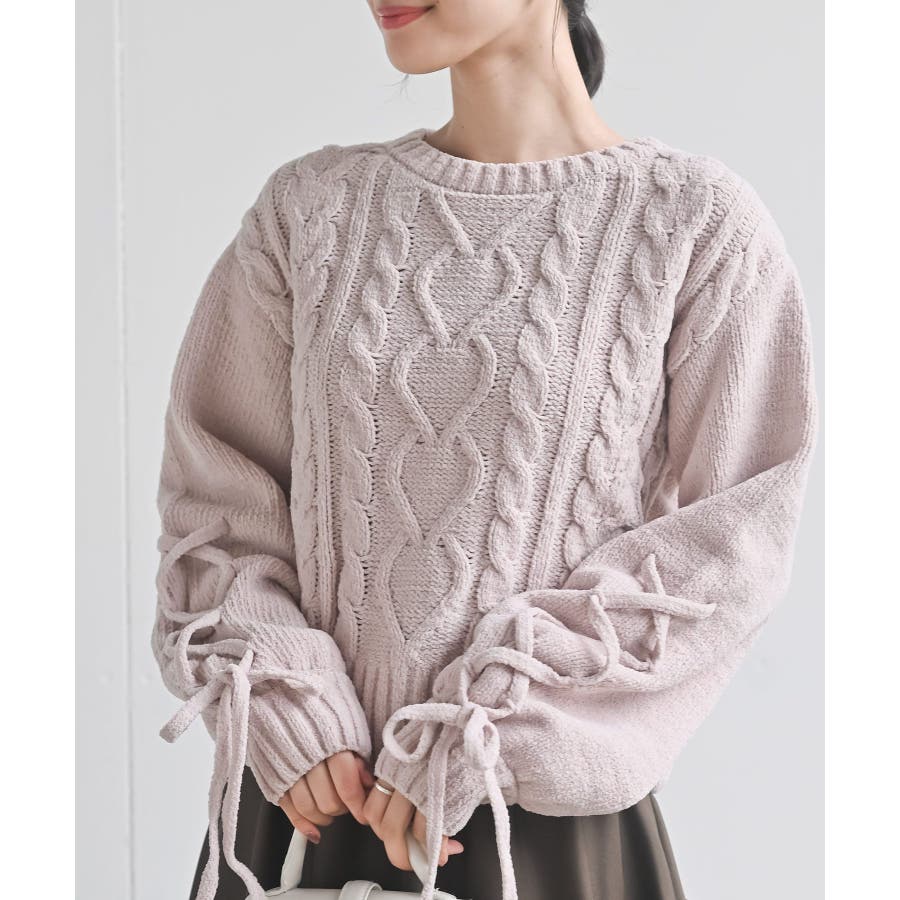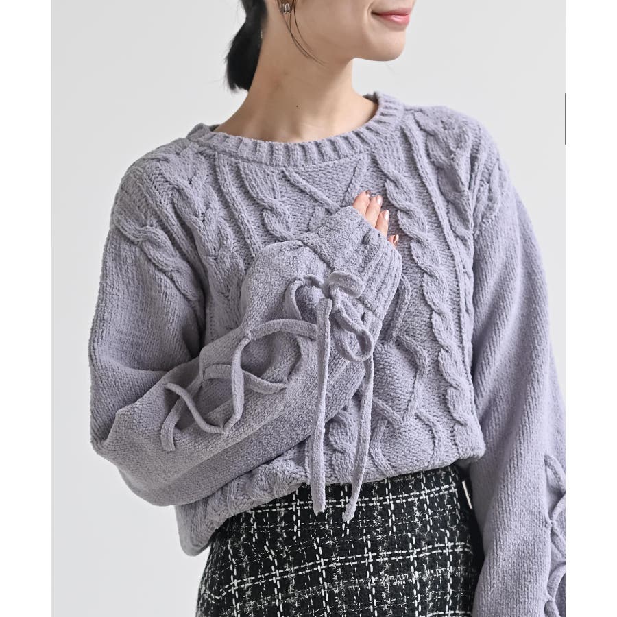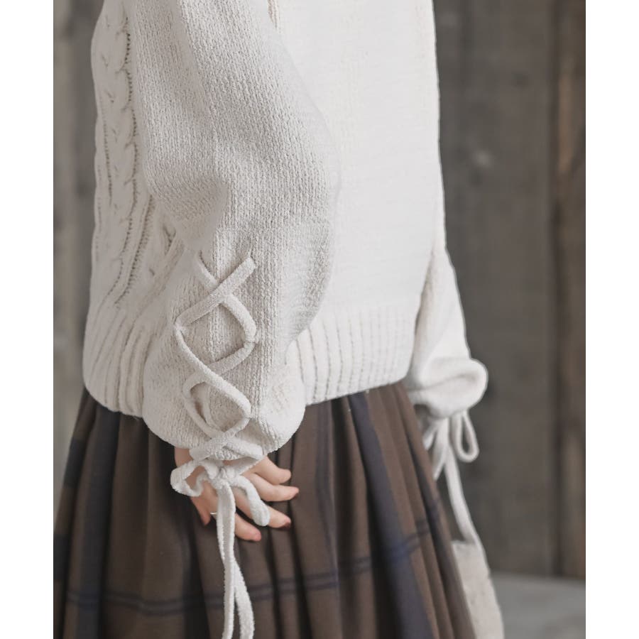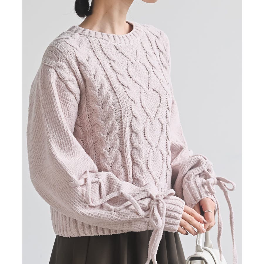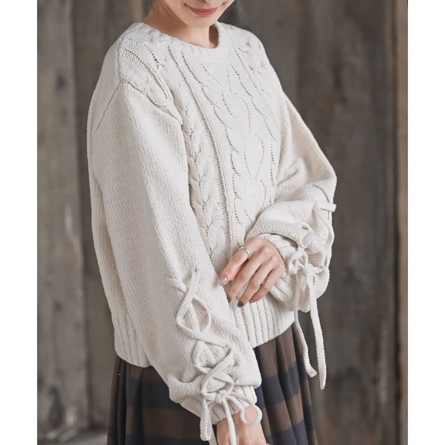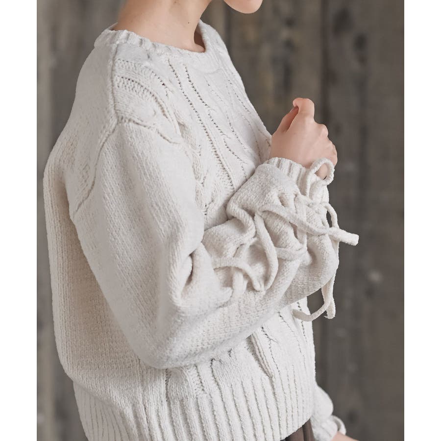 レースアップスリーブケーブルモールニットプルオーバー