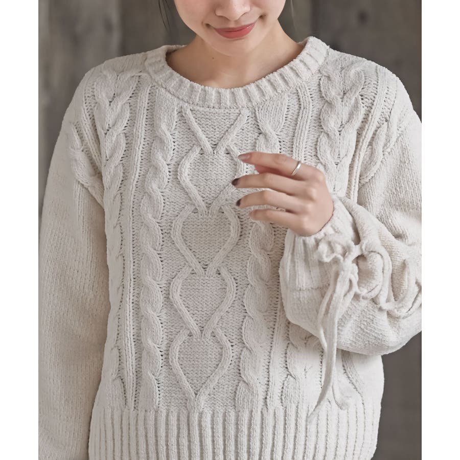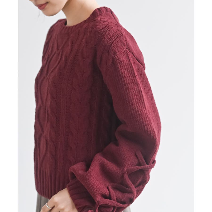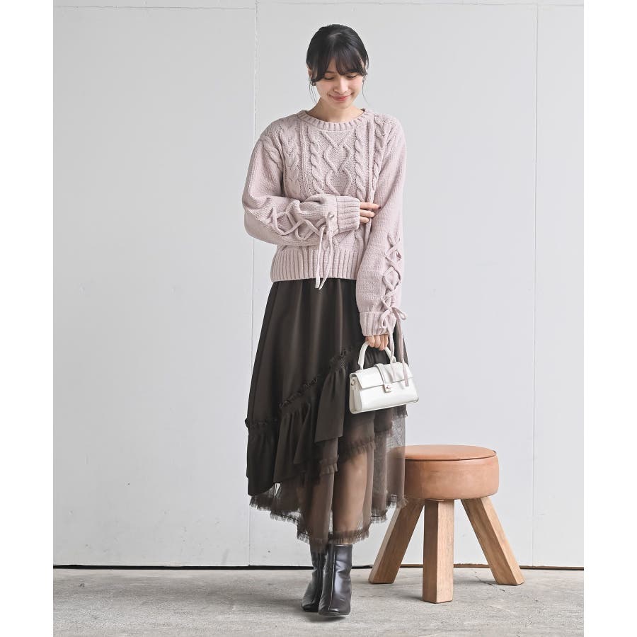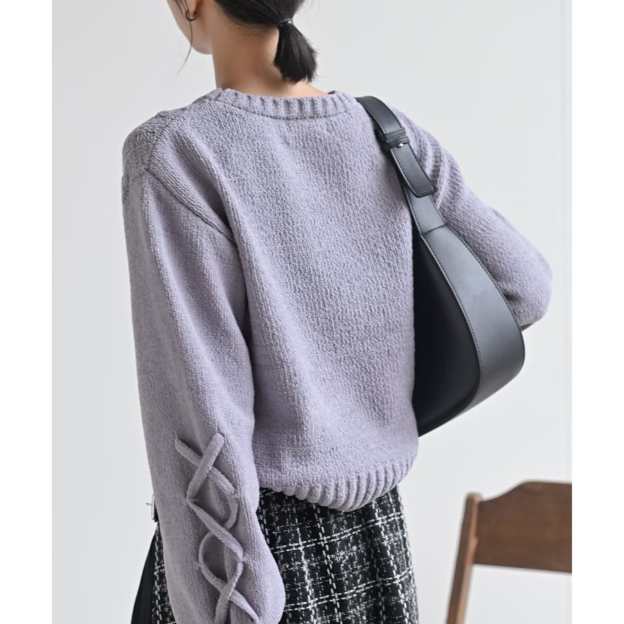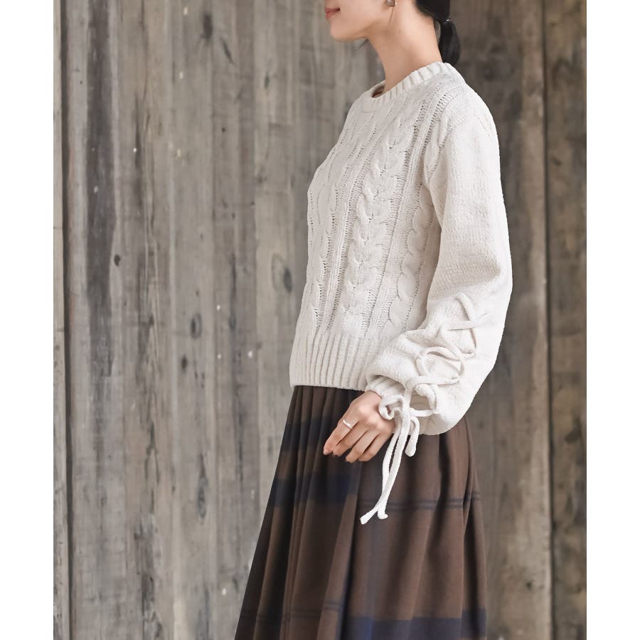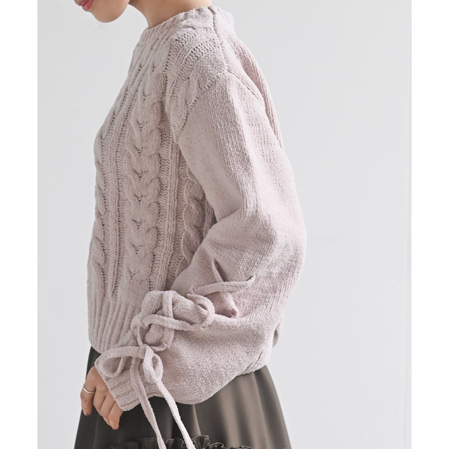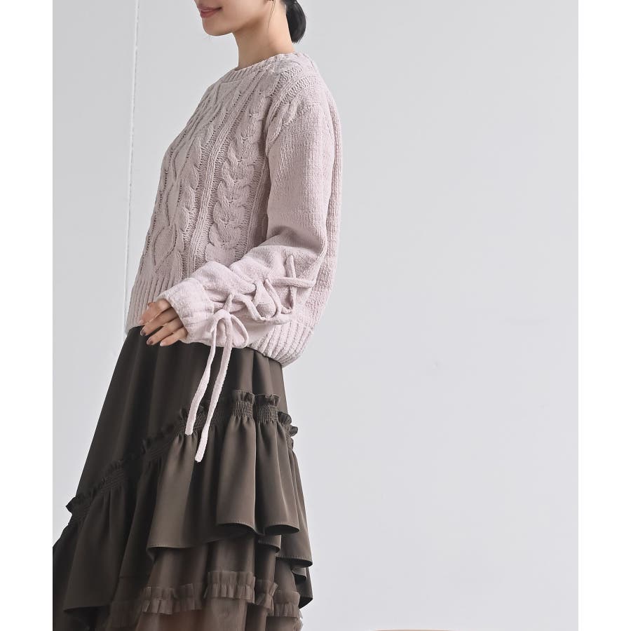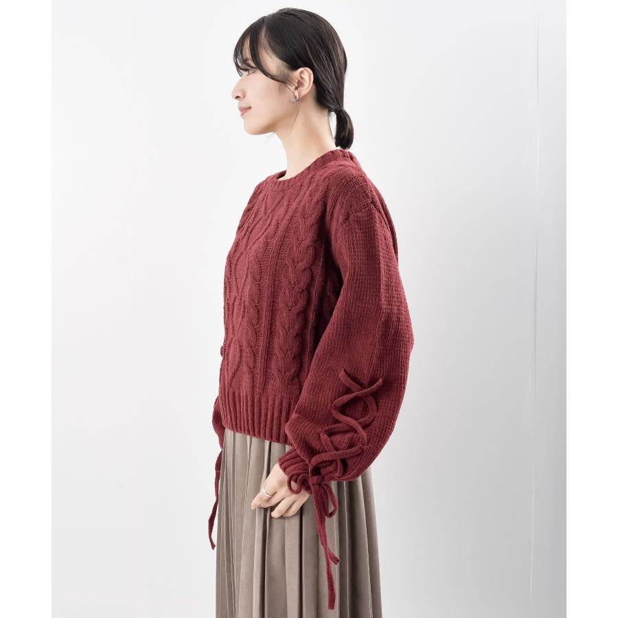 レースアップスリーブケーブルモールニットプルオーバー