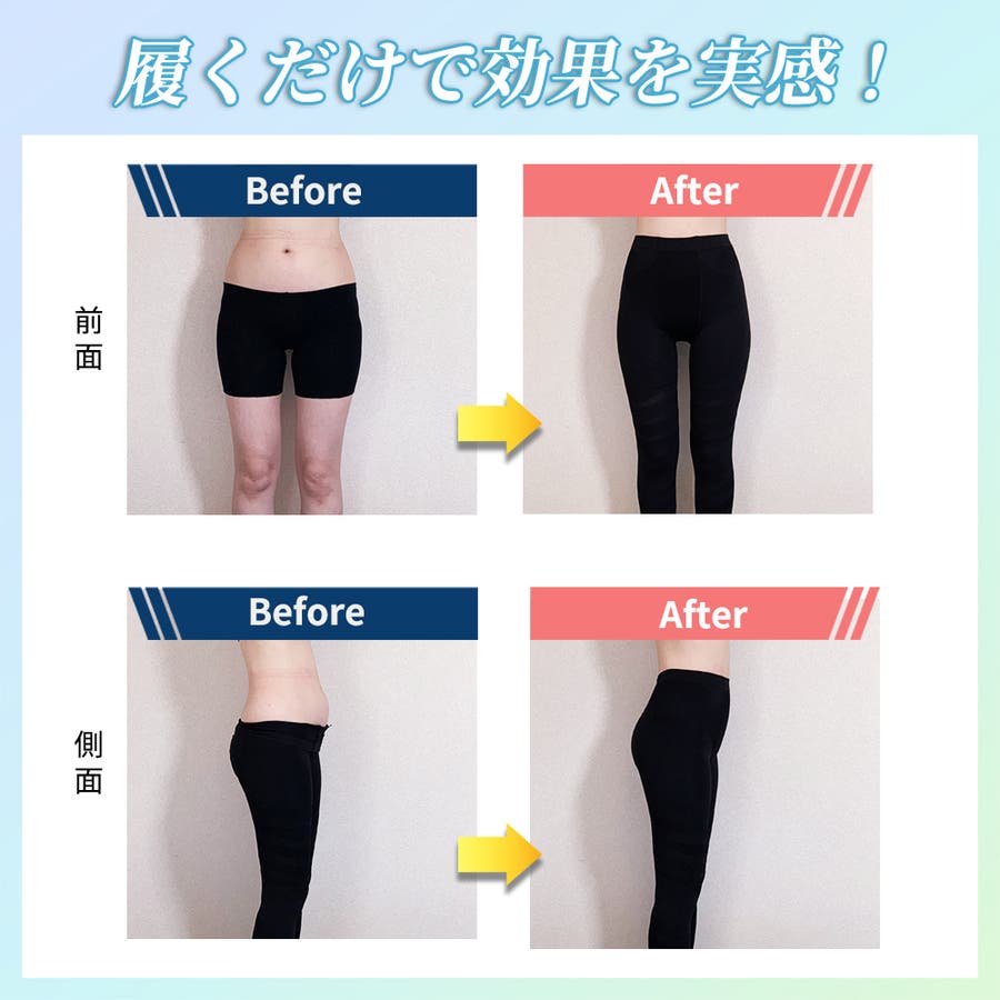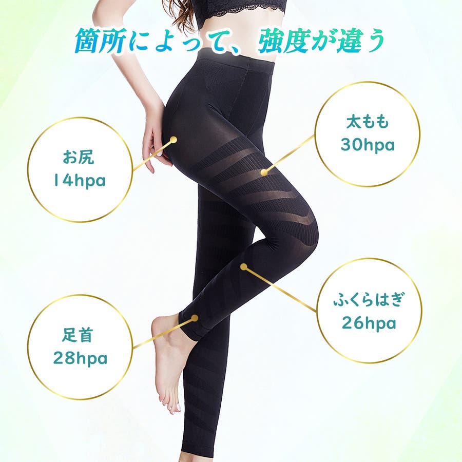 お腹から太もも、ふくらはぎまでを適度な着圧で包み込み、すっきりとしたボディラインを魅せます。長時間履いても動きやすく、デイリー使いにぴったりな快適なフィット感が魅力です。