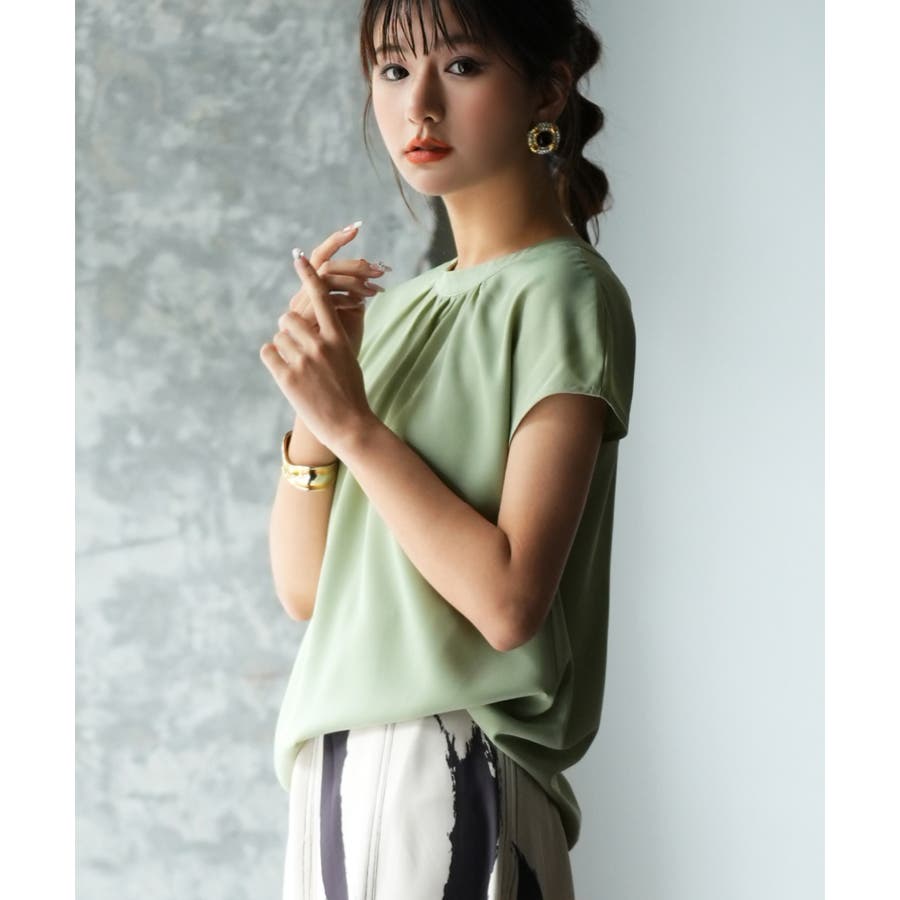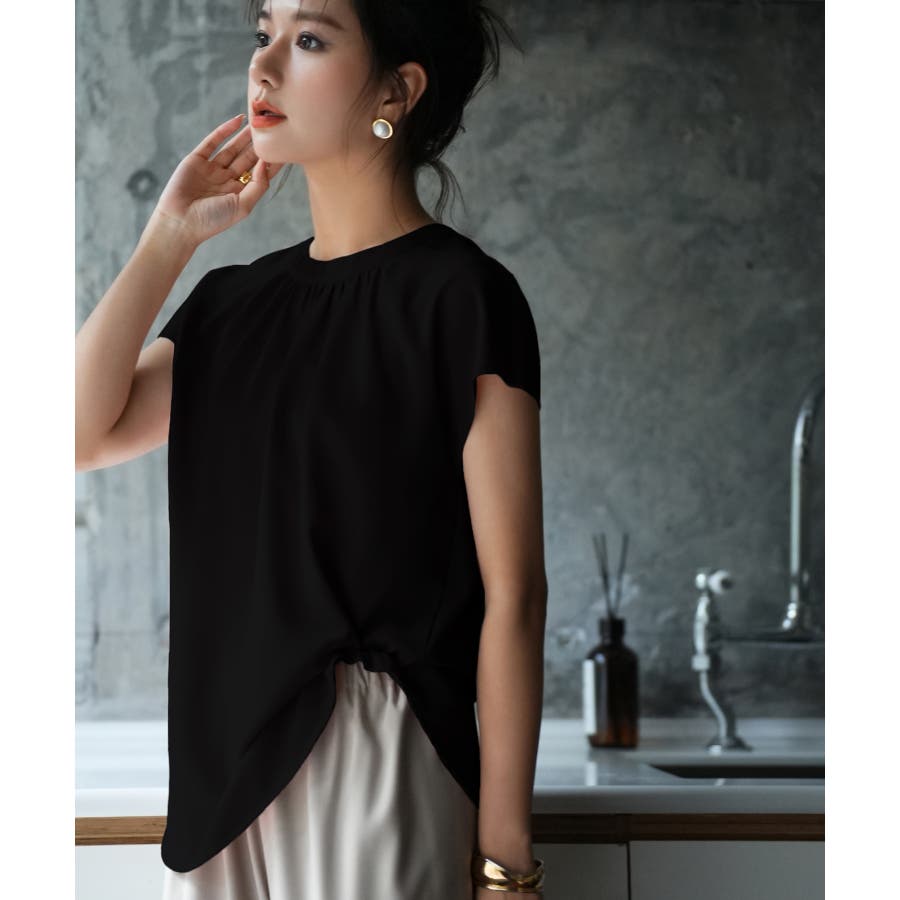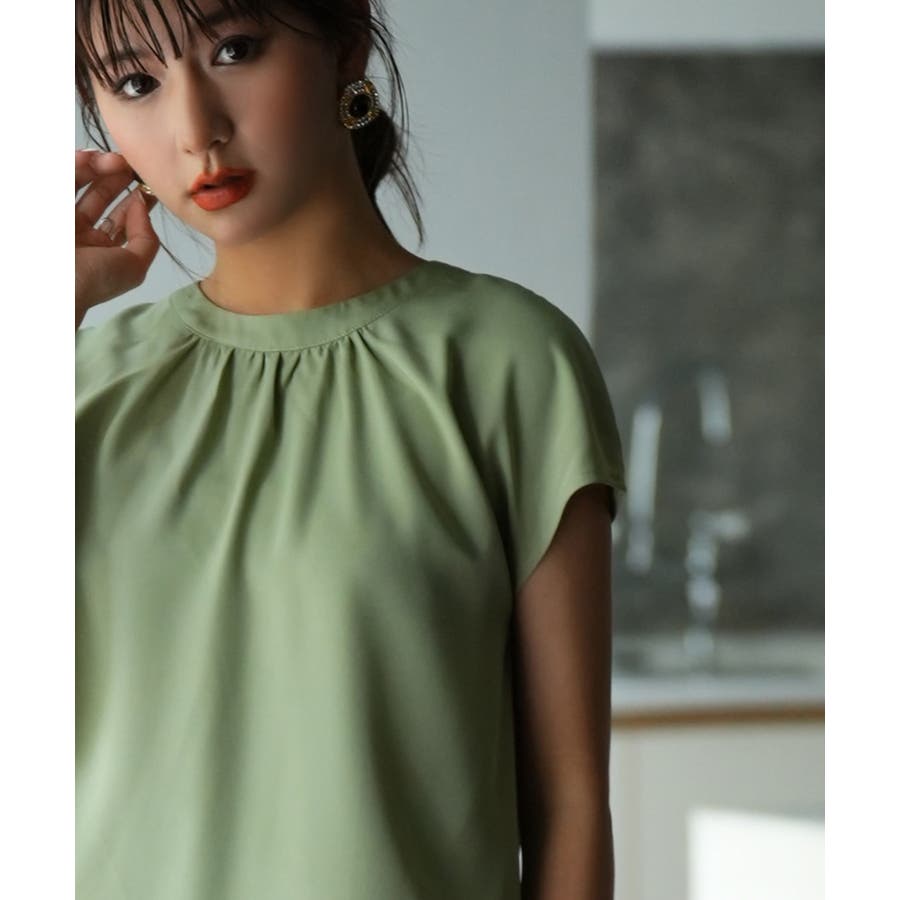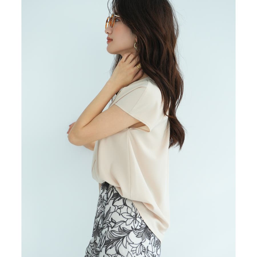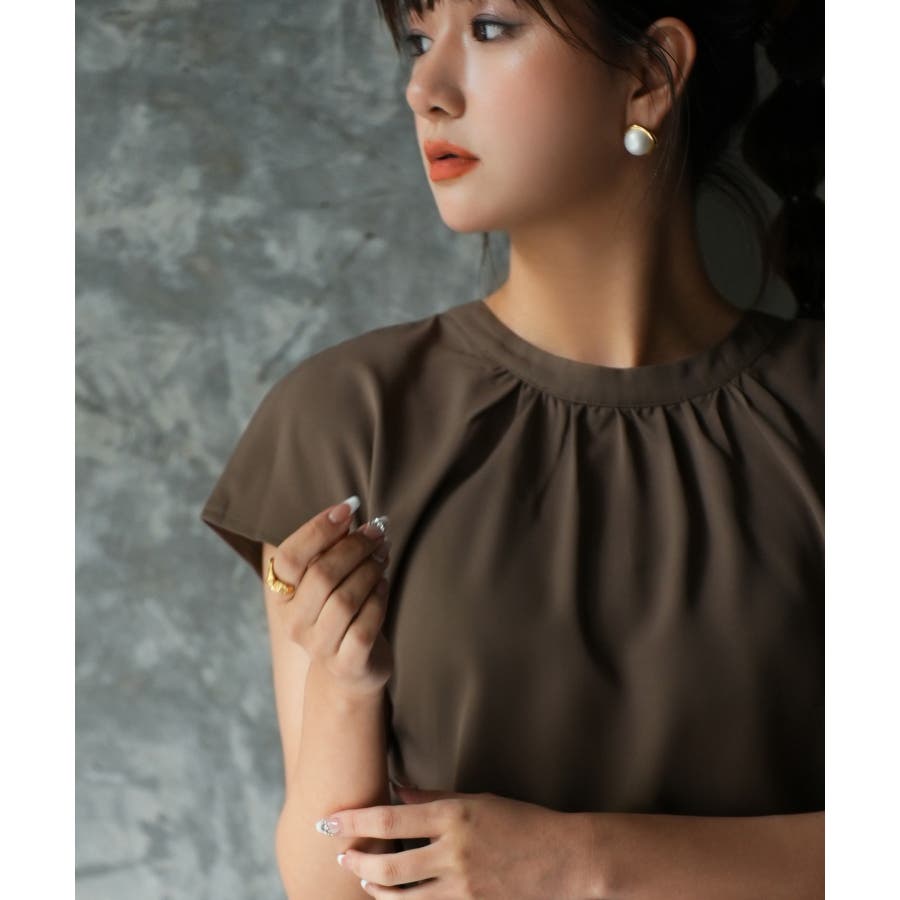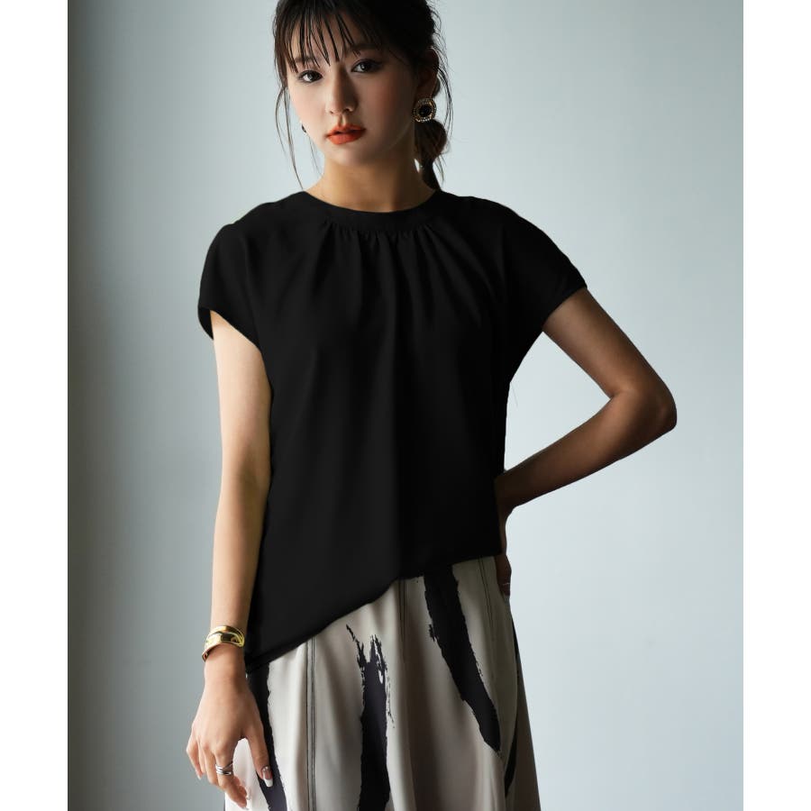 ネック部分のギャザー寄せと三角に開いた前開きの前後2wayデザインが着こなしの幅を広げてくれます。シンプルなのに一枚で大人きれいなコーデが叶います。