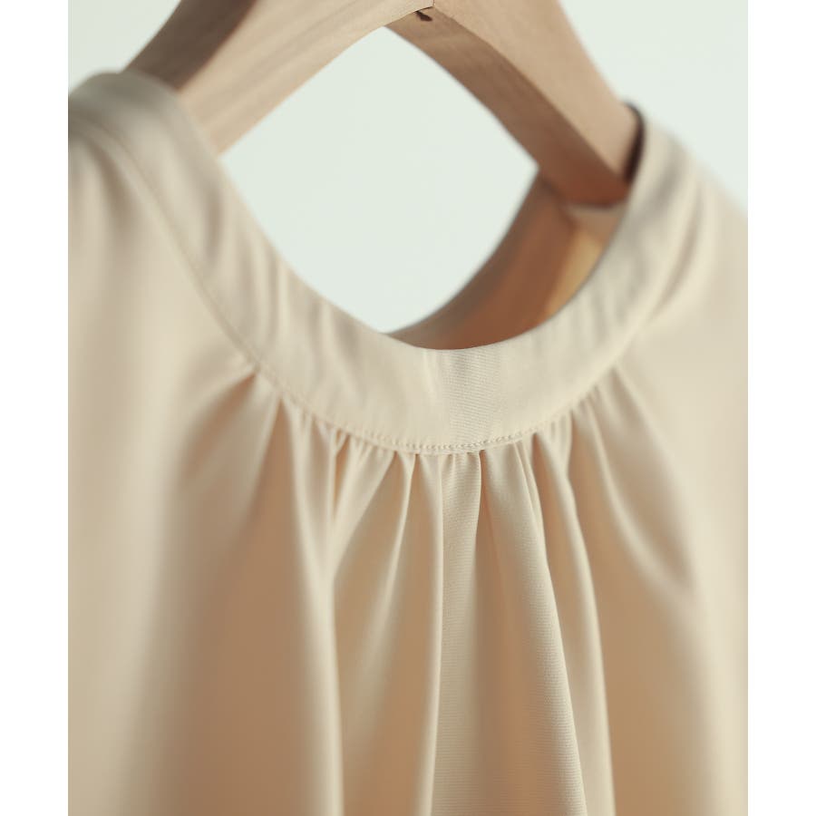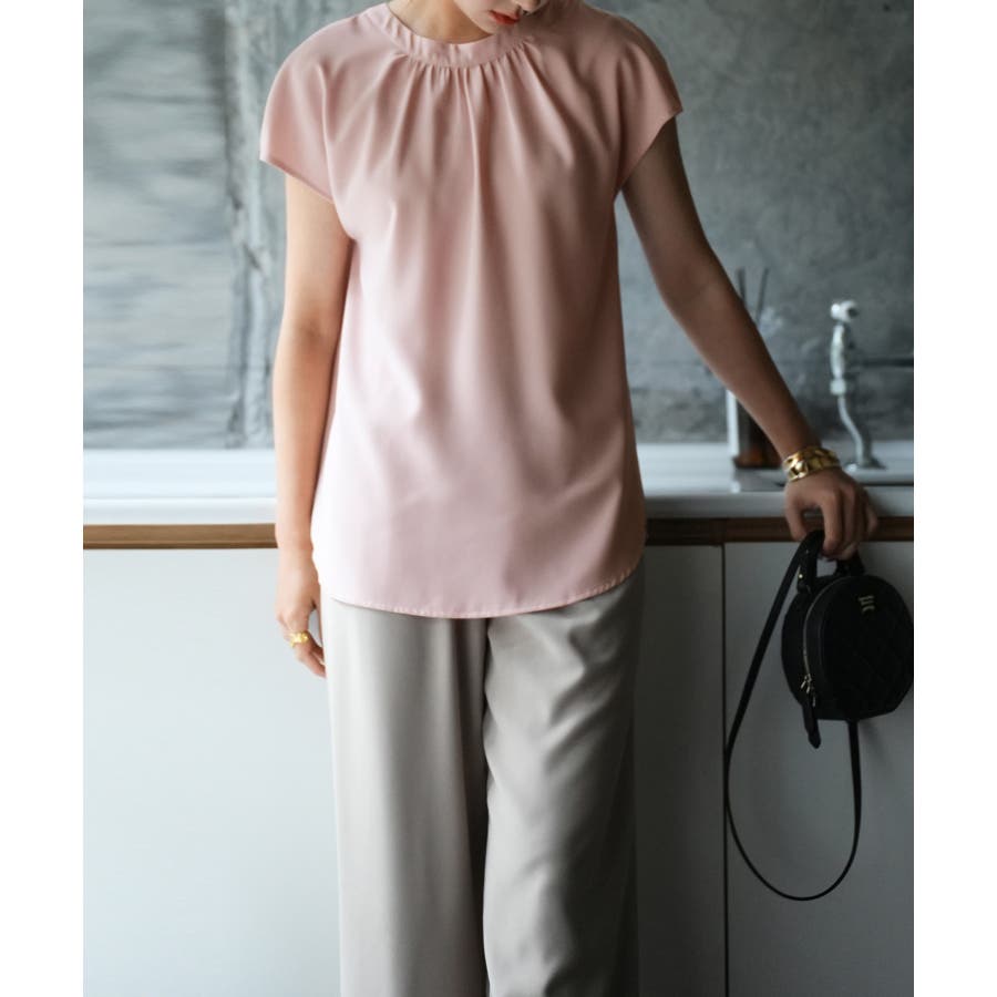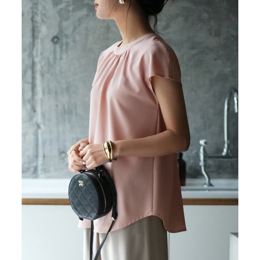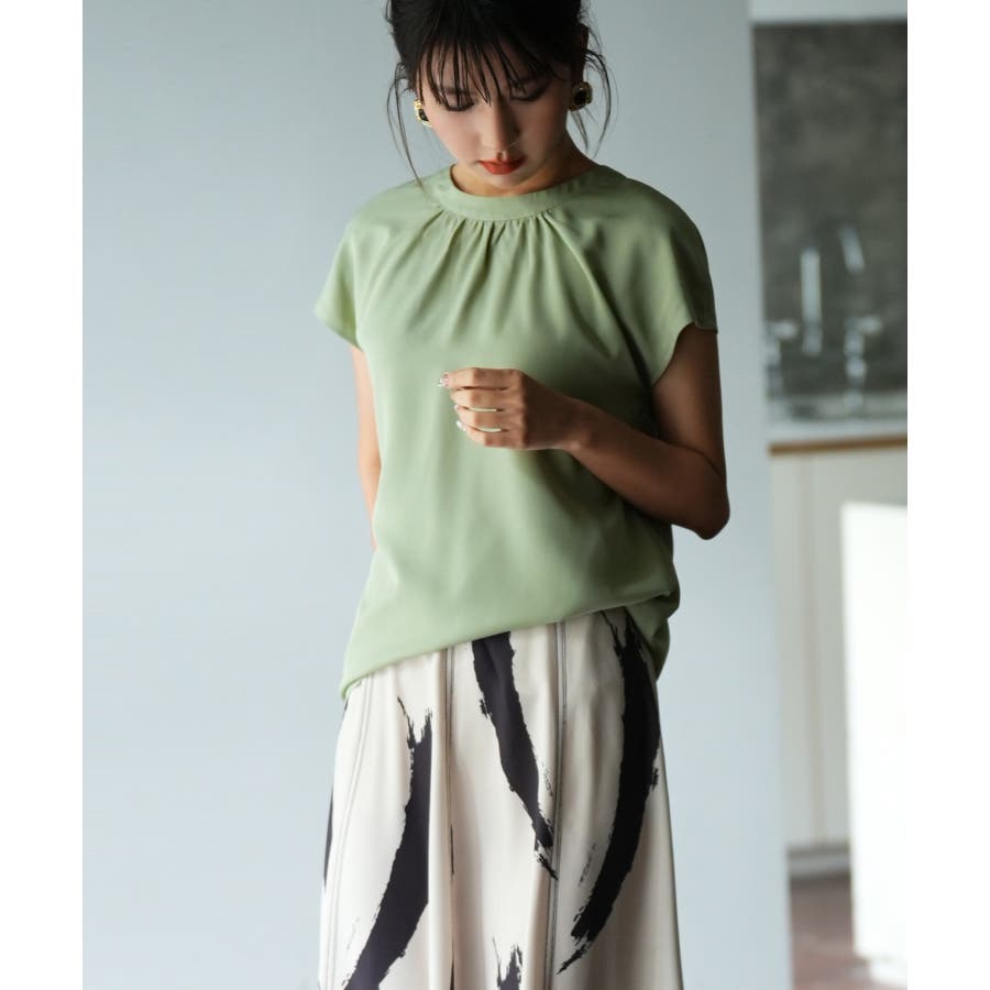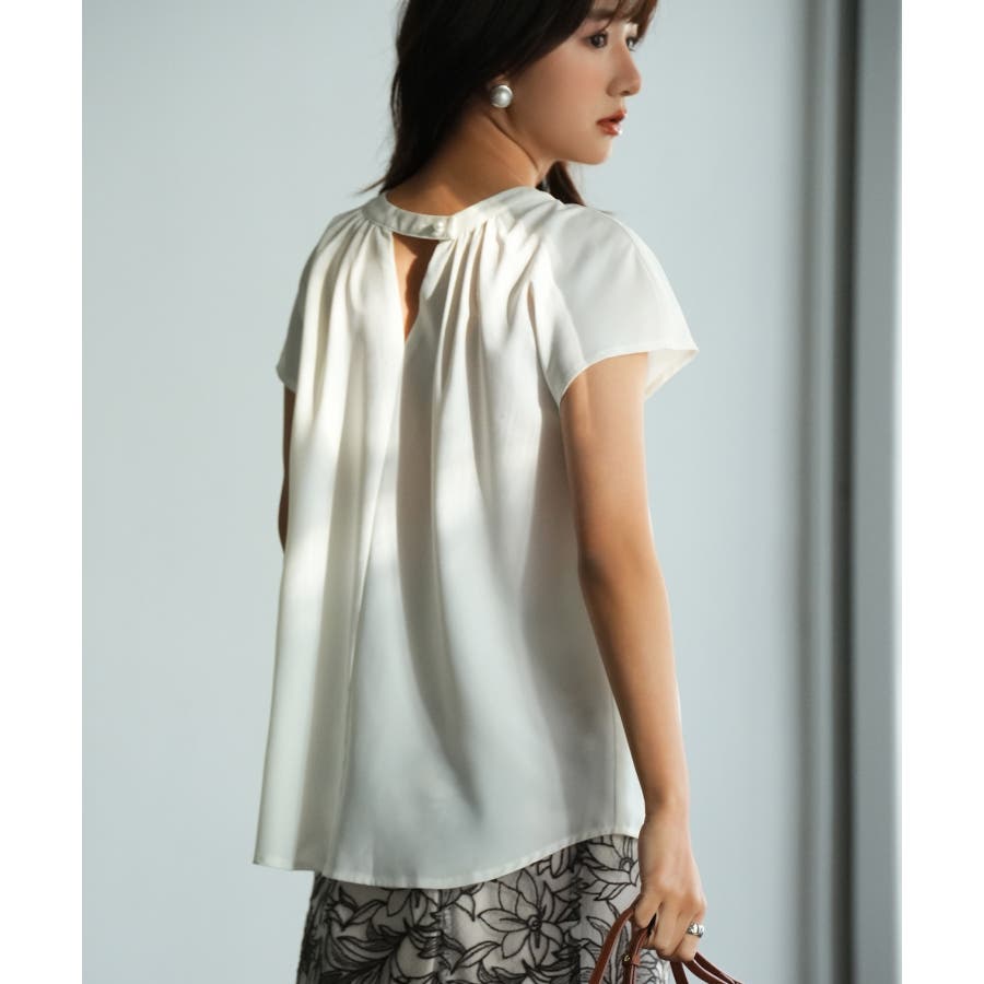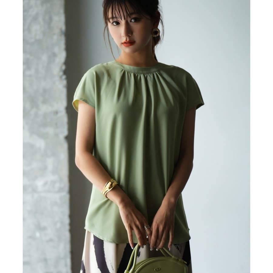 ネック部分のギャザー寄せと三角に開いた前開きの前後2wayデザインが着こなしの幅を広げてくれます。シンプルなのに一枚で大人きれいなコーデが叶います。