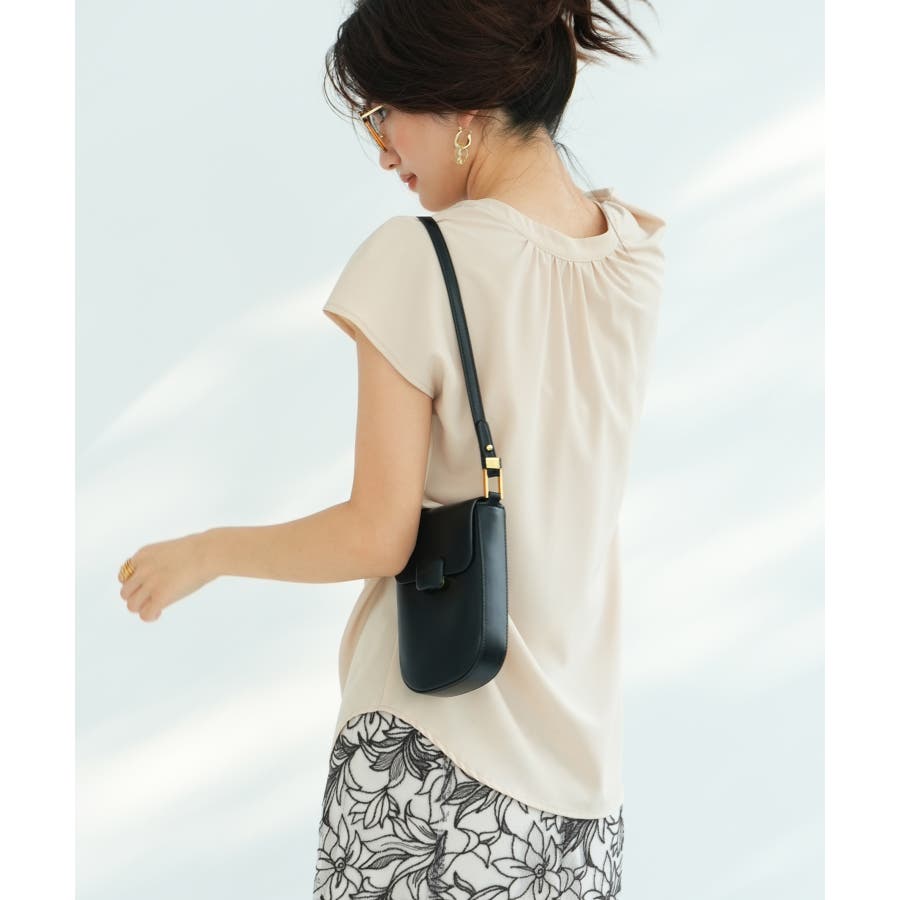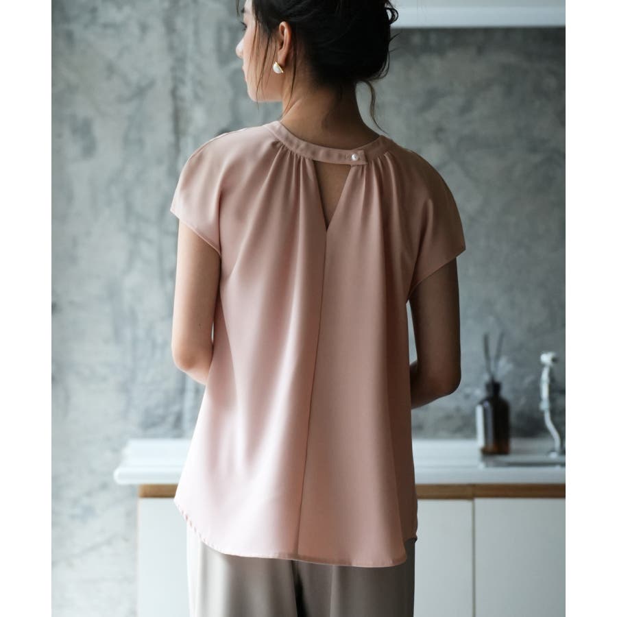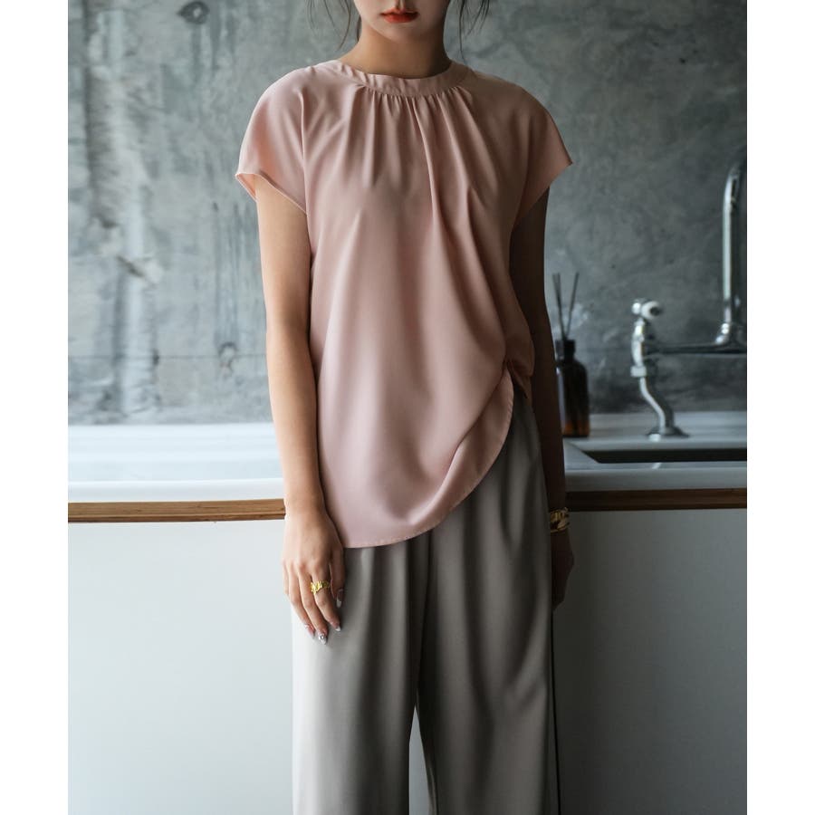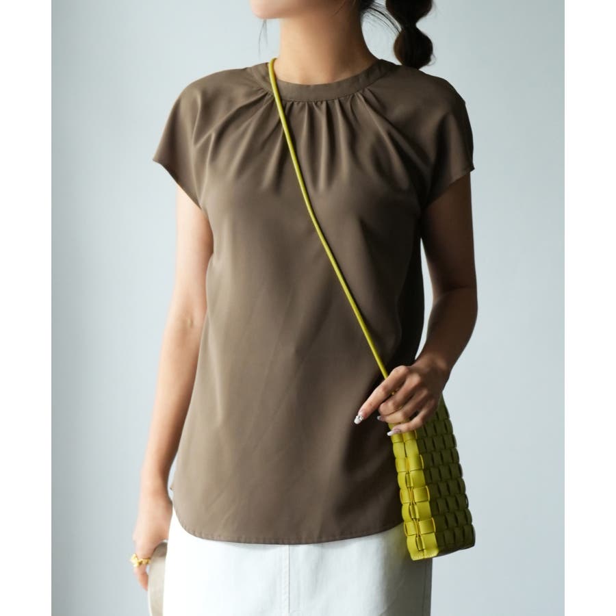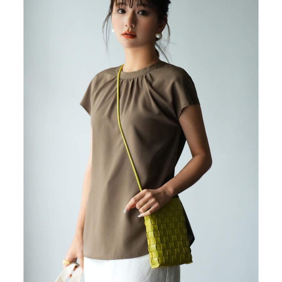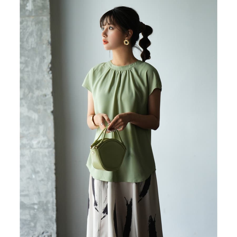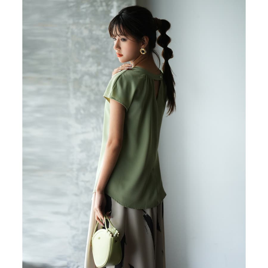 ネック部分のギャザー寄せと三角に開いた前開きの前後2wayデザインが着こなしの幅を広げてくれます。シンプルなのに一枚で大人きれいなコーデが叶います。