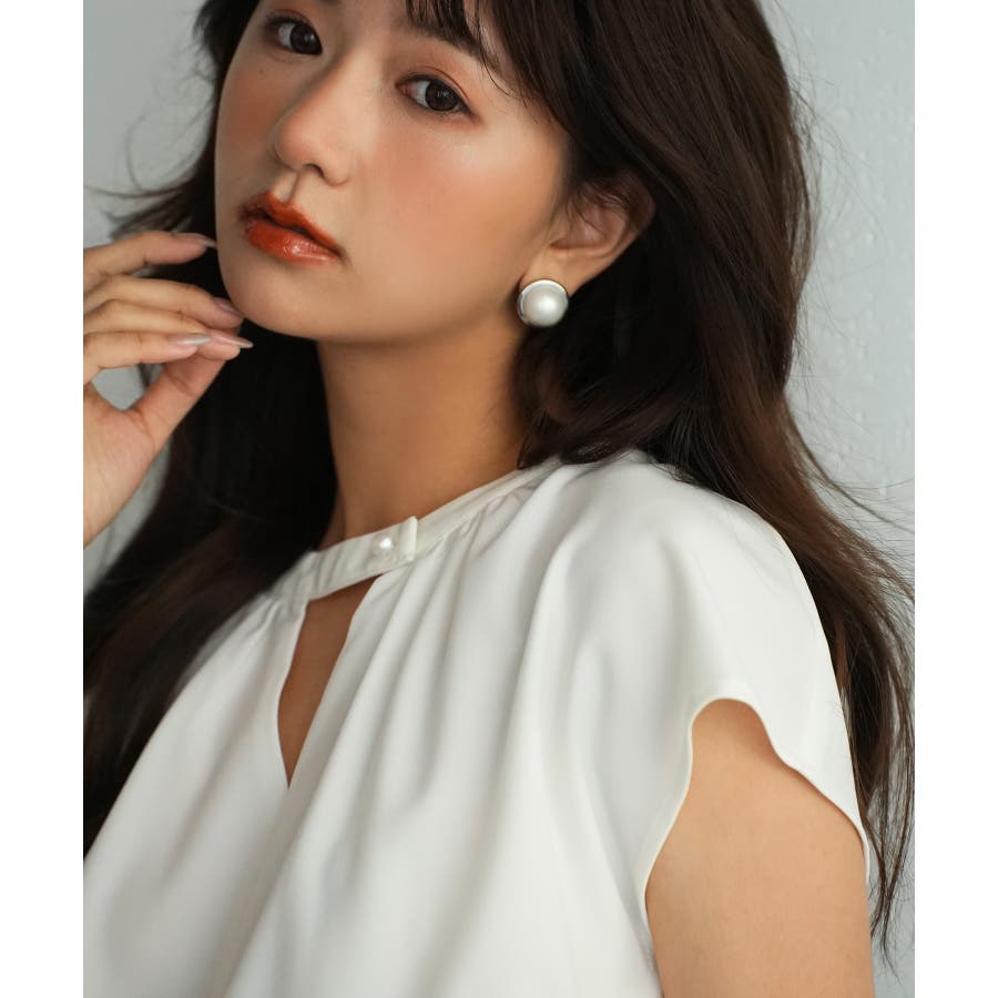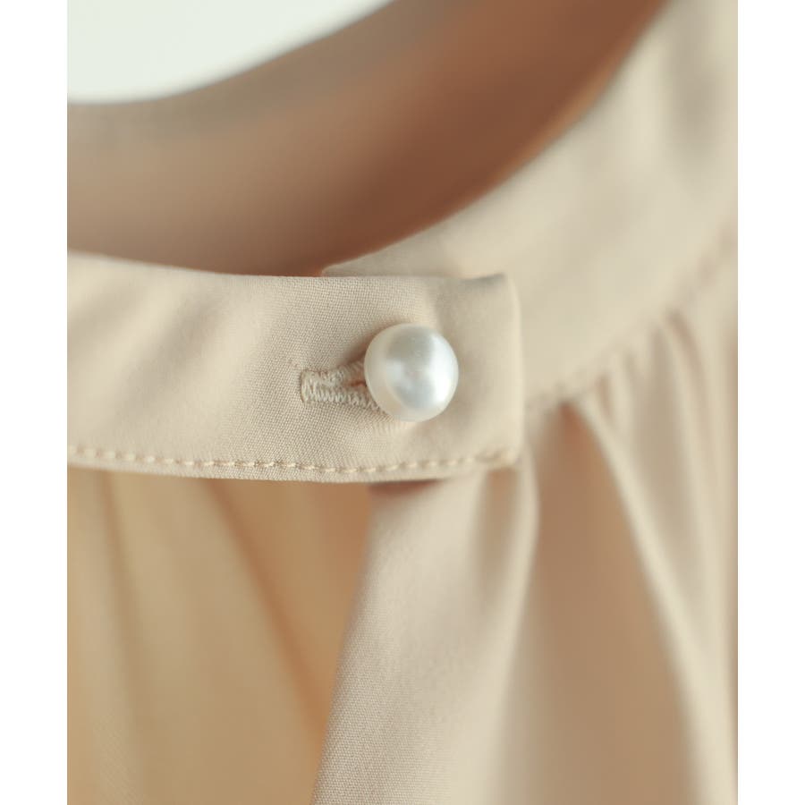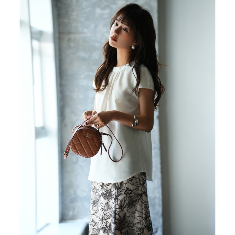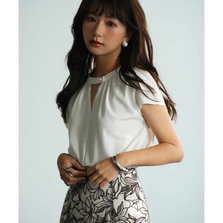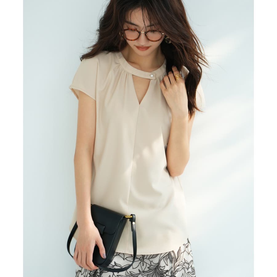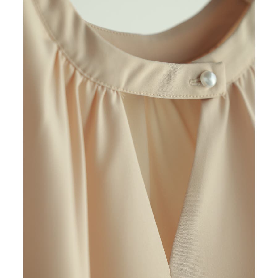 ネック部分のギャザー寄せと三角に開いた前開きの前後2wayデザインが着こなしの幅を広げてくれます。シンプルなのに一枚で大人きれいなコーデが叶います。