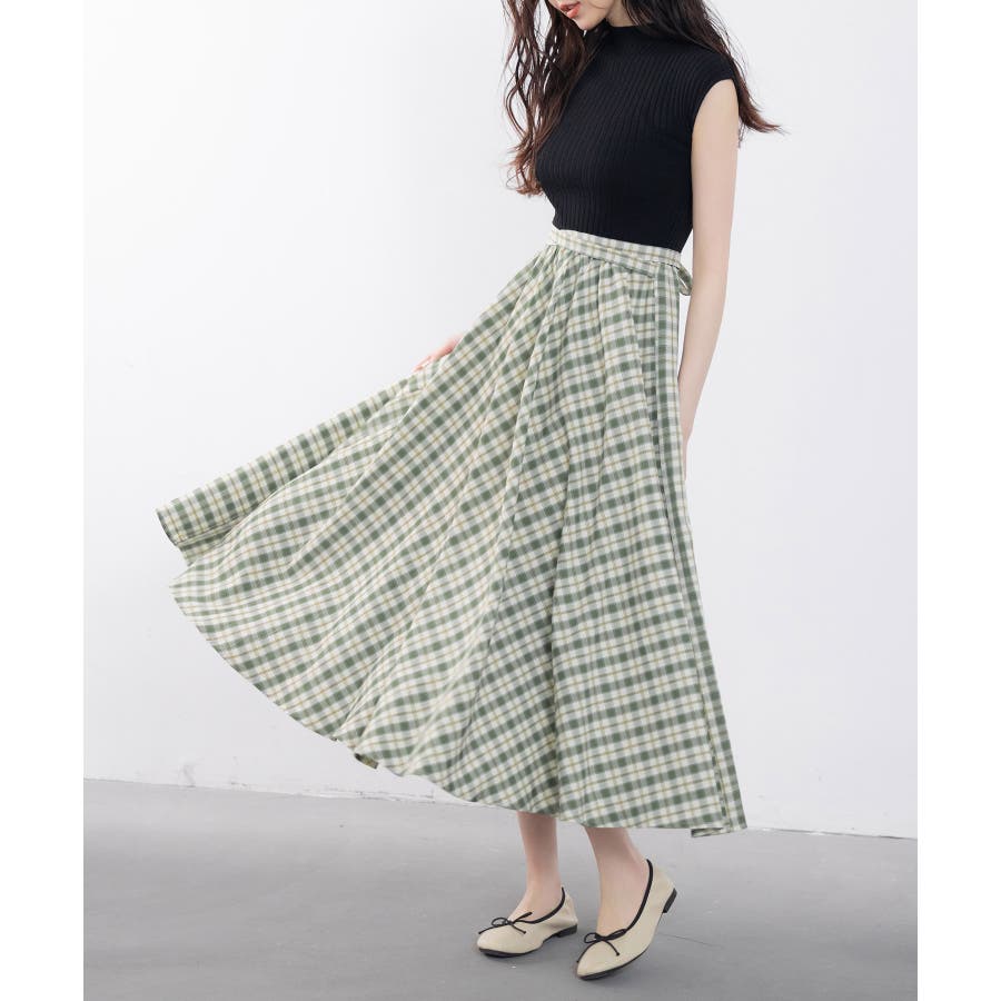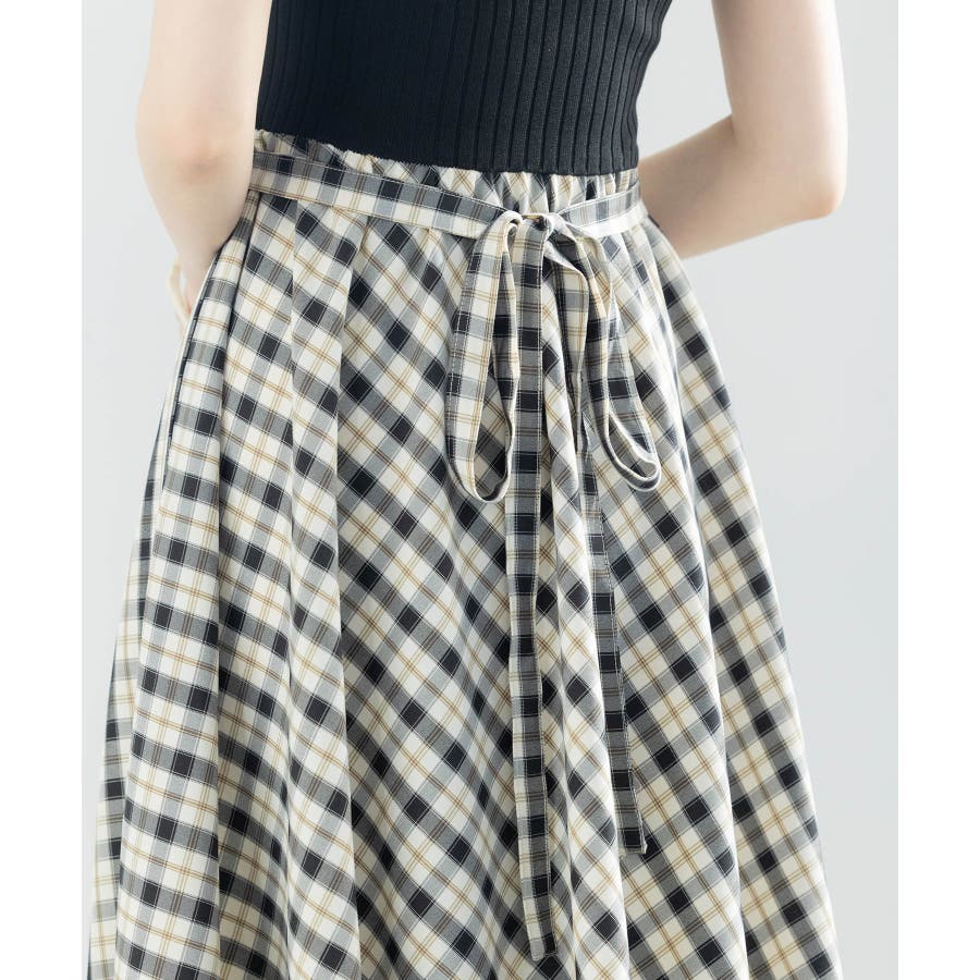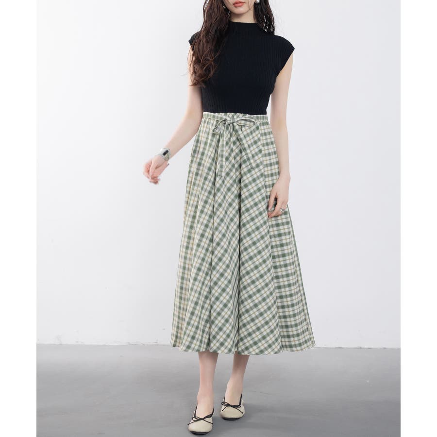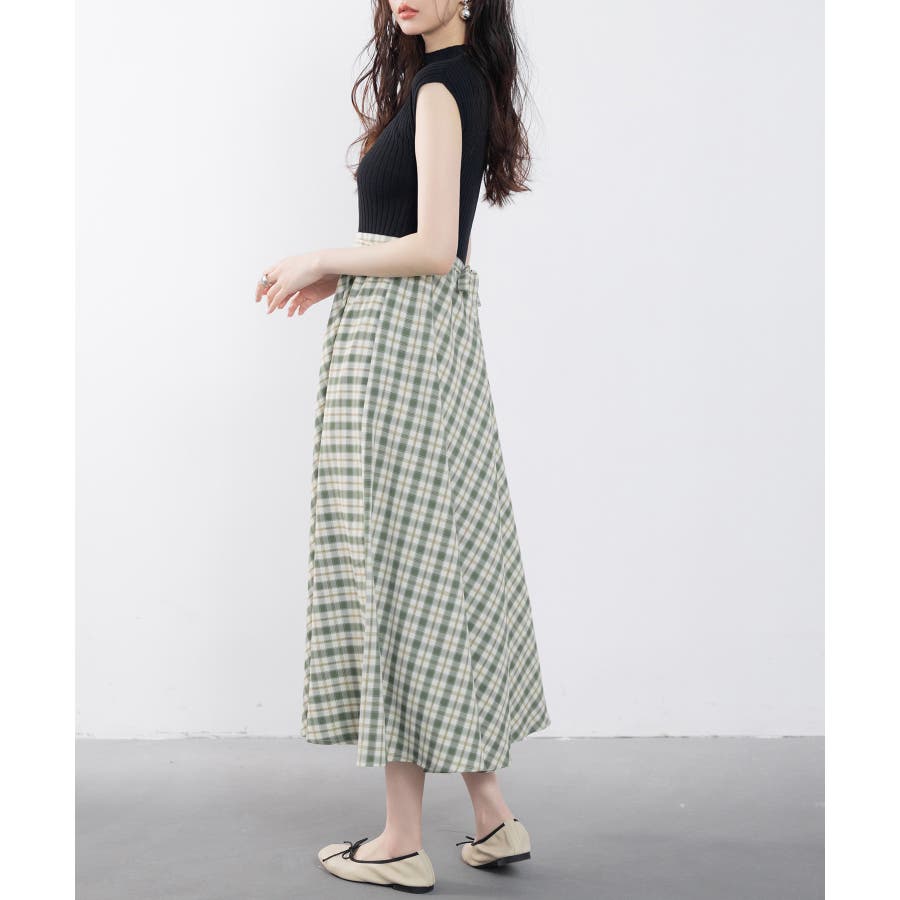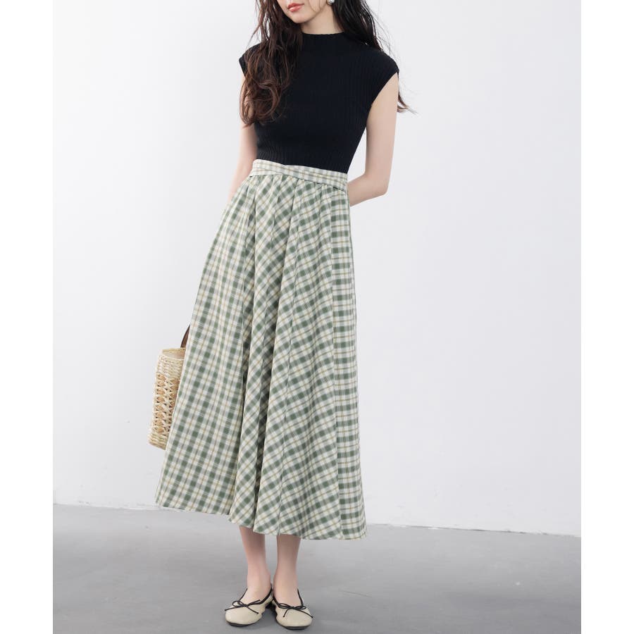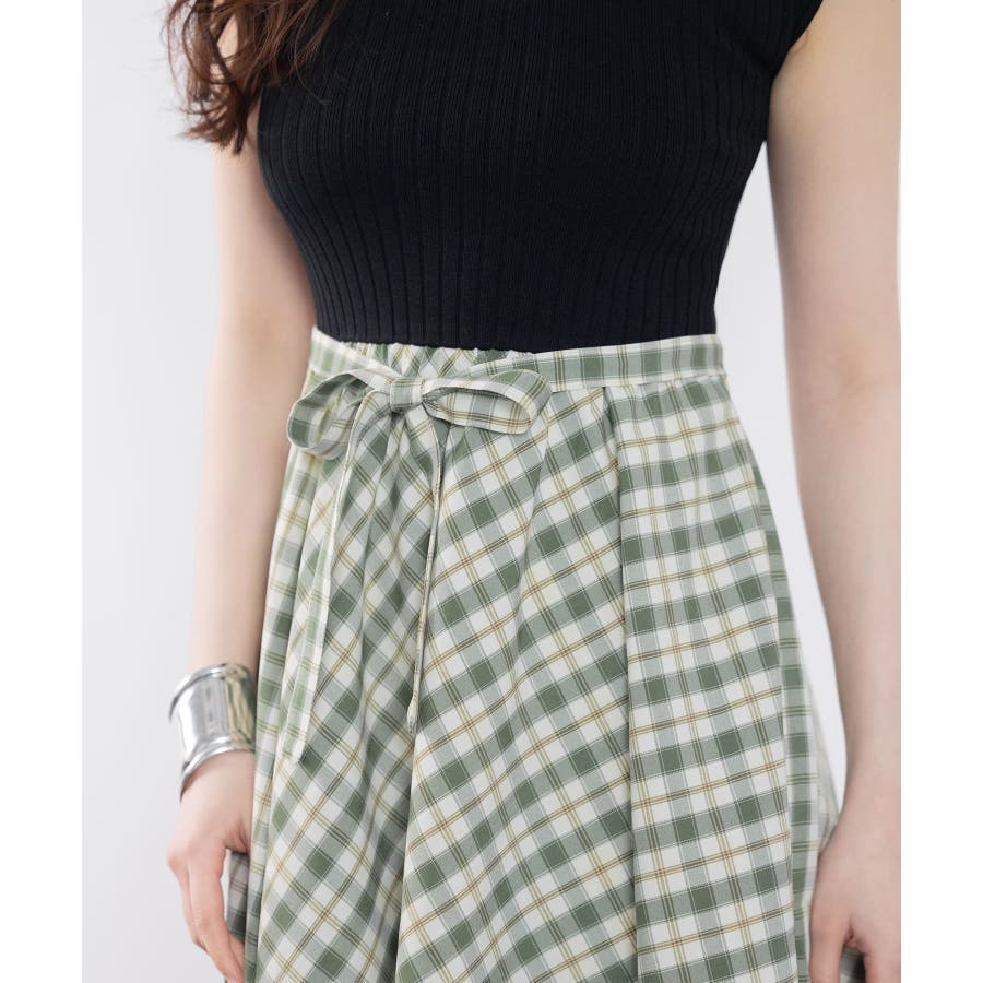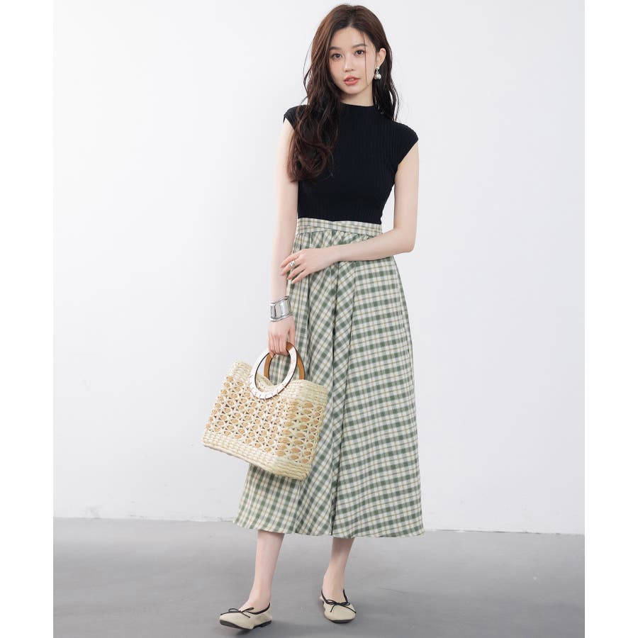接触冷感素材のニットトップスとチェック柄スカートがドッキング。一枚でこなれコーデが完成します。ベルトや薄手の羽織りものをプラスするのもおすすめです。