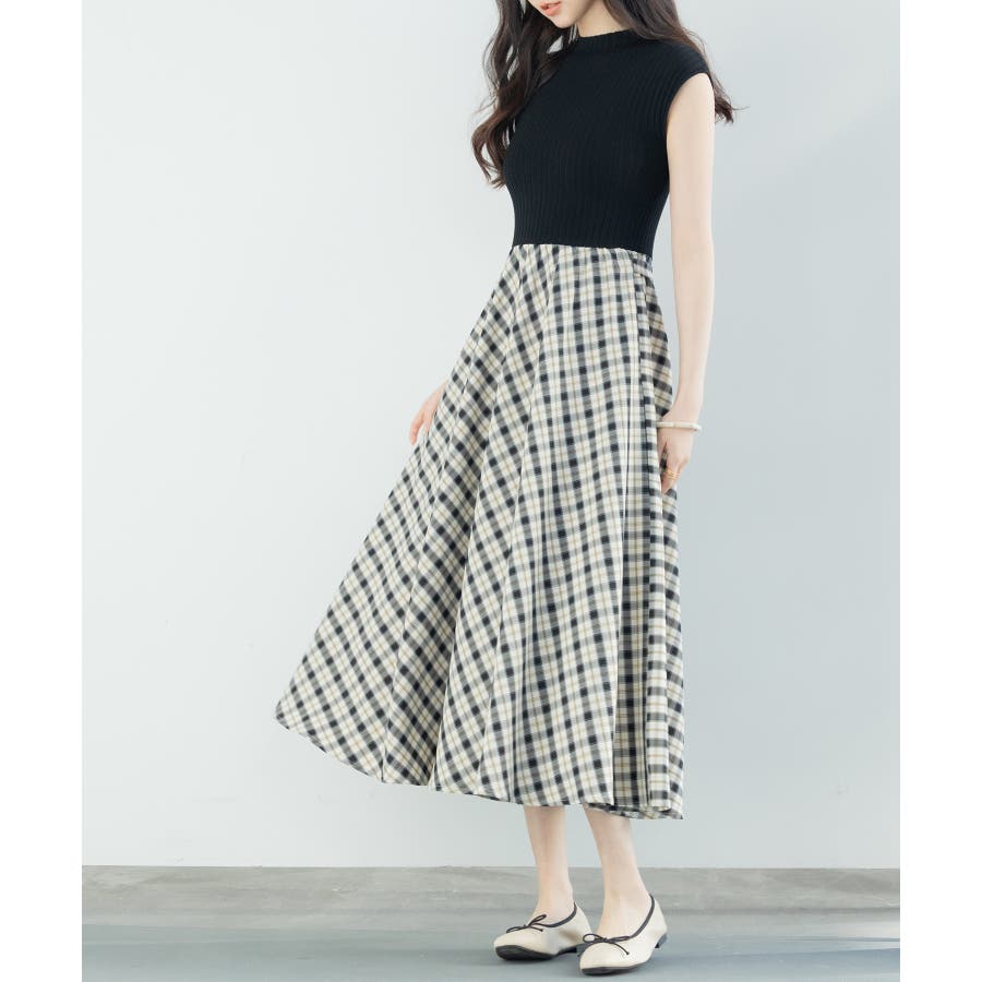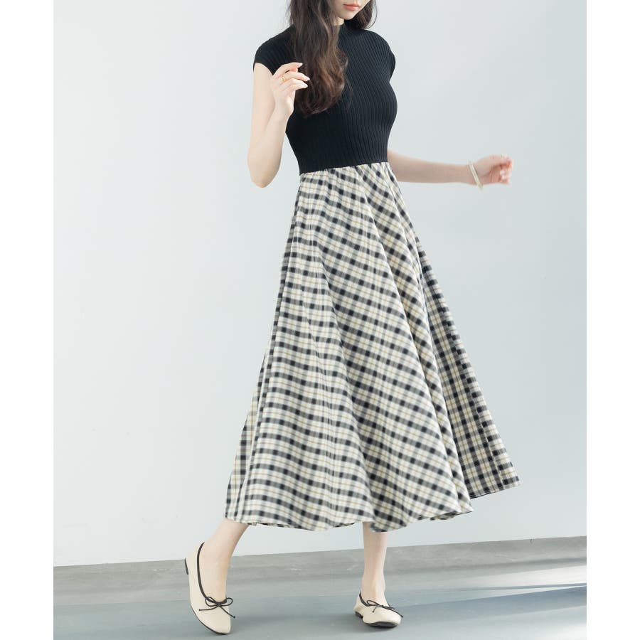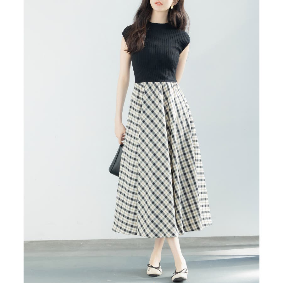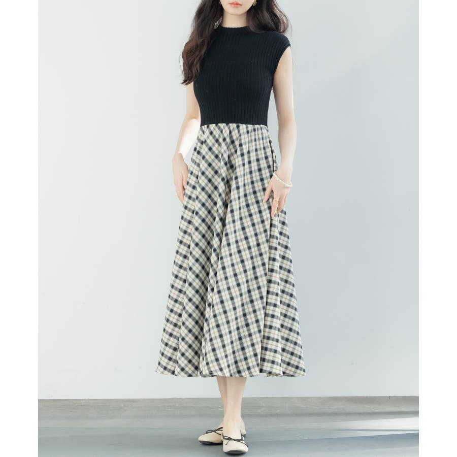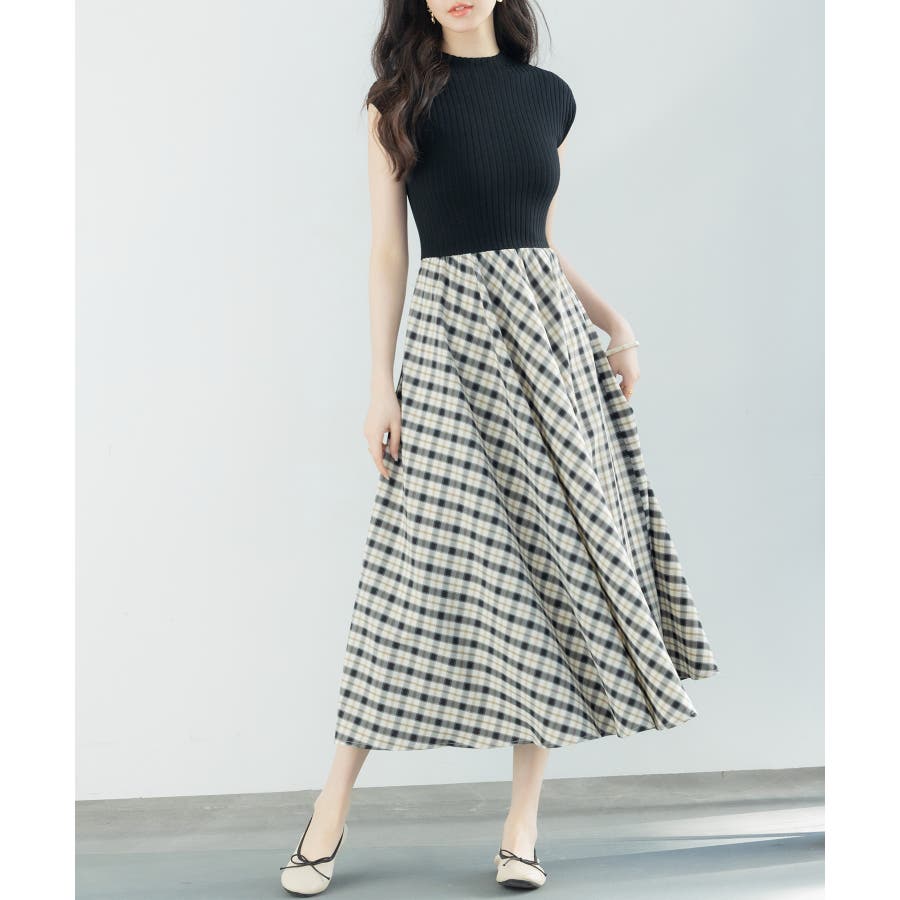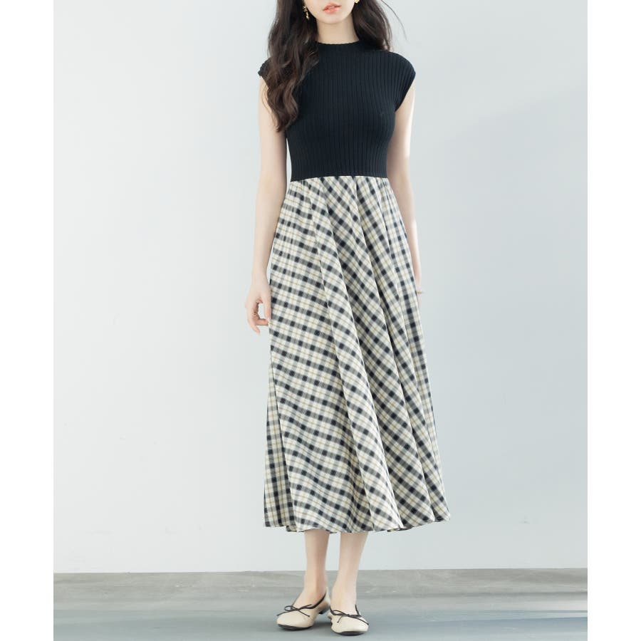 一枚で高見えコーデが完成するニットトップスとチェック柄スカートのドッキングワンピース。
