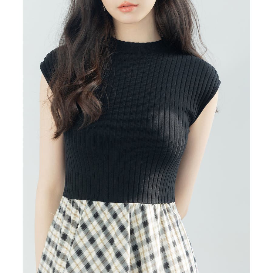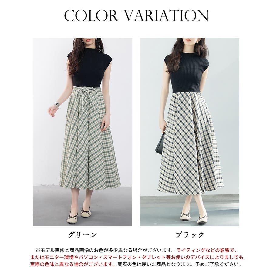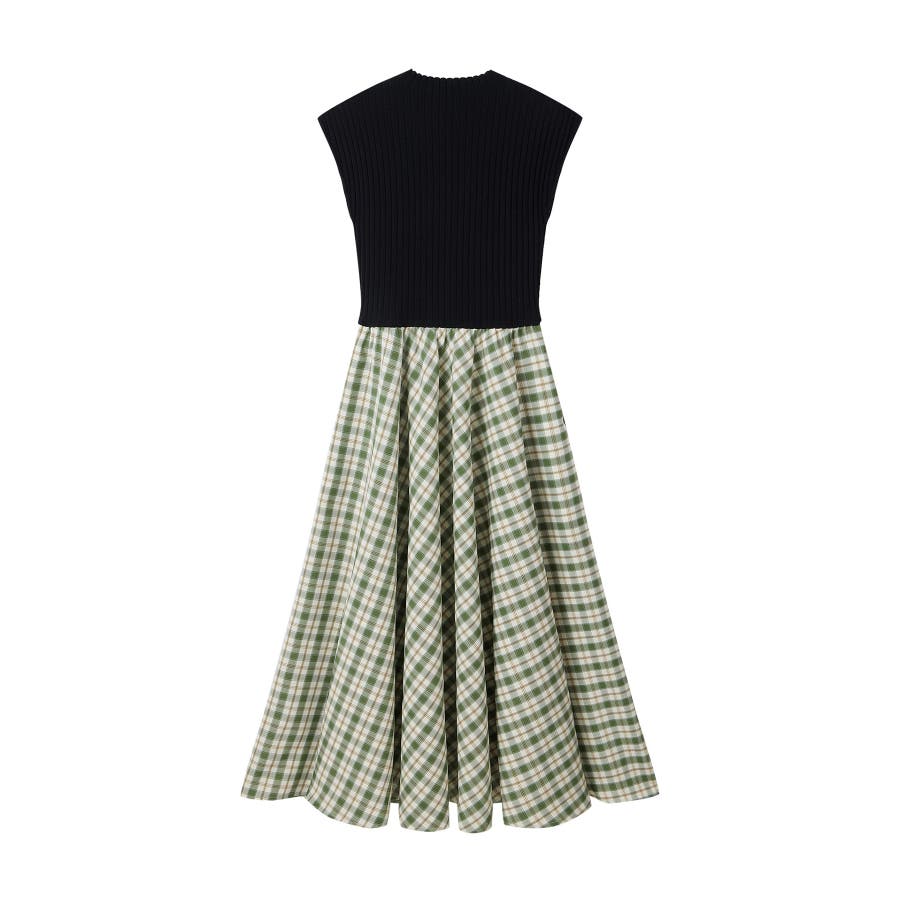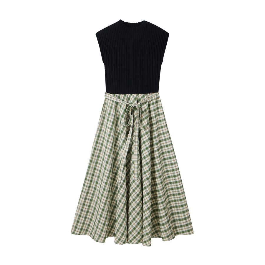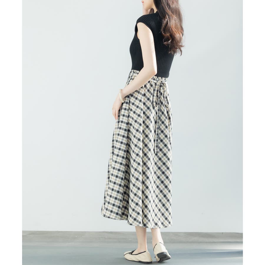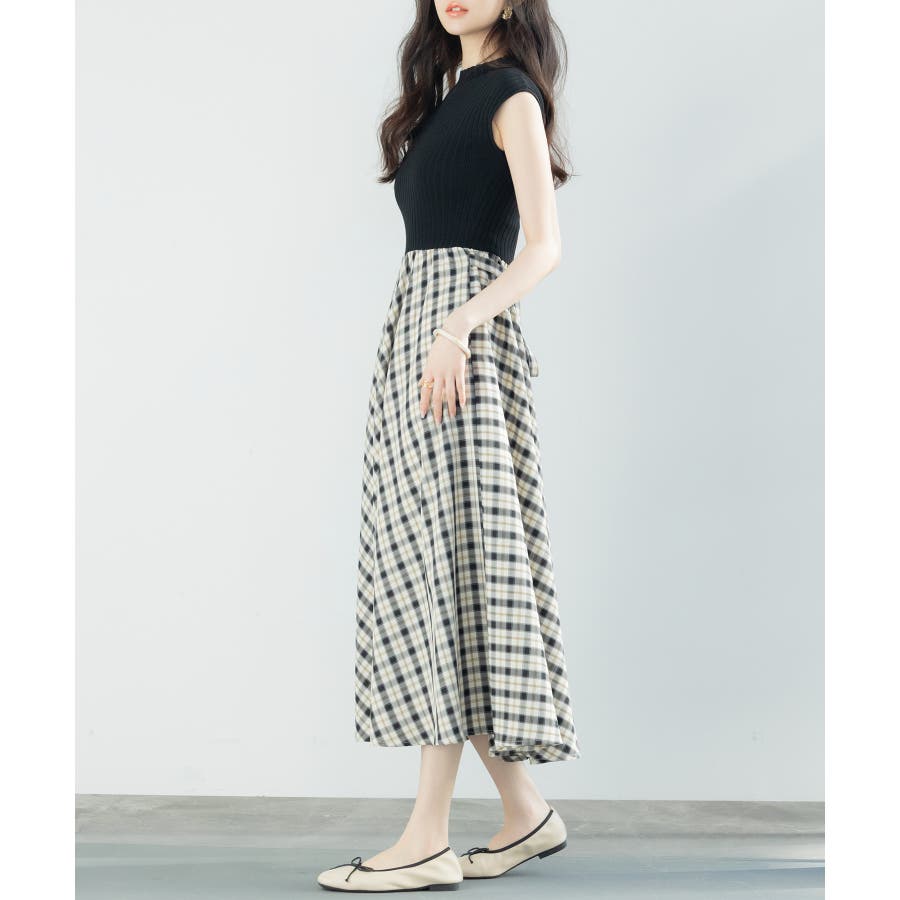 一枚で高見えコーデが完成するニットトップスとチェック柄スカートのドッキングワンピース。