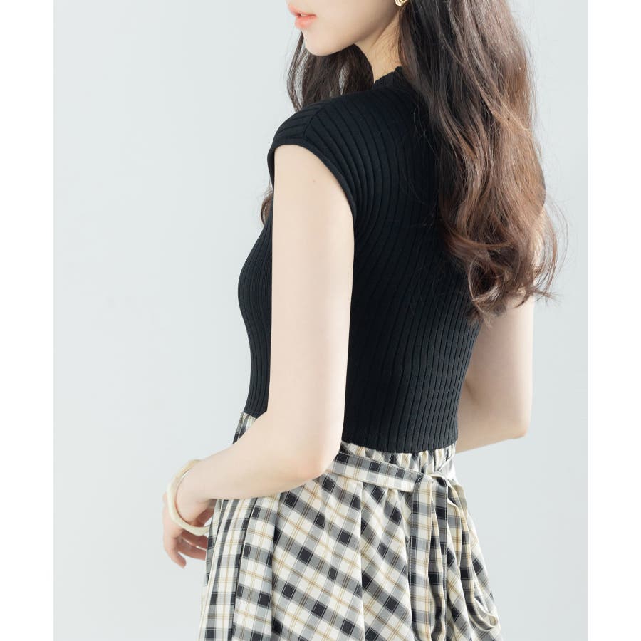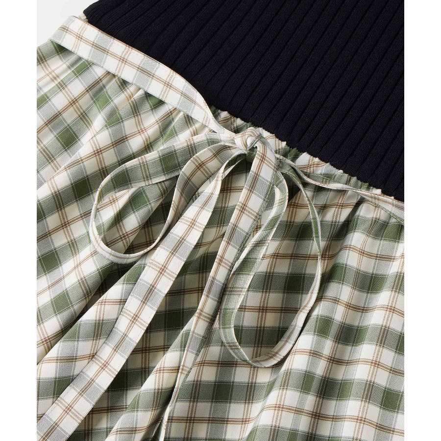 ニットトップスとチェック柄スカートのドッキングワンピース