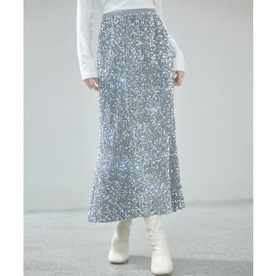 スパンコールきらめくベロア生地のロングフレアスカート。