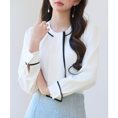 ネックラインとボウタイ、袖カフス部分にあしらわれた細い配色パイピングでオシャレ度アップ。スタイル全体をキリっと引き締めます。