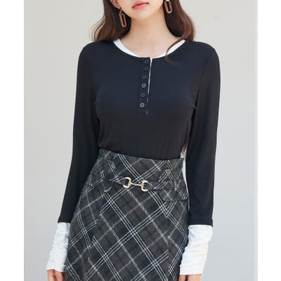 襟元と袖口に配色のカットソーをドッキング。トップスとして一枚で完結するレイヤードデザインです。
