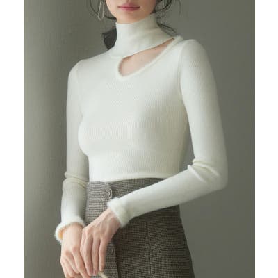 さりげない肌見せのフロントオープンハイネックニットプルオーバー。