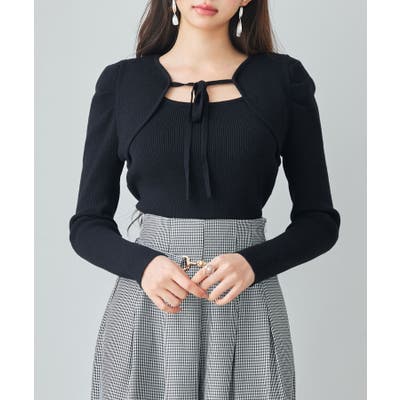 1枚仕立てのプルオーバーですが、前身頃の切り替えとフロントリボンが、インナーにショート丈ボレロを合わせたようなレイヤード感を出し、1枚で重ね着風コーデが完成します。