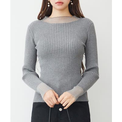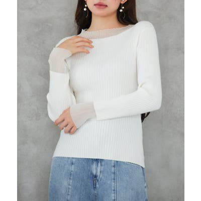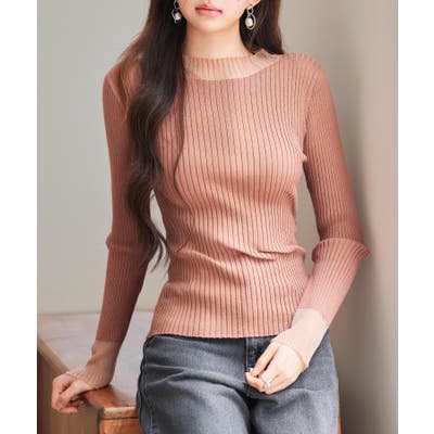 襟口と袖口にシアー素材をドッキングした一枚でこなれ感を演出するリブニットトップス。