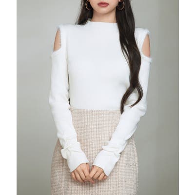 肩見せで色っぽい秋冬スタイルに仕上がるカットアウェイ・ショルダーボトルネックリブニット。