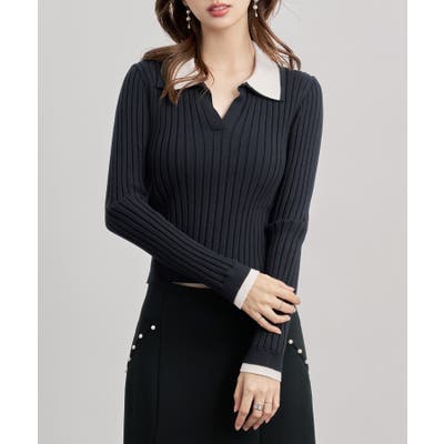 襟と袖口の二色使いがオシャレな重ね着風リブニットプルオーバー。