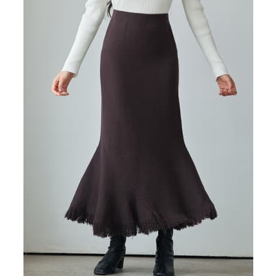 一枚でこなれ見えするフリンジ付きのマーメイドニットロングスカート。