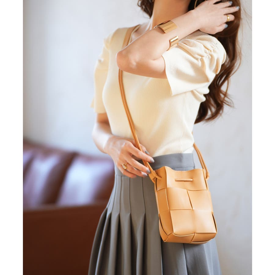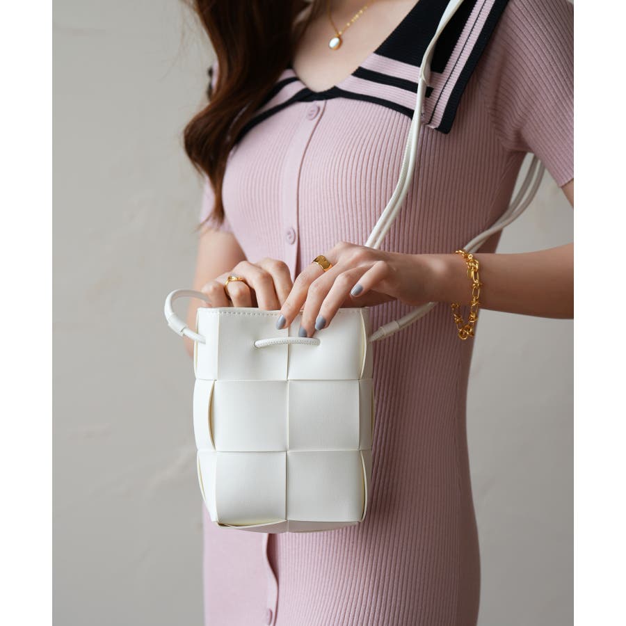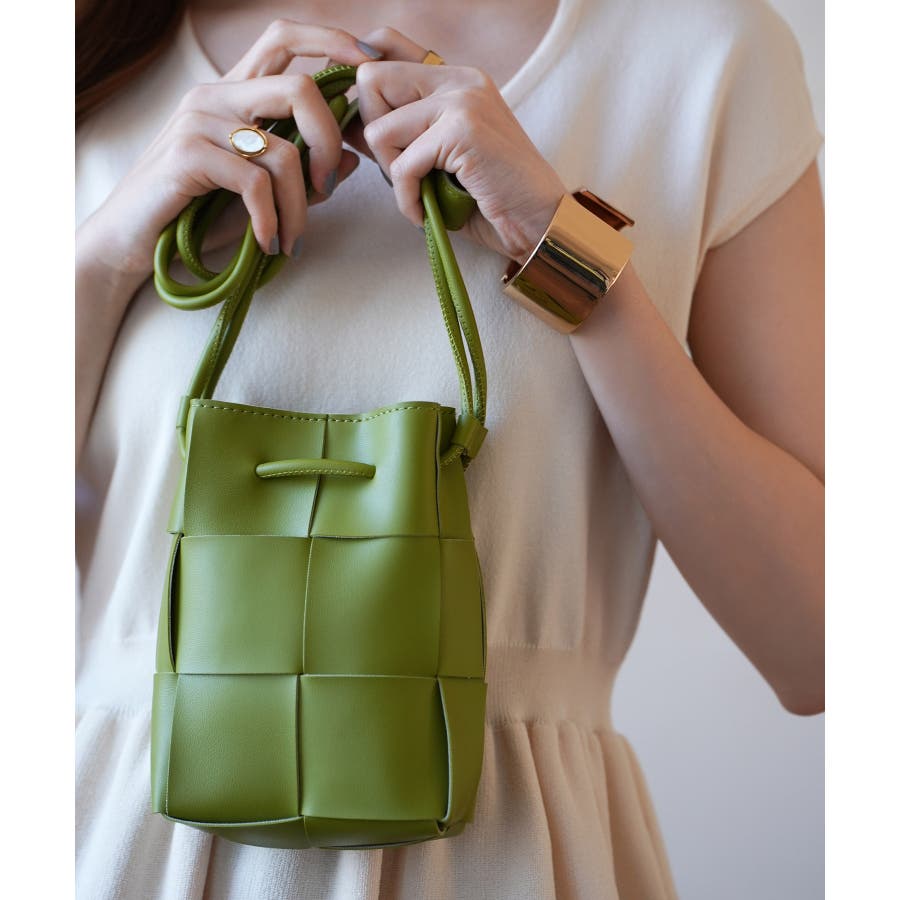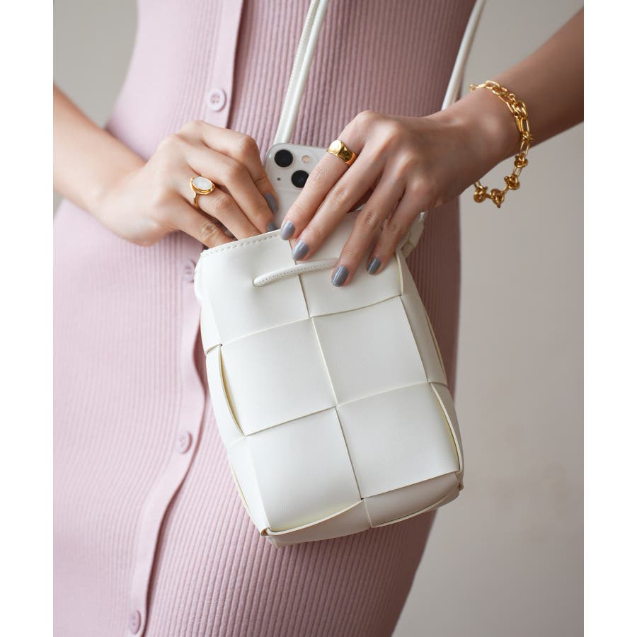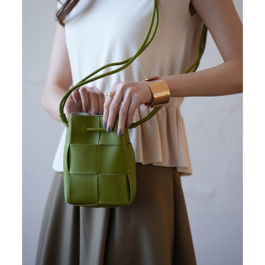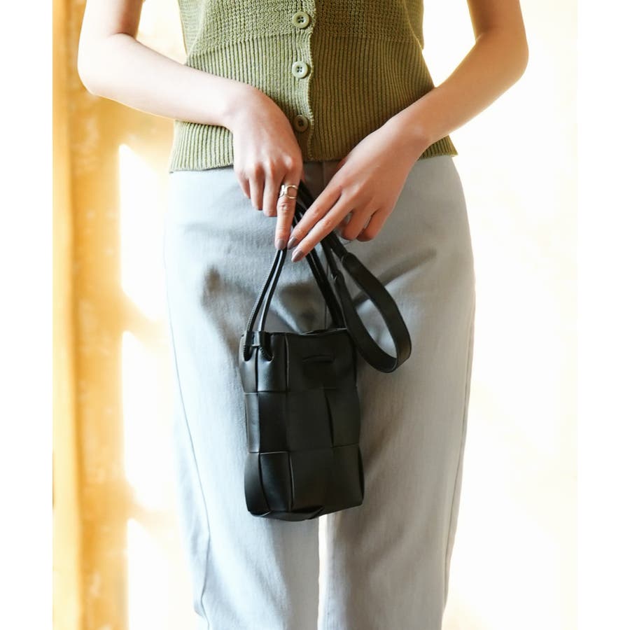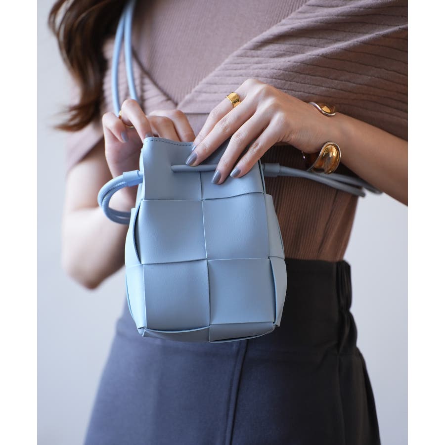 レザーの重なりが美しいメッシュデザイン。高級感もあり大人なスタイルにも映える華やかな存在感がGood。収納のしやすいスクエア型なので、最小限の荷物を入れてミニマルなお出かけを楽しむことができます。