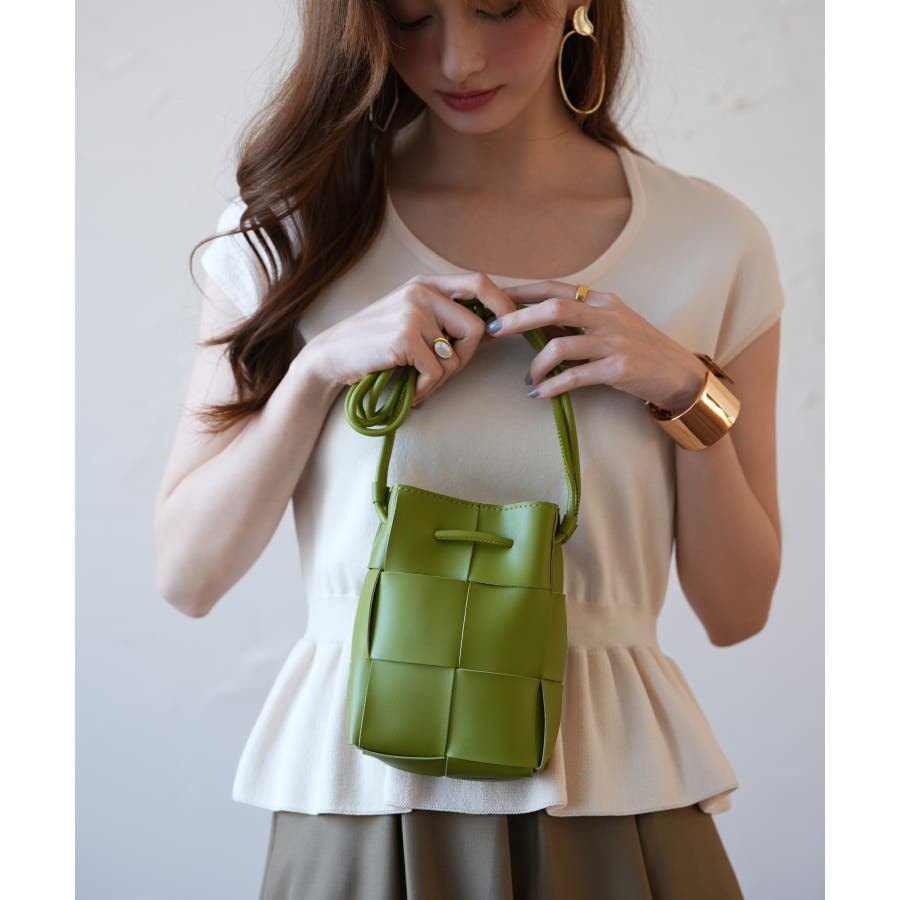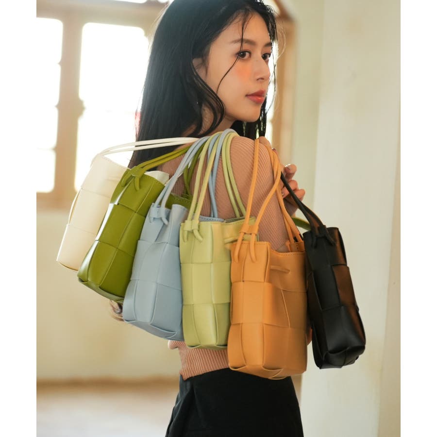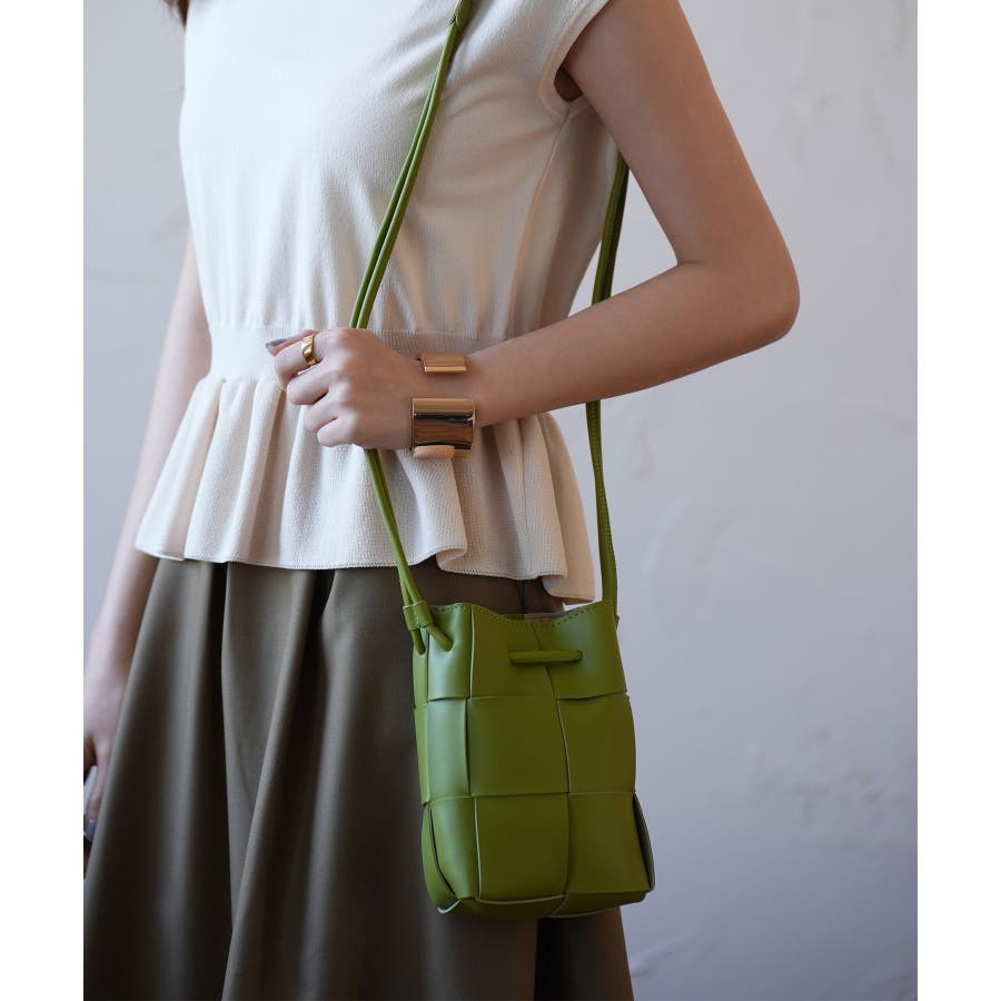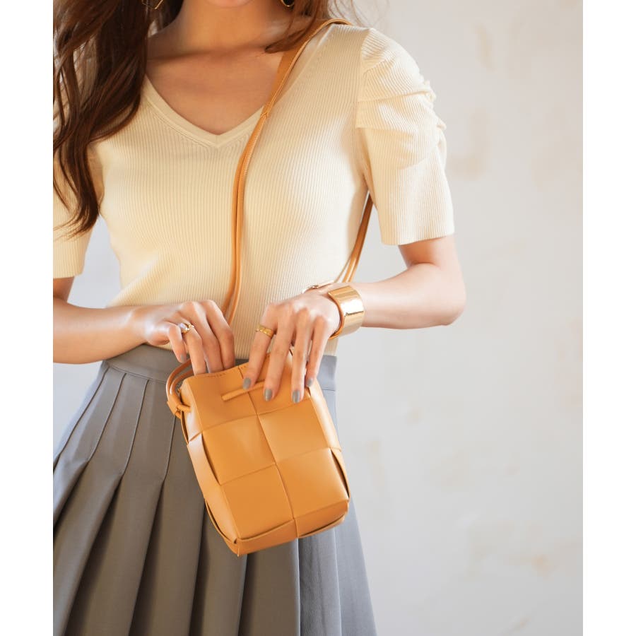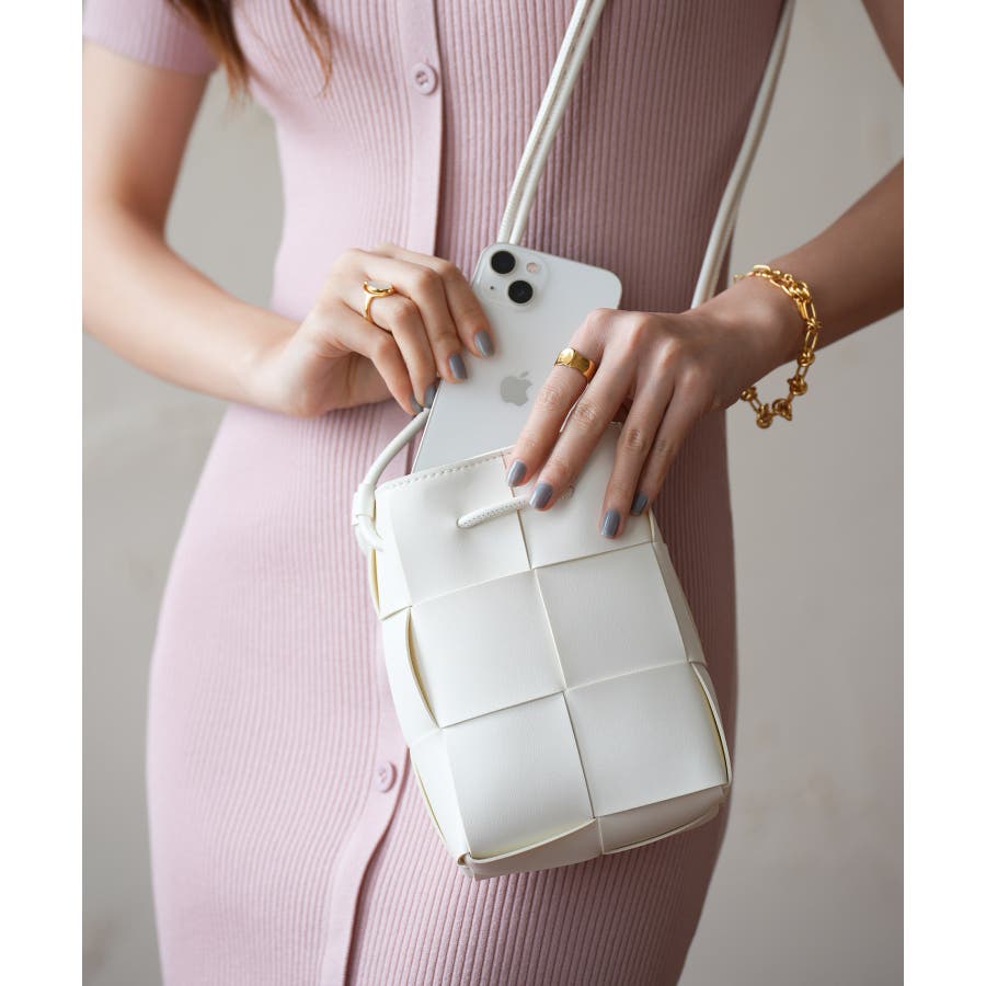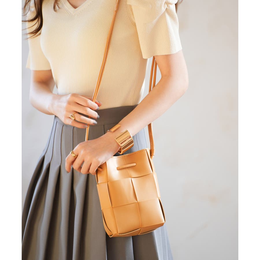 レザーの重なりが美しいメッシュデザイン。高級感もあり大人なスタイルにも映える華やかな存在感がGood。収納のしやすいスクエア型なので、最小限の荷物を入れてミニマルなお出かけを楽しむことができます。