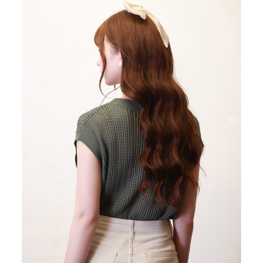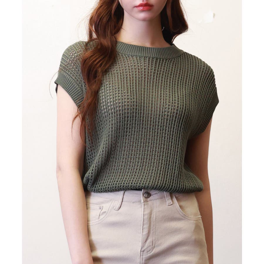 清涼感のある透かし編みニットは春夏シーズンにぴったり。キャミソールやワンピースの上に重ねるなど、インナー次第でさまざまな着こなしを楽しめるのが魅力です。襟ぐりと袖口部分はリブ切り替えになっているので着崩れもしにくく、メリハリのある着こなしを演出します。