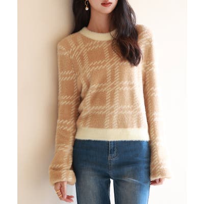 ふんわり柔らかいシャギー素材で着心地抜群のクルーネックニット編みトップス。