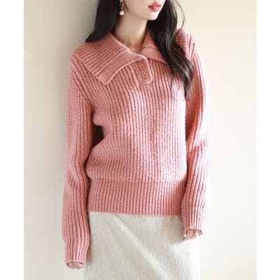 ハーフボタンで折り返しができるボリュームたっぷりの襟がアクセント。シンプルなニットながらも華やかさをプラスします。