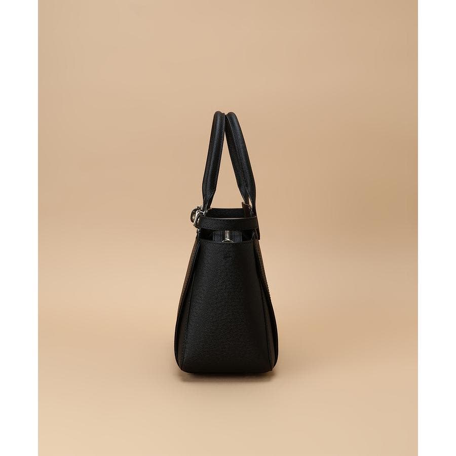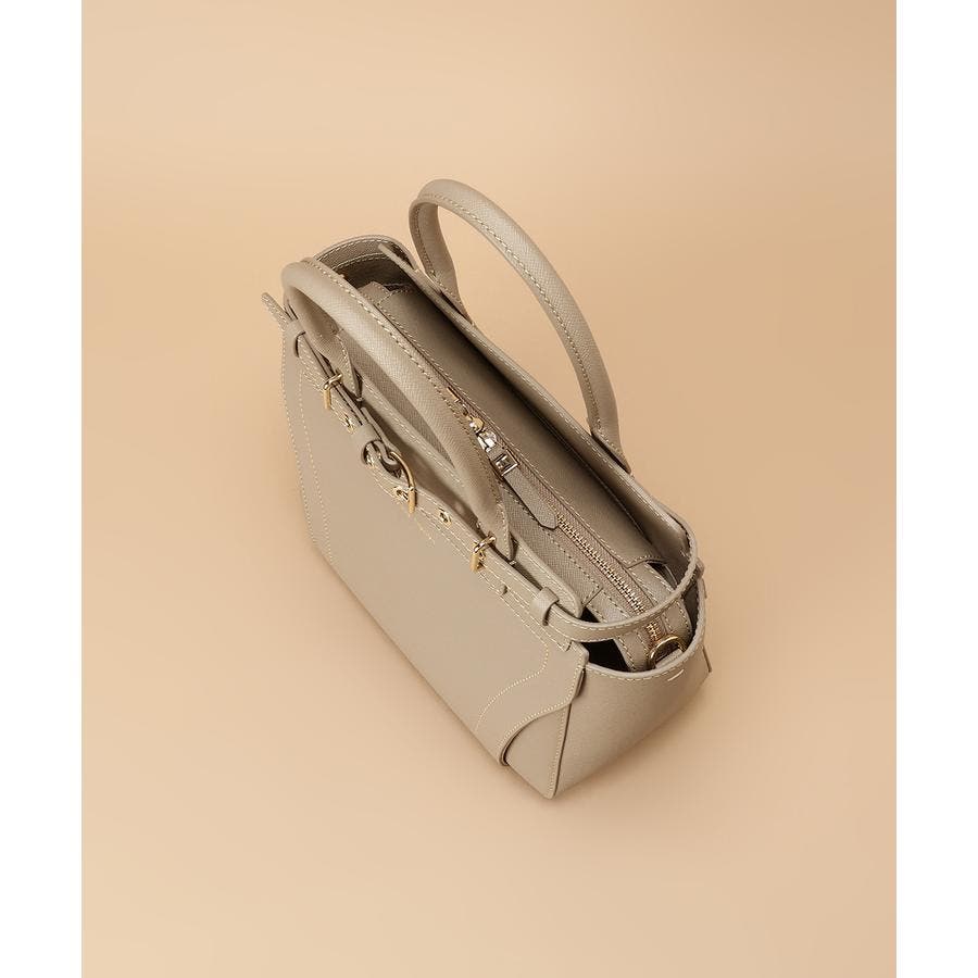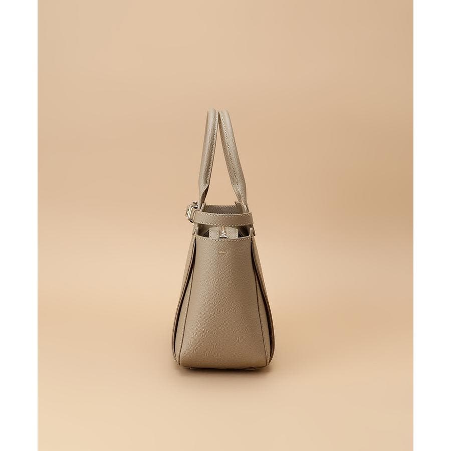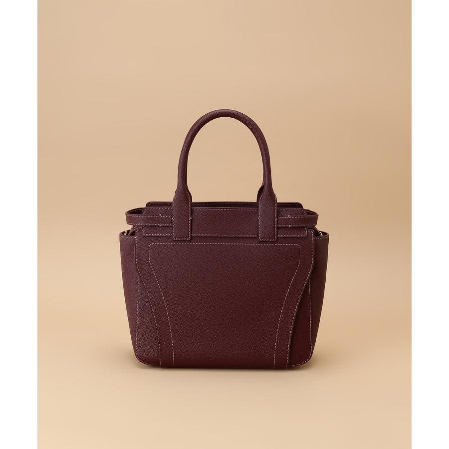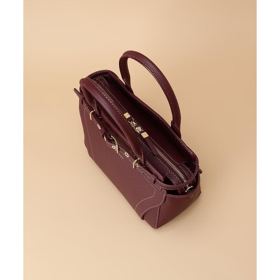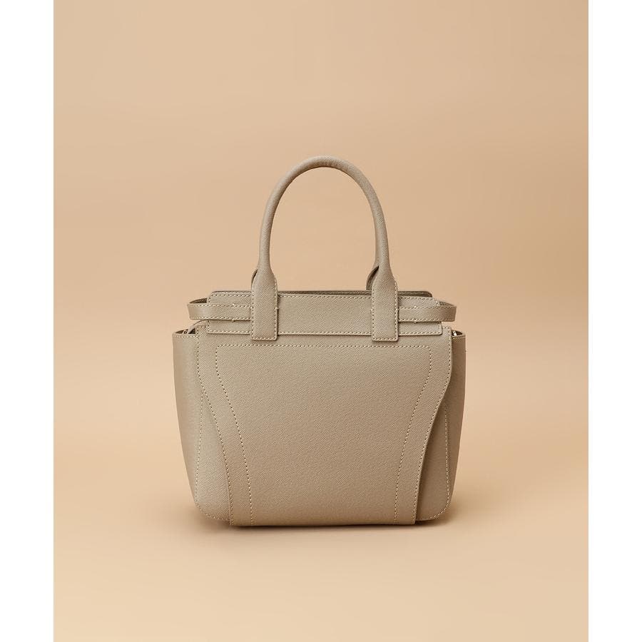 ベルトとステッチデザインが印象的なスプリットレザーのハンドバッグ。