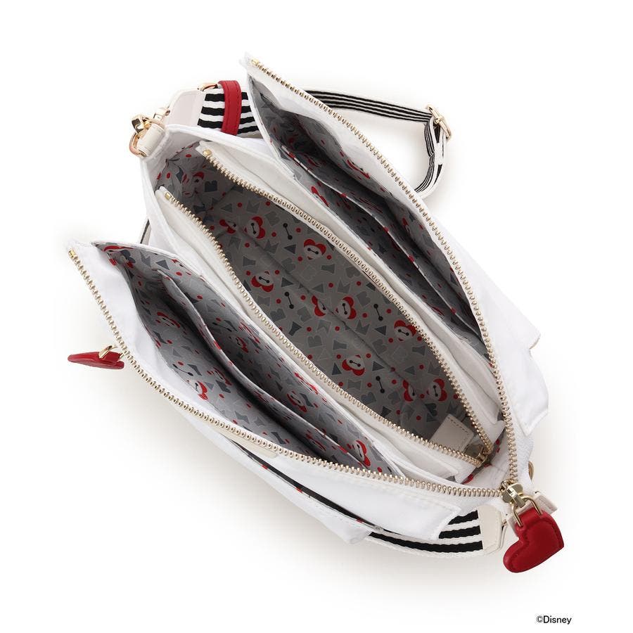 フロント部分は深めのポケットになっているのですぐにとりだしたいスマホやパスケースの収納に最適でポケット内部にはフック付きのストラップがついているので、IDケースなど金具がついているアイテムに繋げて収納できるので旅先でも安心です。内装はハート型の「ベイマックス」のデザインやポップなテイストの文字を組み合わせたオリジナルの総柄の裏地を使用しているので中を開けても作品の世界観を楽しめるアイテム。