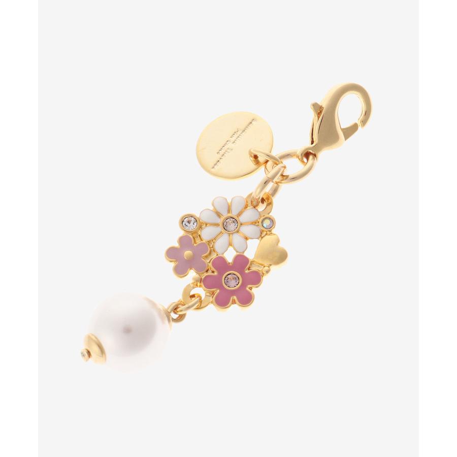 花びらの枚数の違う3種類のお花を組み合わせたファスナーチャーム。コットンパールを一粒プラスし、春のあたたかい風を感じられるようなデザイン。お花のチャームで気分もアップ!