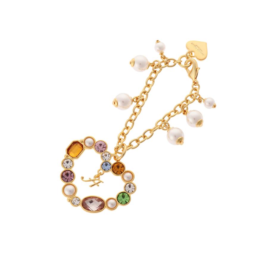カラフルなストーンがあしらわれた、イニシャルバッグチャーム。