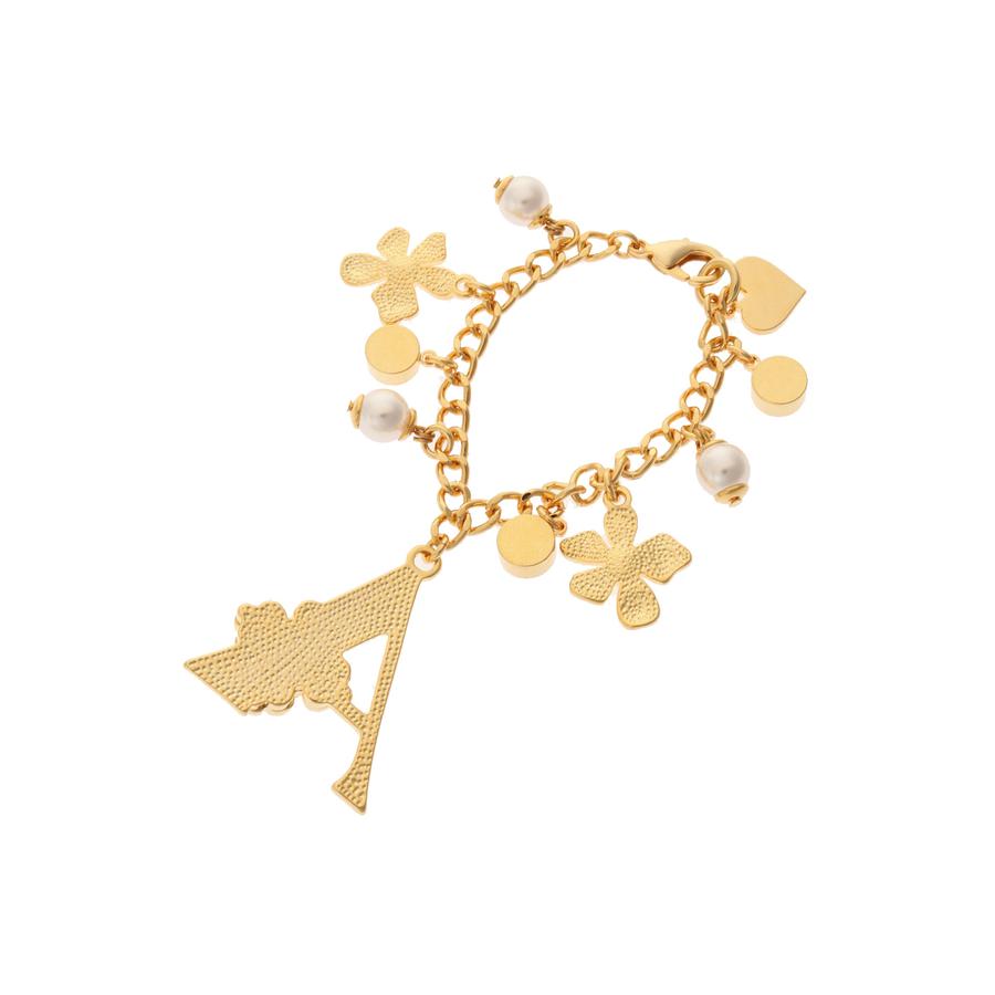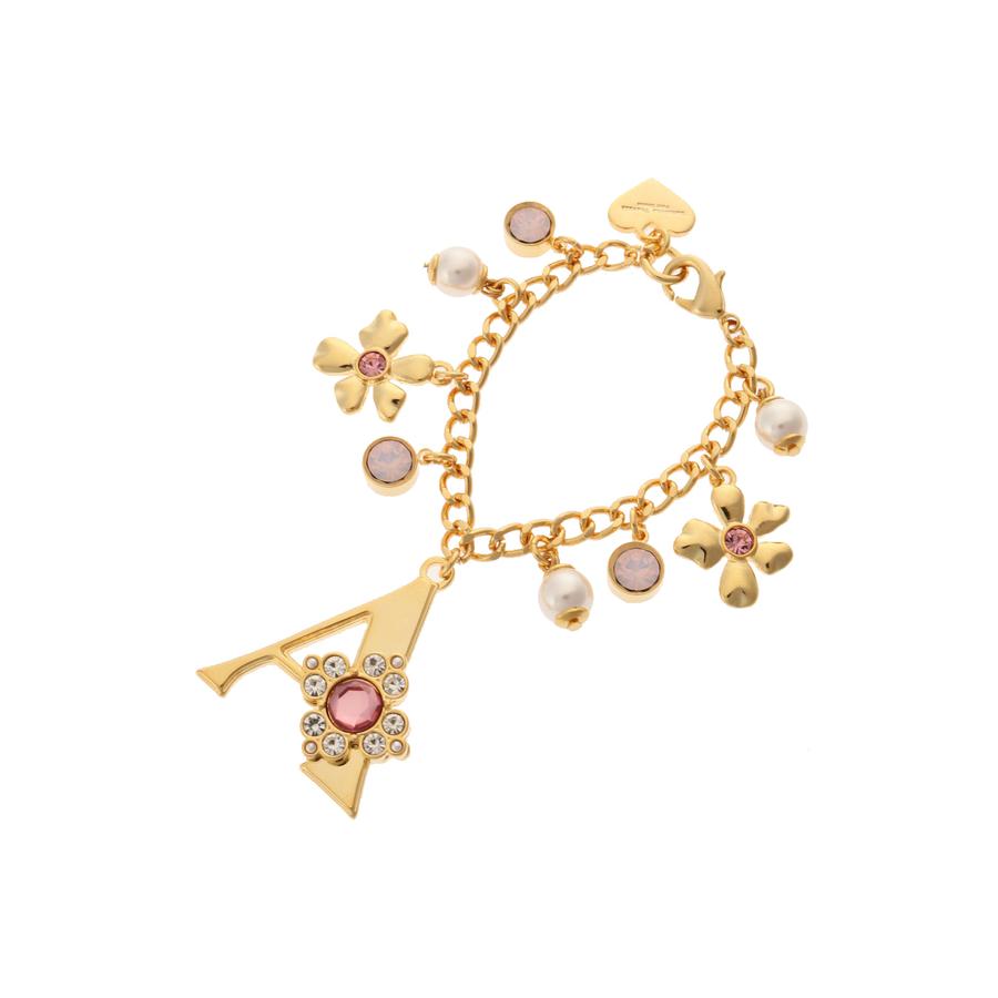 イニシャルによってストーンのカラーが違うのもポイントです。どのデザインのバッグにもマッチするようにゴールドベースで仕上げているので、通年使っていただけるデザインです。